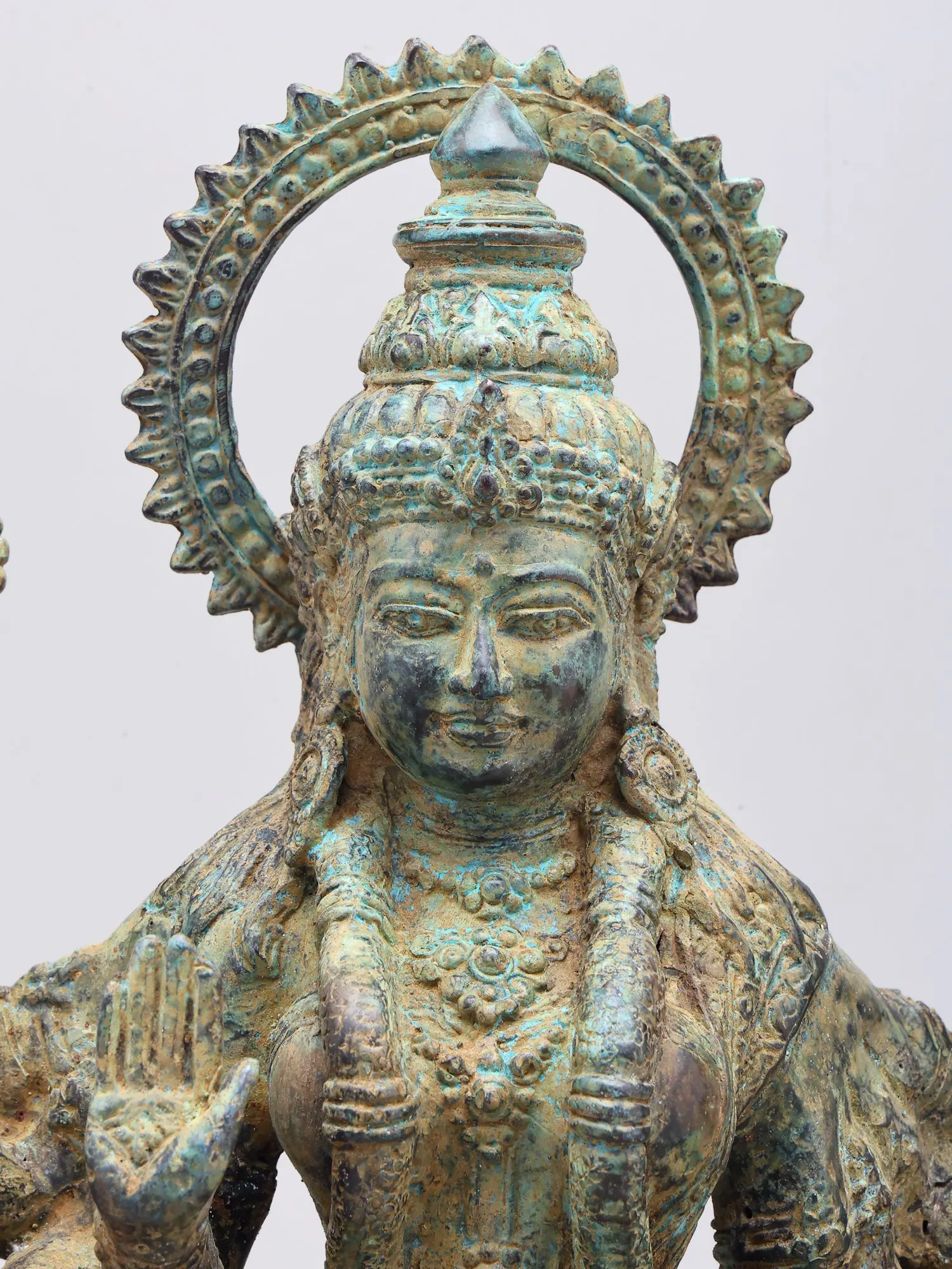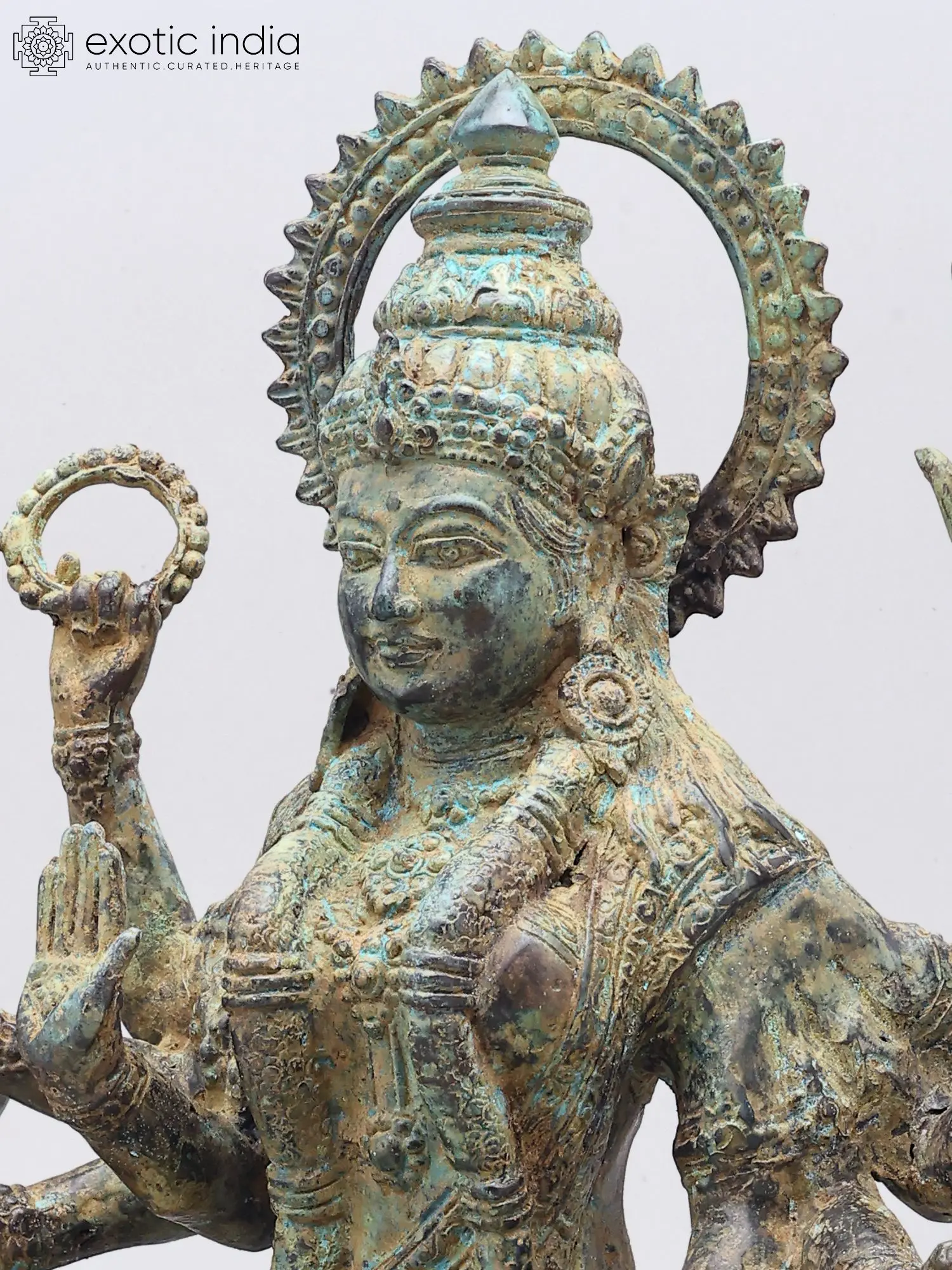 An antique patina finish enhances the visual appeal and timeless quality of this brass deity.
