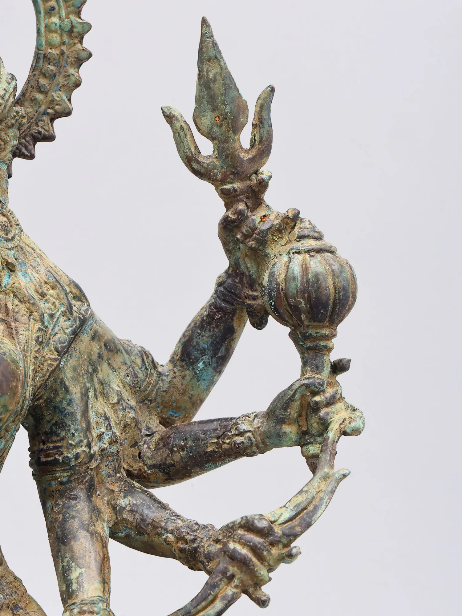 You'll be captivated by the intricate details, from the serene yet powerful expression of the Goddess to the majestic presence of her vahana, Nandi, the sacred bull. Each of her multiple arms, adorned with symbolic implements, tells a story of divine might and protective grace. The verdant patina, a result of the casting process, enhances the depth and richness of this commanding fifteen-inch artwork.