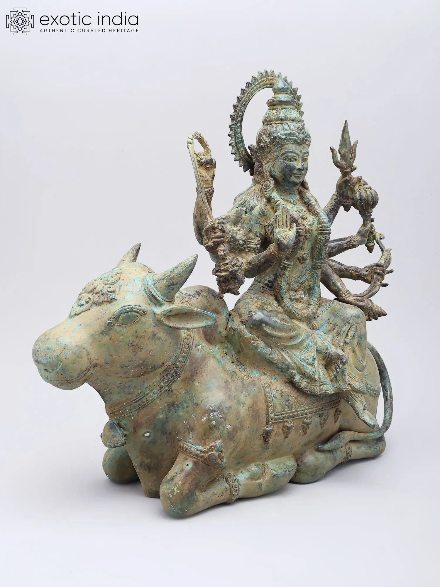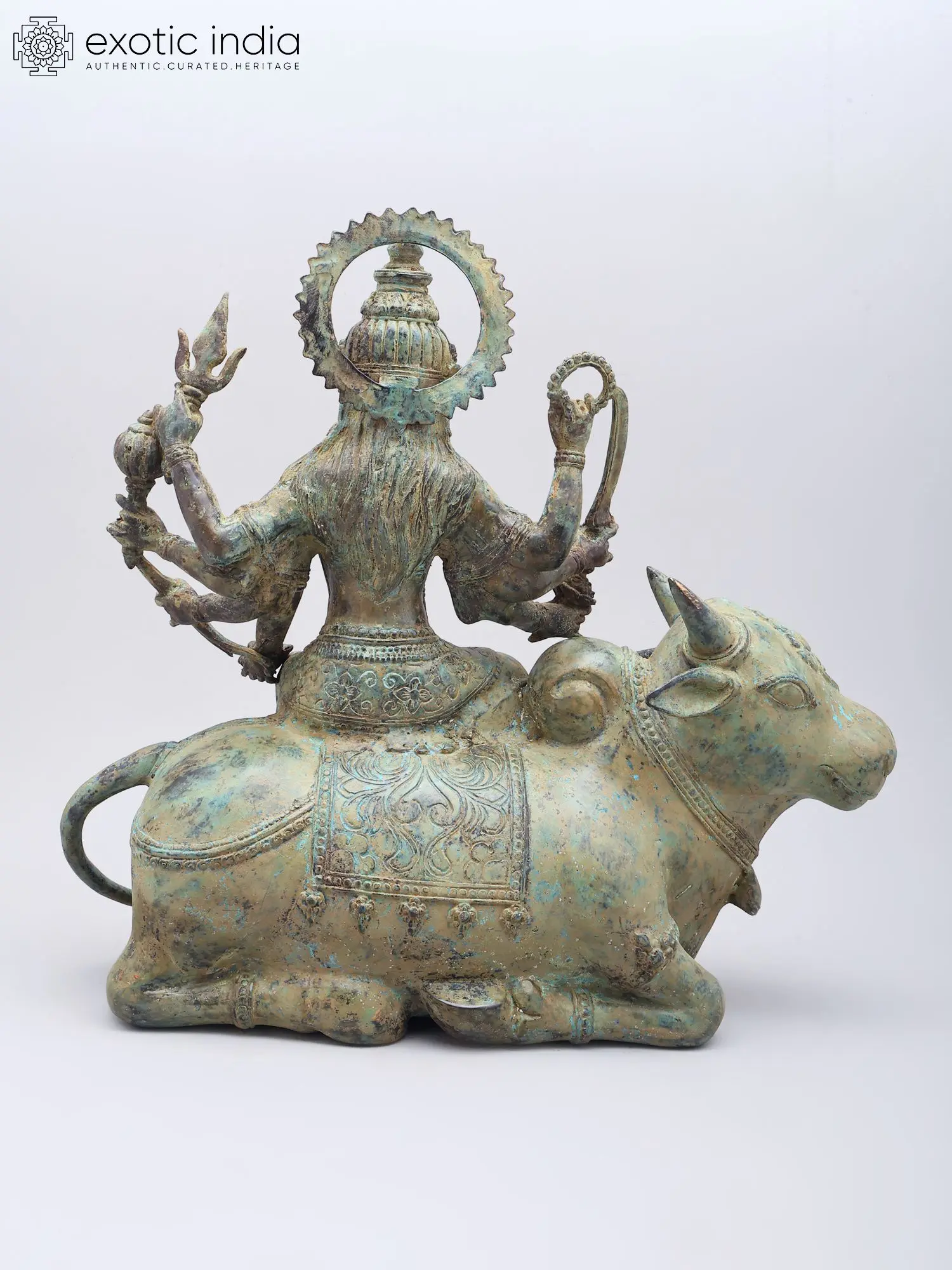 This brass statue features Goddess Durga, the divine mother, seated majestically on her vahana, Nandi.