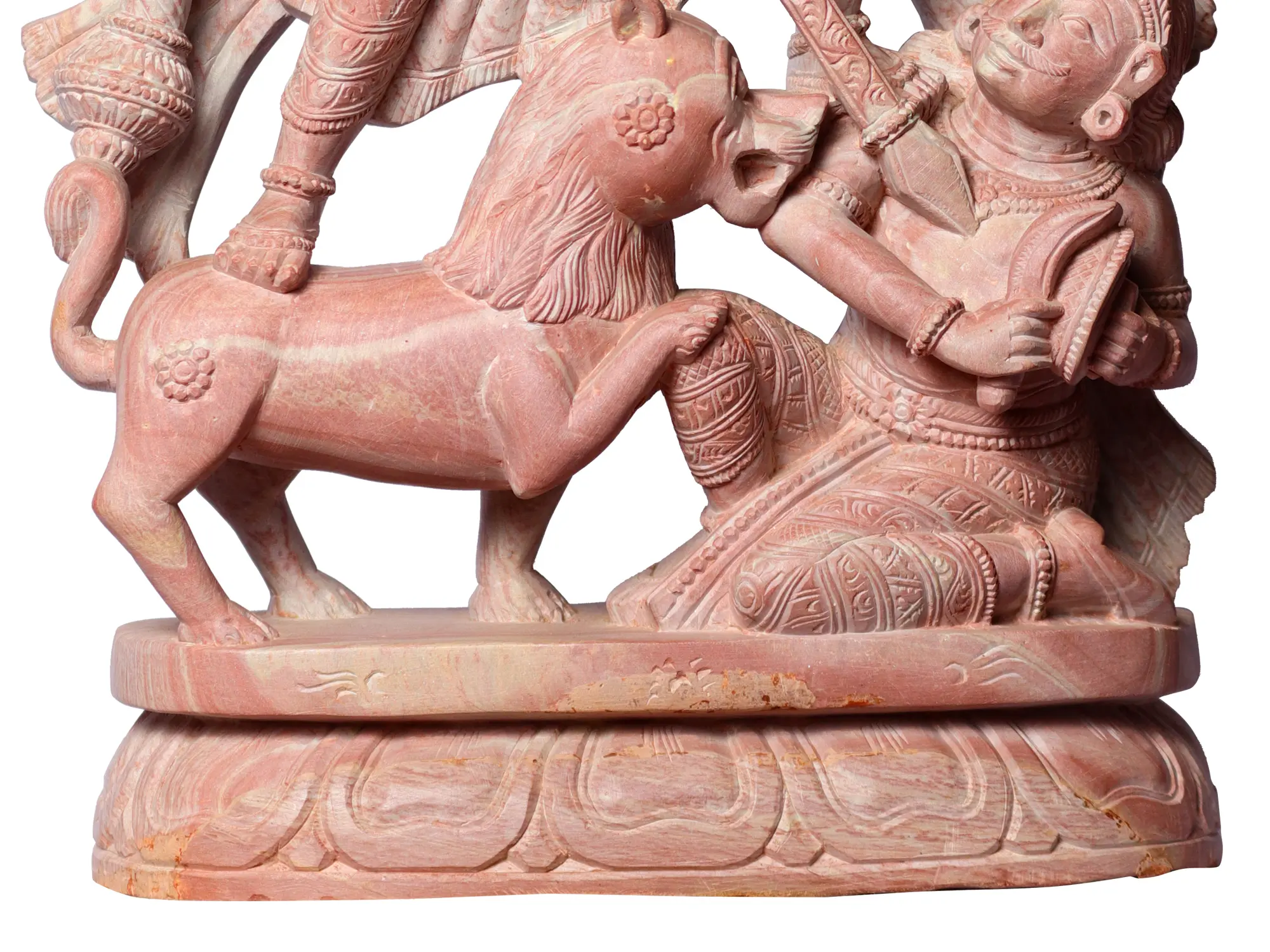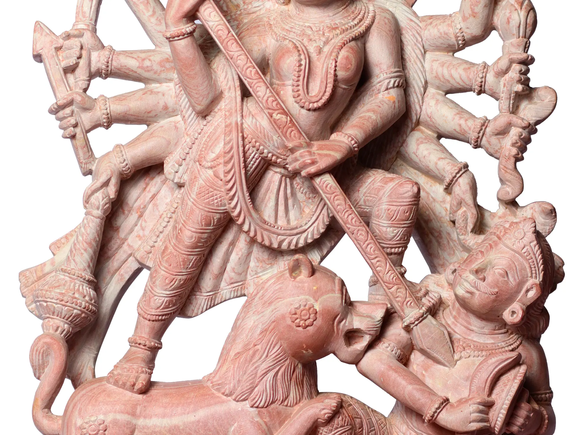 In whom lies the concentrated powers of all the Devas combined, Devi Durga whose Simha\Singha-Vahini (rides a lion) is the primordial cosmic energy - Shakti. Waging battle against the shape-shifting buffalo demon - Mahishasura, Devi in all her fury strikes at the demon to slay it with the thrust of her Trishula as Dashambhujadharini - at whose feet lies the slain body of evil principles, she came to be known as Mahishasur-Mardini for the same reason. In the bent of Tribhanga, she’s reminder to the fact that nothing is dainty about the fierce divine feminine.