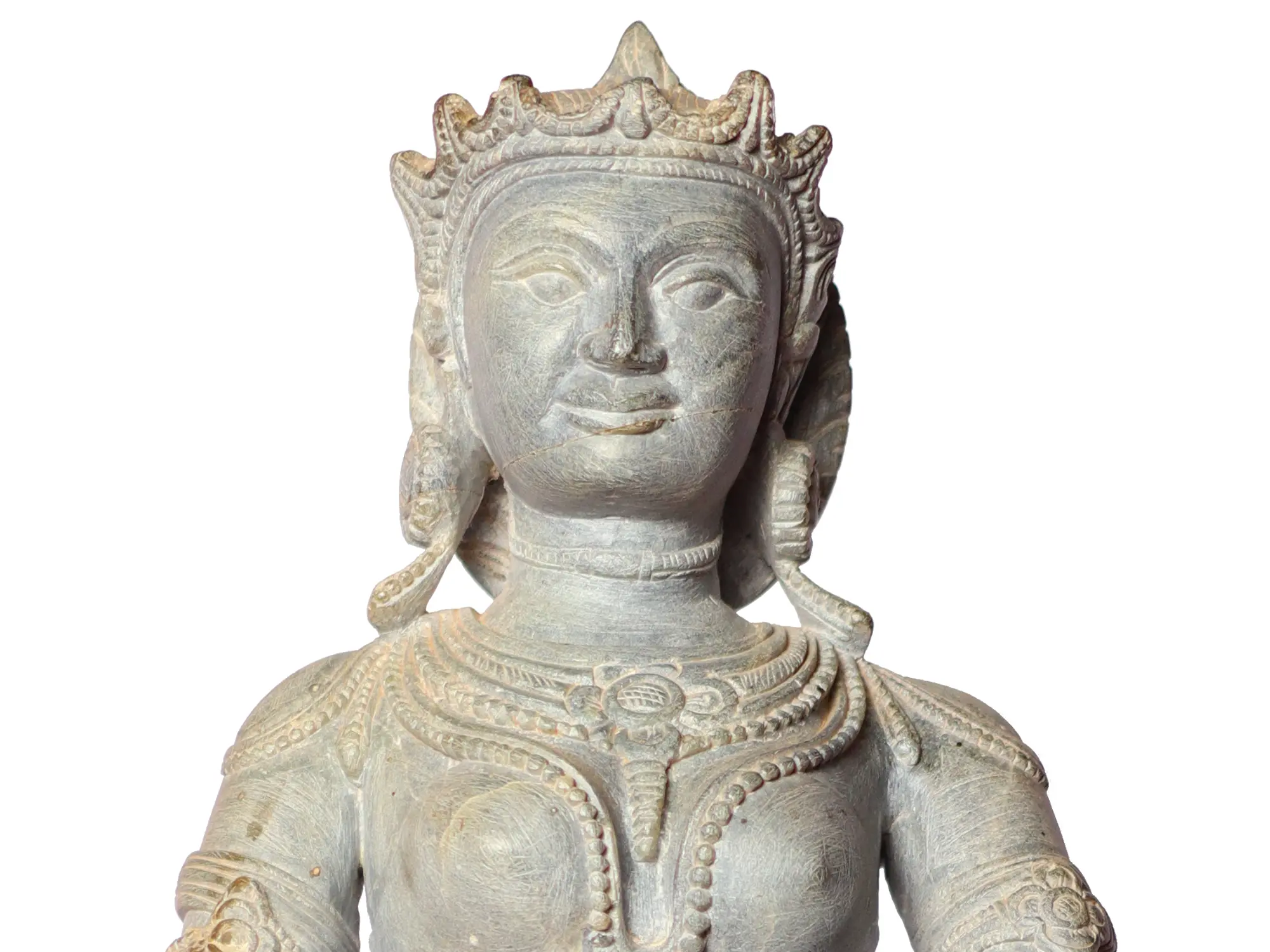 This exquisite stone sculpture captures the essence of devotion and the divine in motion. Carved from fine Odisha stone, renowned for its durability and ability to hold intricate detail, this piece embodies a devotional dancer in a moment of graceful offering. The artist's skilled hands have brought the stone to life, imbuing the figure with a sense of spiritual presence that resonates across centuries. The figure stands poised, adorned in elaborate jewelry and flowing garments. Every line and curve speaks of the artist's dedication, from the finely rendered facial features, hinting at a serene countenance, to the delicate draping of the fabric and the meticulously crafted ornaments that adorn her arms and ankles. Her posture suggests a narrative, a story whispered through the language of dance, a form deeply intertwined with the worship of deities in Indian tradition.