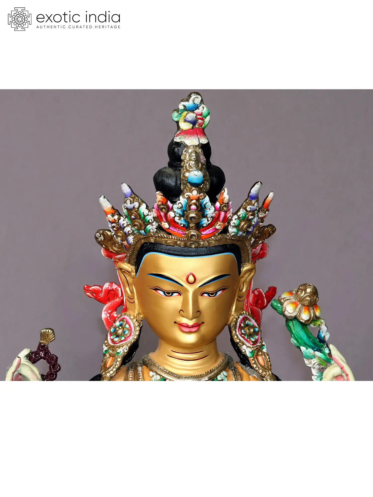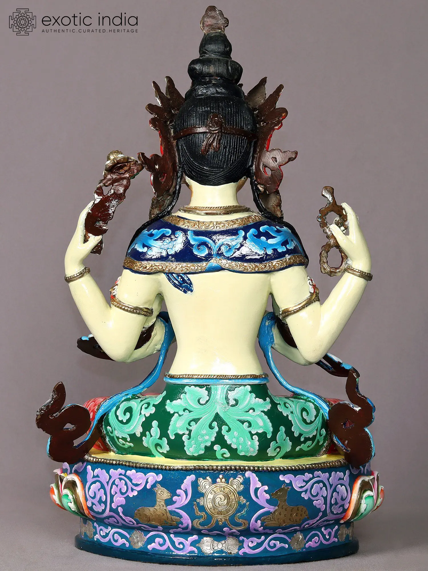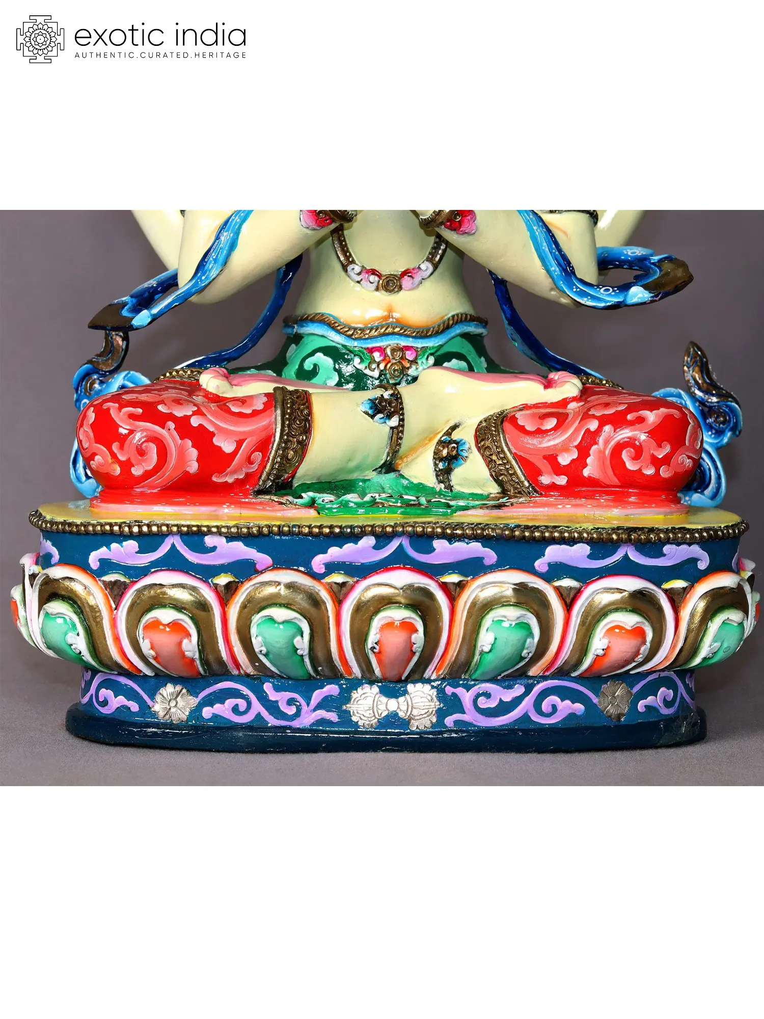 Two of his four arms are united in a prayerful gesture, clasping the red wish-fulfilling gem. In one of his left hands, he gracefully holds a colorful lotus flower, while in the other right hand, he possesses a crystal mala (rosary) used for counting mantra repetitions. Draped in the silken attire and embellishments befitting a Bodhisattva, these symbols represent his unique attributes. The four arms symbolize his embodiment of the four immeasurable qualities: kindness, love, joy, and equanimity. Seated upon a moon disc atop a lotus pedestal, his divine presence reflects total purity.