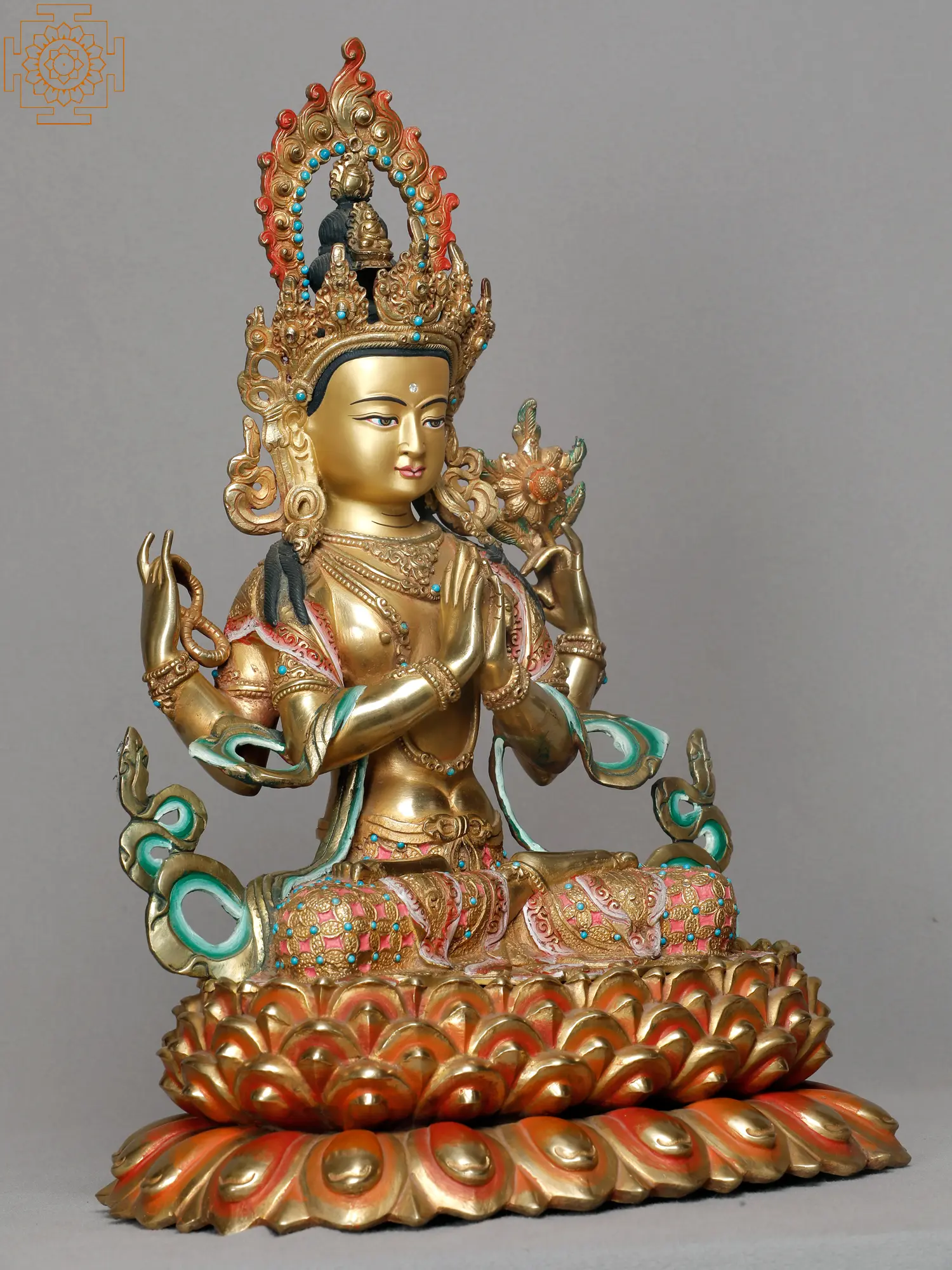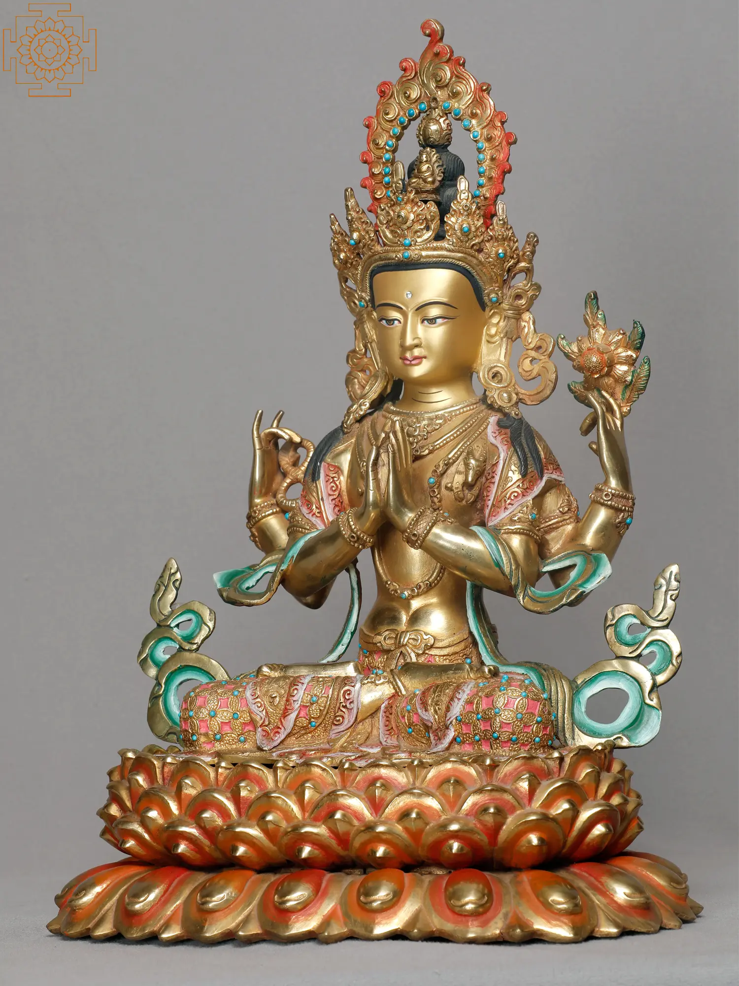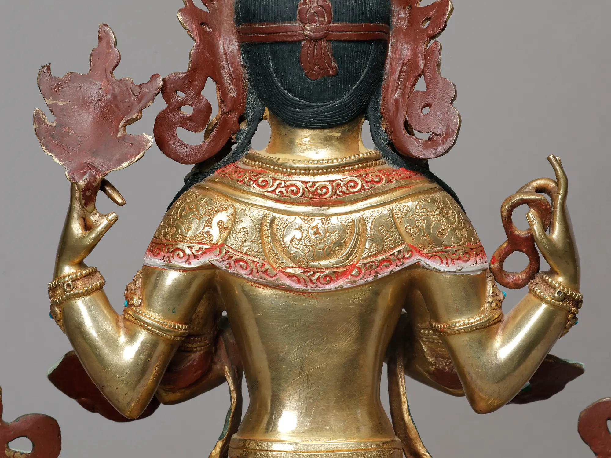 Behold the embodiment of compassion and enlightened wisdom with this breathtaking 15-inch Kharchari idol, meticulously crafted in Nepal. Fashioned from high-quality copper and adorned with lustrous gold gilding, this statue is more than a mere decorative piece; it is a gateway to spiritual contemplation and a testament to the rich artistic heritage of the Himalayas. The radiant gold finish evokes a sense of divine presence, while the intricate details speak of the profound devotion poured into its creation.