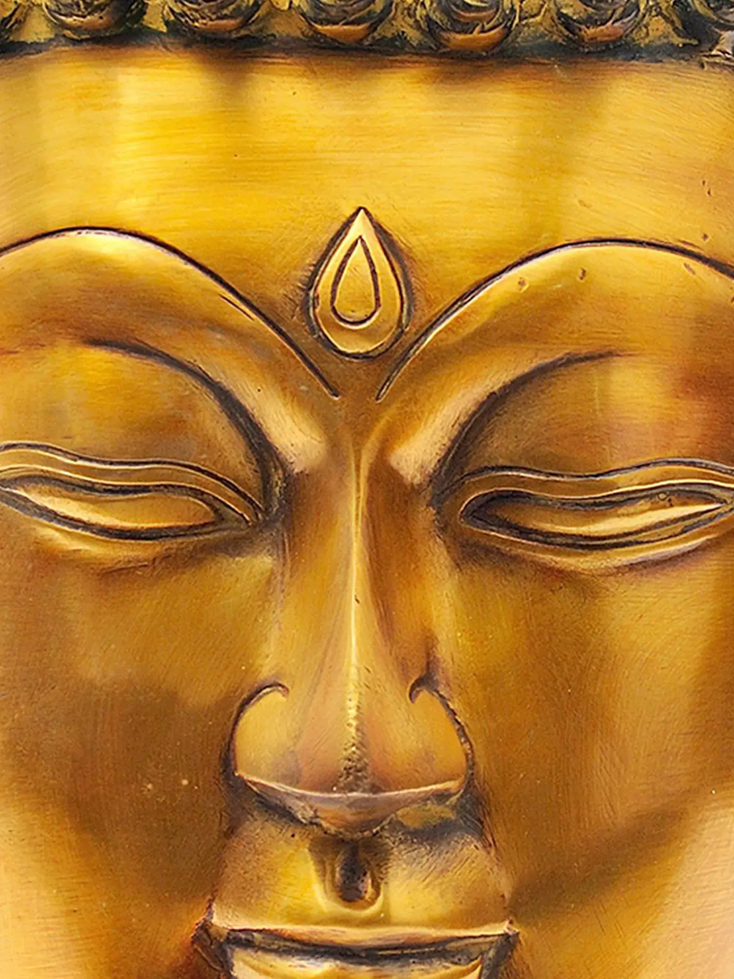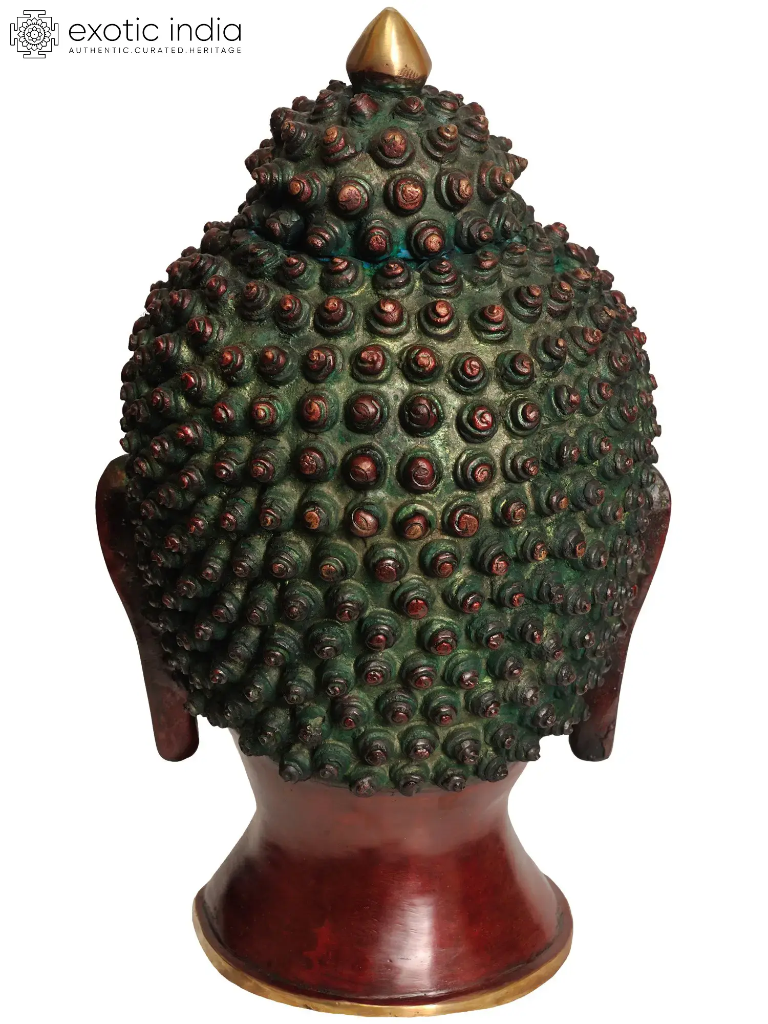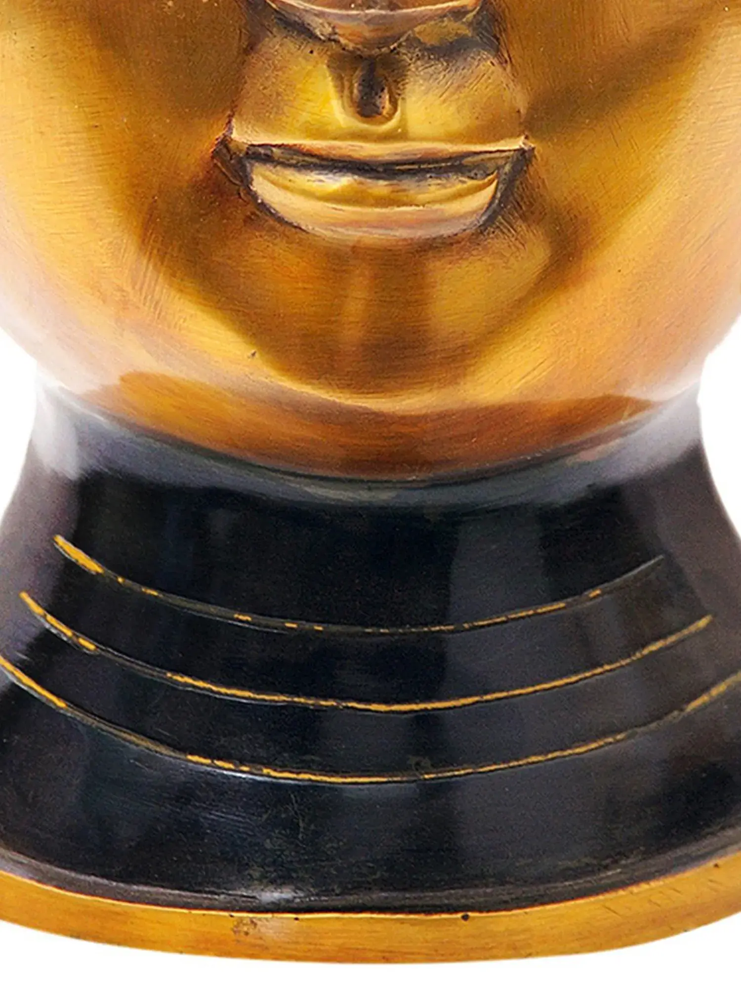 This magnificent Large Size Lord Buddha Head in Brass is a testament to artistry and spirituality. Meticulously handmade, it boasts a stunning lacquer finish in a harmonious blend of gold and dark brown. The golden face symbolizes grace and wisdom, inviting tranquility and enlightenment. The Buddha's serene countenance, eyes half-closed in deep contemplation, exudes an aura of inner peace. The intricate detailing of snail-like circular dots in the Buddha's locks adds a touch of elegance and authenticity. This brass masterpiece not only captivates the eye but also resonates with the soul, serving as a profound representation of serenity and enlightenment.