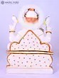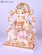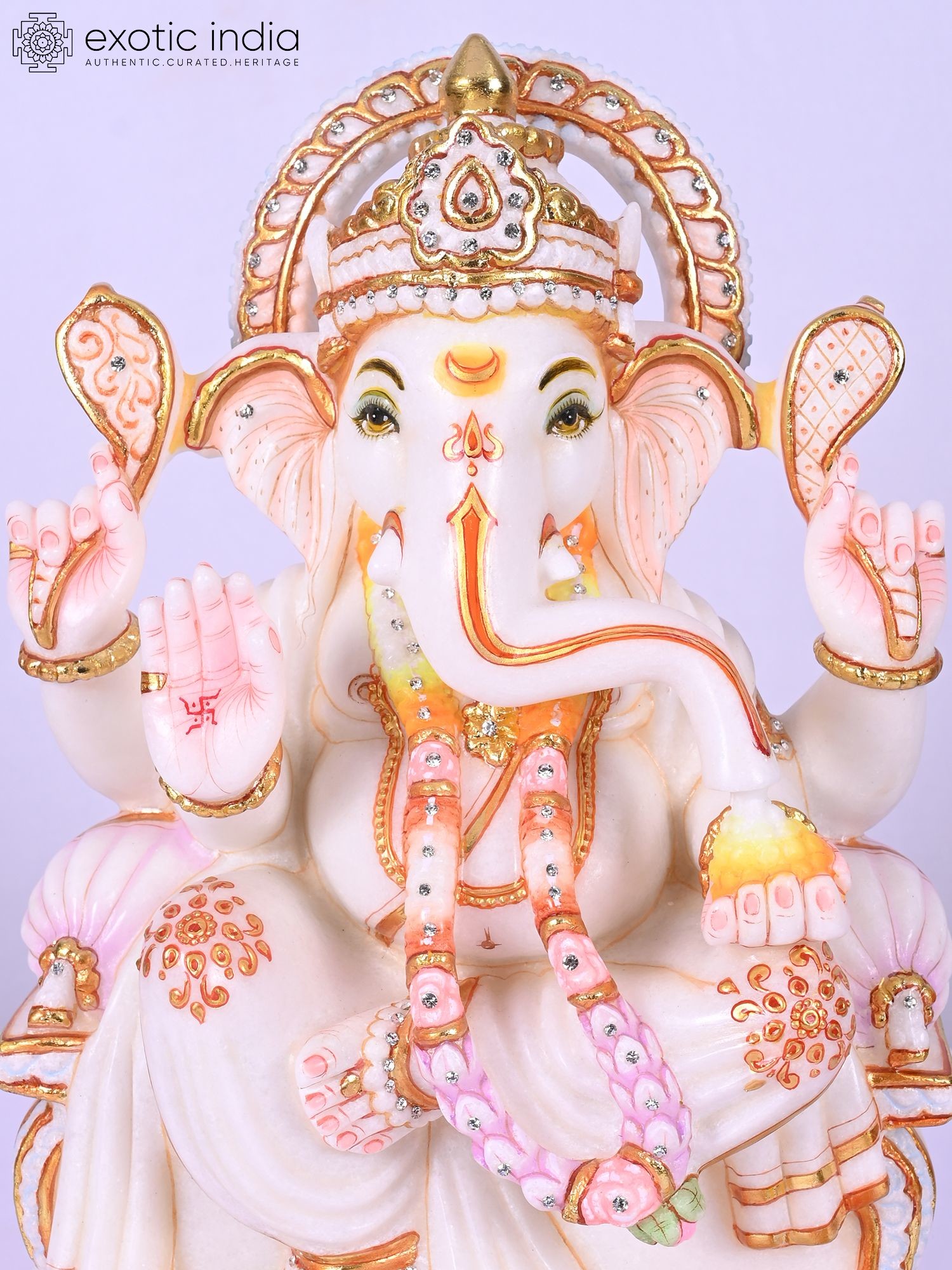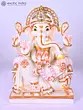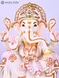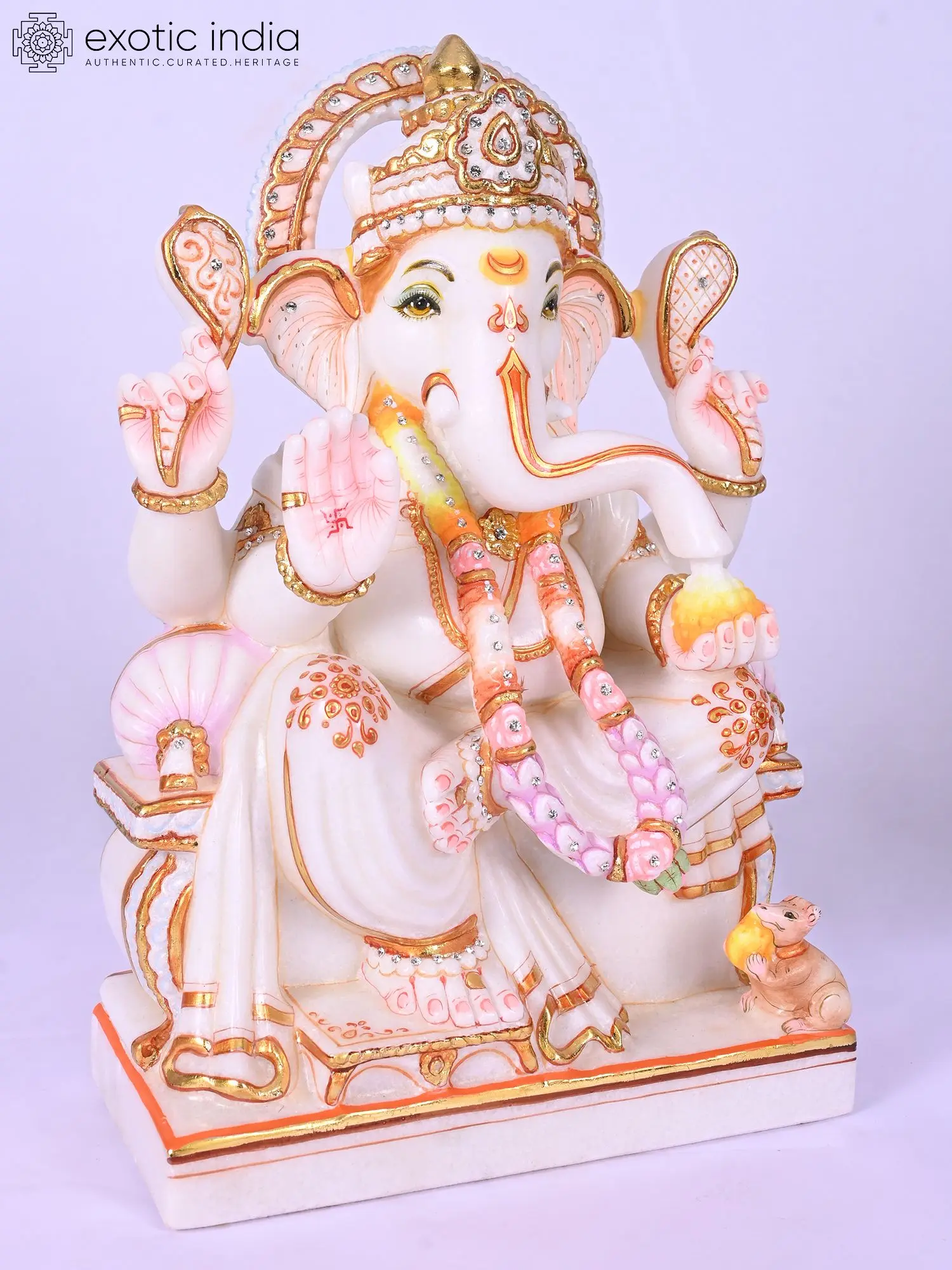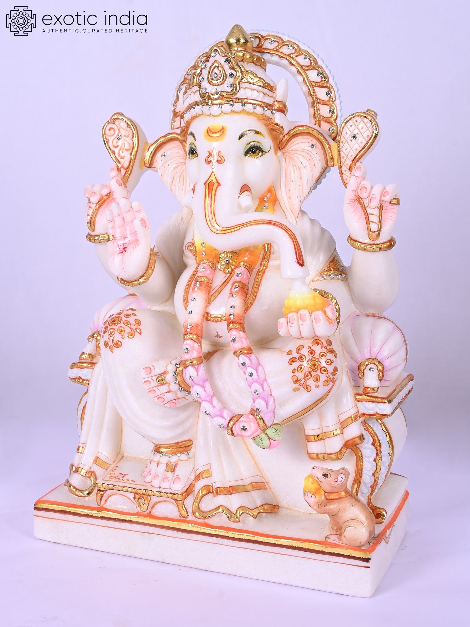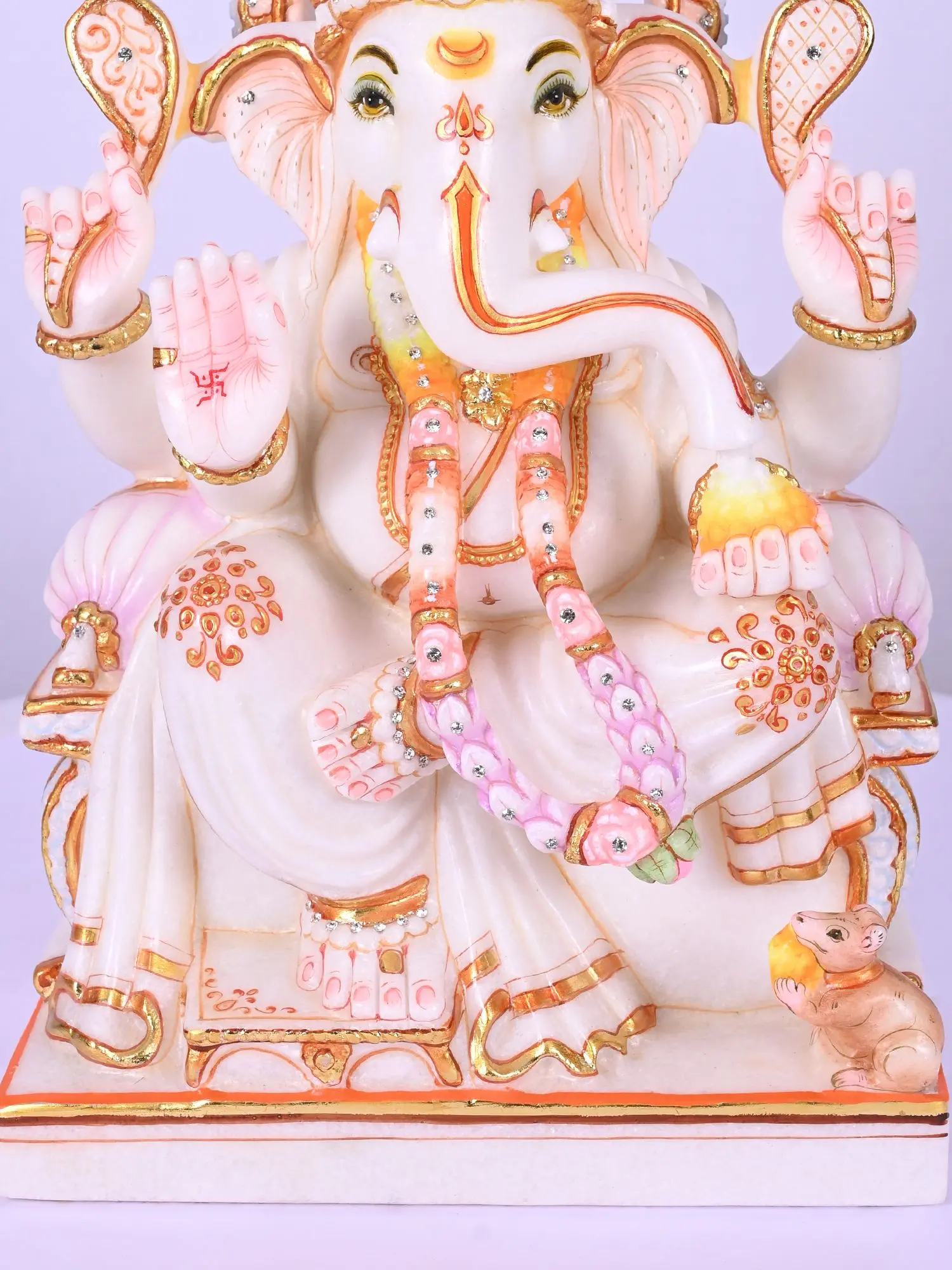 Observe the captivating details that draw you in; the serene expression, the gentle posture, and the symbolic motifs adorning the figure. Delicate floral patterns, accented with shimmering stones, grace the flowing robes, while intricate gold detailing adds a touch of regal splendor. The auspicious 'swastika' symbol, a sacred emblem of well-being, is subtly yet prominently featured, along with the humble form of a mouse, the divine vehicle, adding a charming contrast to the grandeur.