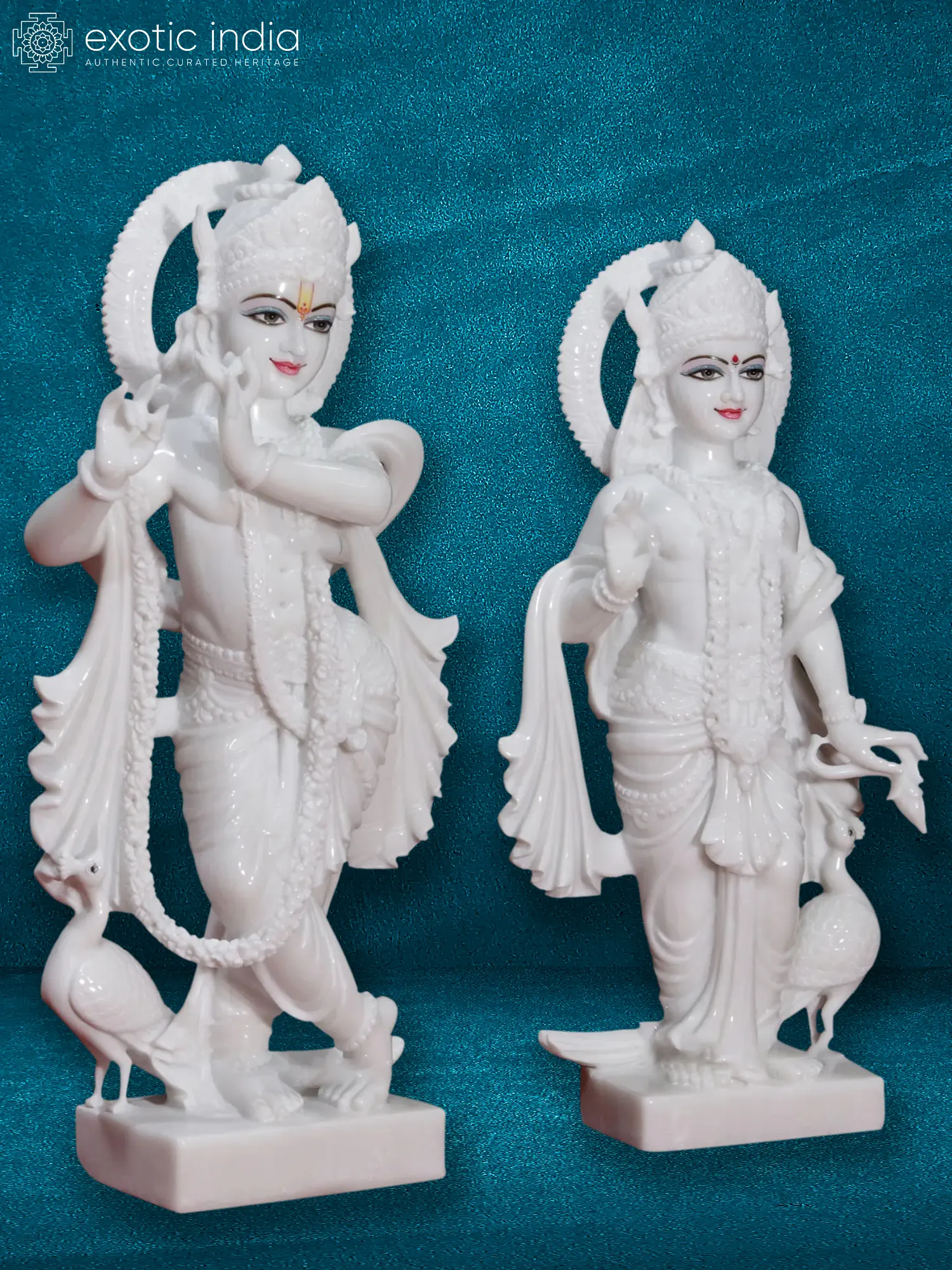 24" Pair Of Radha Krishna With Peacock Vietnam Marble Statue | Hand Carved Statue For Temple