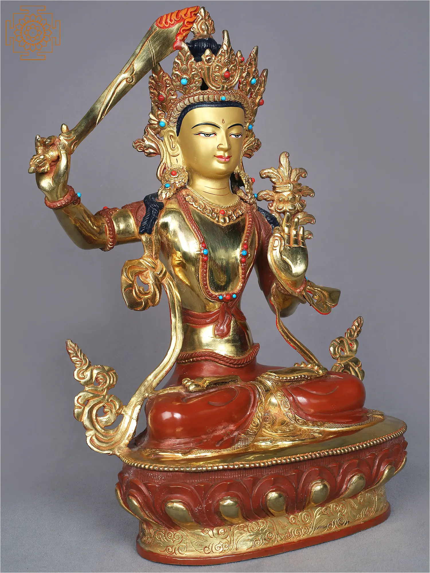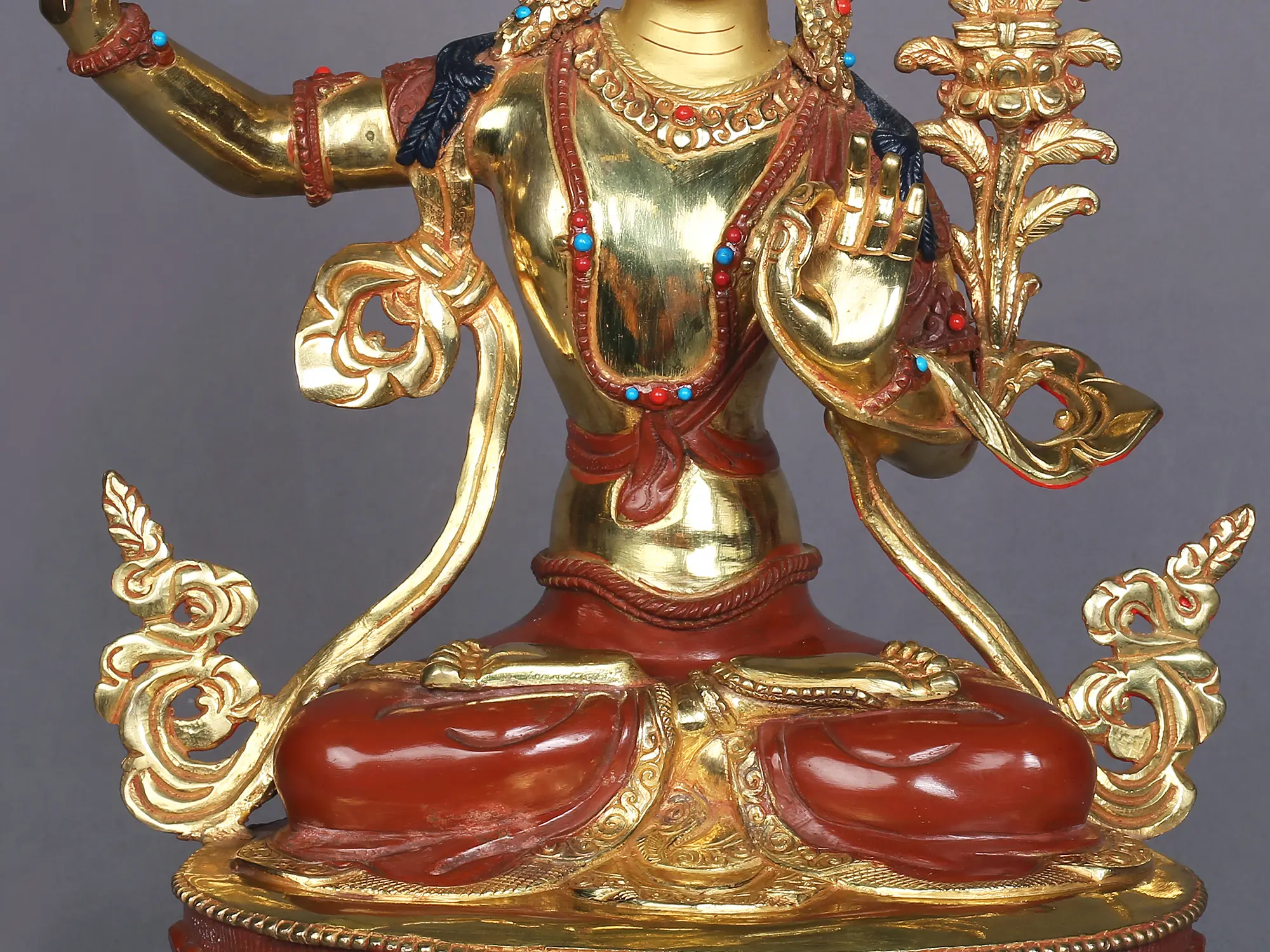 Manjushri seated in a posture of grace and poise, holding the Prajnaparamita scripture, representing the perfection of wisdom. His teachings emphasize the transformative power of understanding and insight, guiding practitioners on the journey to awakening.