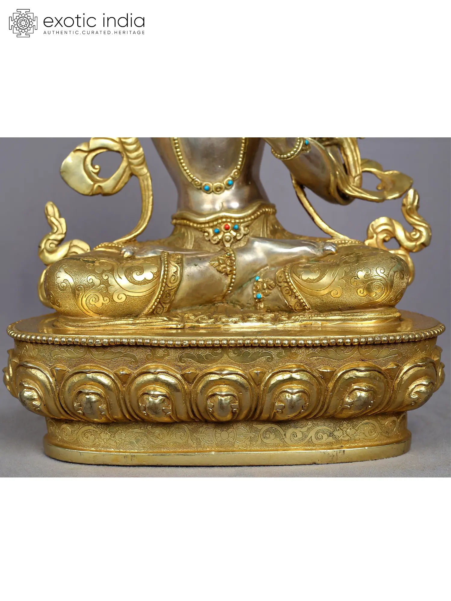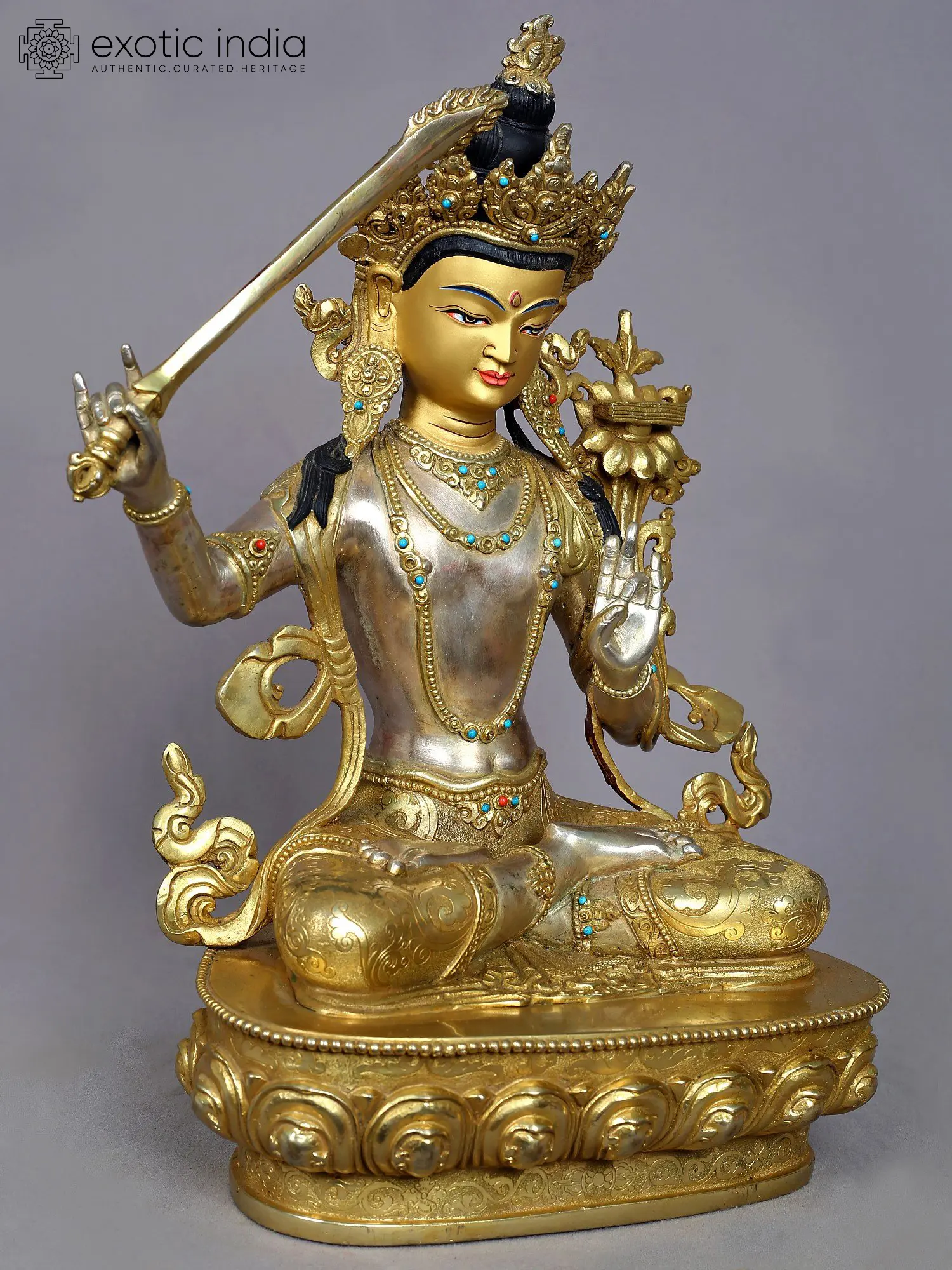 Manjushri is depicted in a classic Prajnaparamita form, with a double-edged flaming sword in his right hand and a lotus flower holding the Prajnaparamita sutra (Great Wisdom) scripture in his left. He can be seen seated on a lotus flower atop a moon disc.