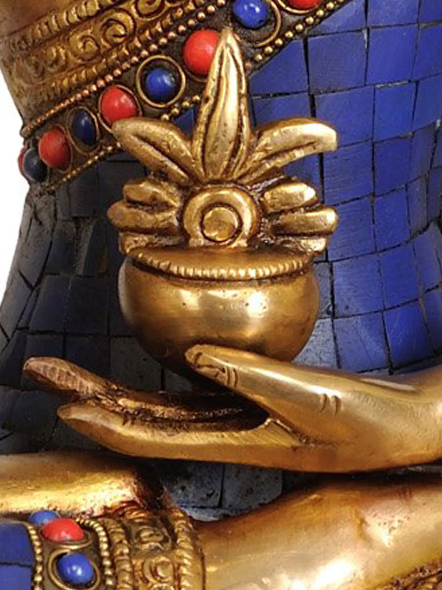 The posture of the Medicine Buddha is significant. He is seated in the vajra posture, a symbol of stability and enlightenment, with his legs crossed in a meditative pose. His left hand rests in his lap, palm upwards, in the gesture of meditation (dhyana mudra), often holding a bowl of medicinal herbs. His right hand, resting on his right knee, is in the gesture of bestowing boons or healing (varada mudra), with the palm facing outward, symbolizing his readiness to grant healing and blessings. The intricate detailing of his robes, adorned with vibrant blue and red inlays, not only enhances the visual appeal but also symbolizes the richness of his compassion and the various medicinal properties he embodies. The base of the statue, a lotus throne, is a universal symbol of purity and enlightenment, signifying that the Medicine Buddha's teachings arise from a pure and untainted source.