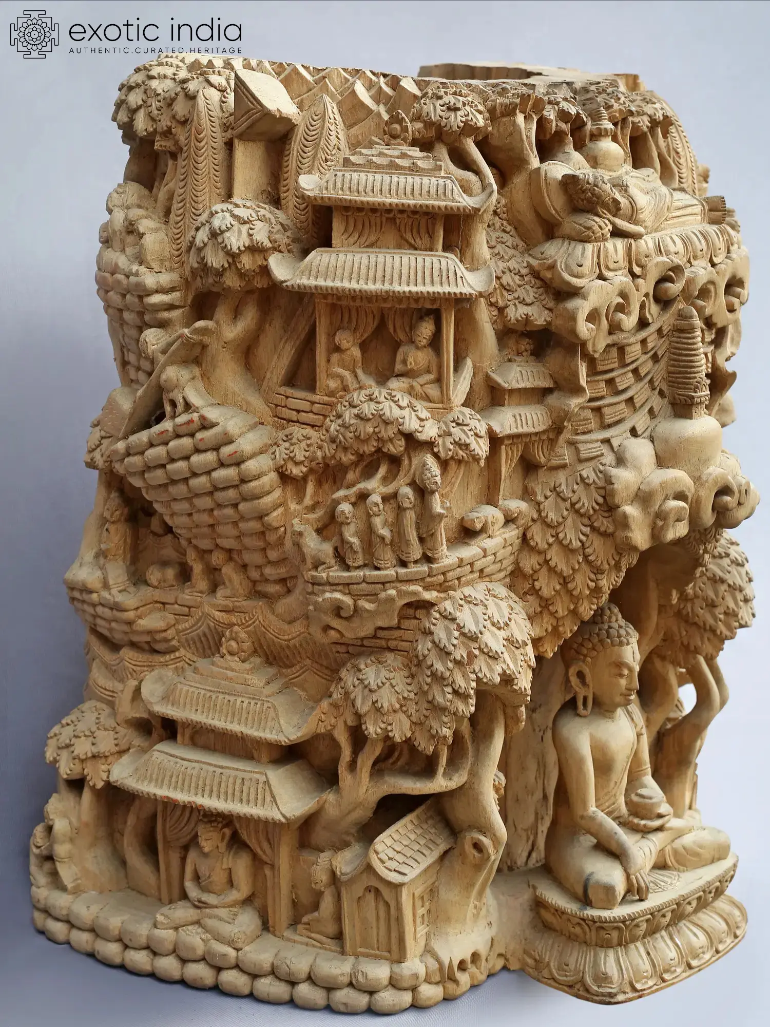 Surrounding the Medicine Buddha is a richly detailed tableau, a miniature universe of spiritual significance. The intricate carvings depict architectural elements reminiscent of ancient Nepalese monasteries and stupas, their tiered roofs and decorative motifs adding to the visual narrative. Lush trees with stylized foliage provide a naturalistic backdrop, suggesting the serene environment in which spiritual enlightenment is often sought. Within this landscape, subtle hints of other figures and narratives can be discerned, perhaps representing disciples or celestial attendants, all contributing to the overall sense of a sacred space. At the very top, a reclining figure, possibly signifying Parinirvana, further deepens the devotional aspect of the artwork, hinting at the Buddha's ultimate release from the cycle of rebirth.