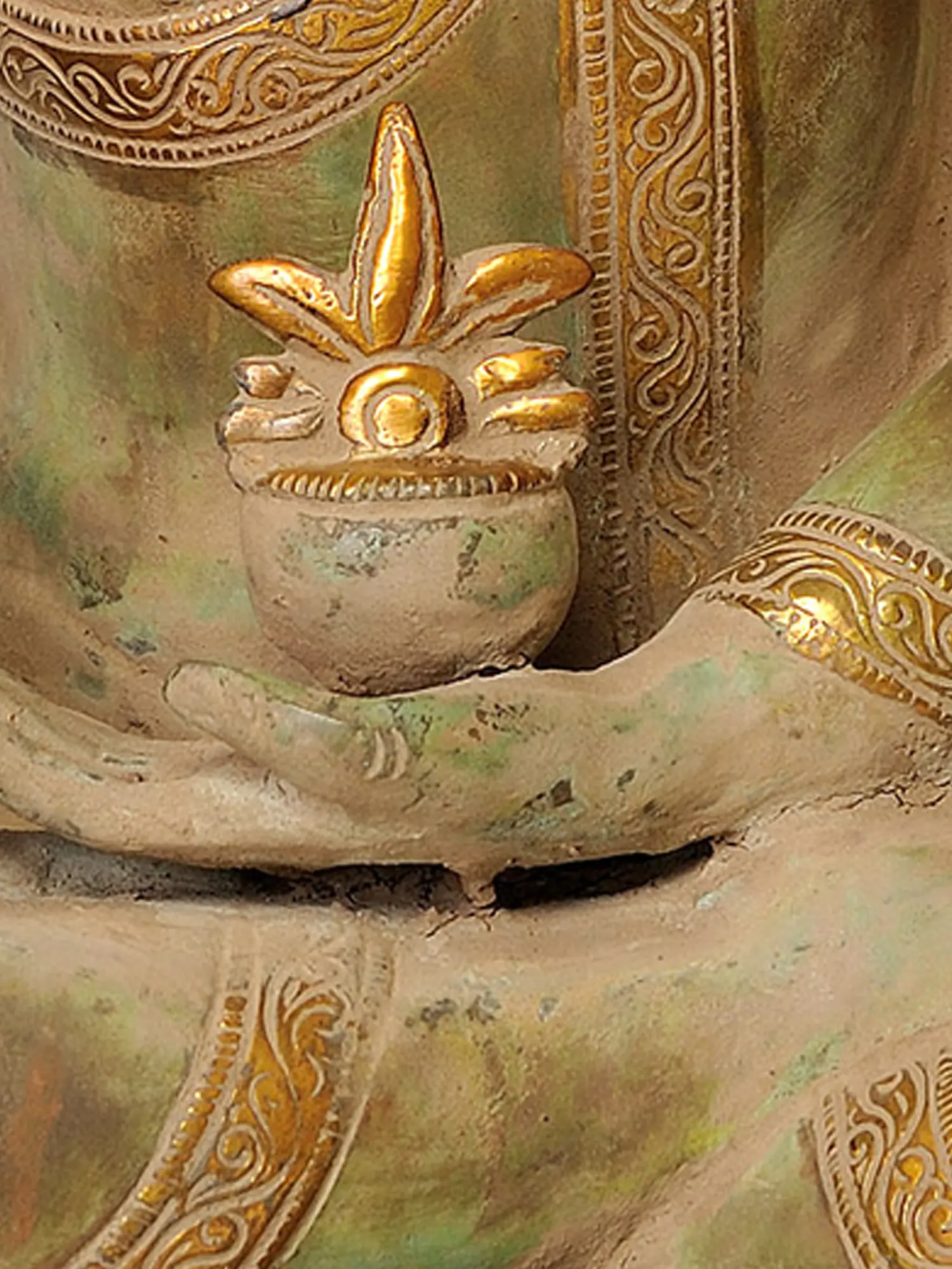 The Medicine Buddha is the manifestation of the healing power of all Buddhas, and his practice is dedicated to alleviating suffering, both physical and mental. Legend has it that the Medicine Buddha made twelve great vows, one of which was to heal all beings from illness and the causes of illness, including ignorance and attachment. In this statue, he holds a medicinal herb, often depicted as the Aruna flower, in his left hand, symbolizing his ability to cure diseases and grant long life. His right hand rests on his knee, palm facing outward, in the gesture of generosity (varada mudra), offering blessings and protection to all who seek his aid. This posture signifies his readiness to respond to the prayers and needs of sentient beings, dispelling fear and bestowing courage.