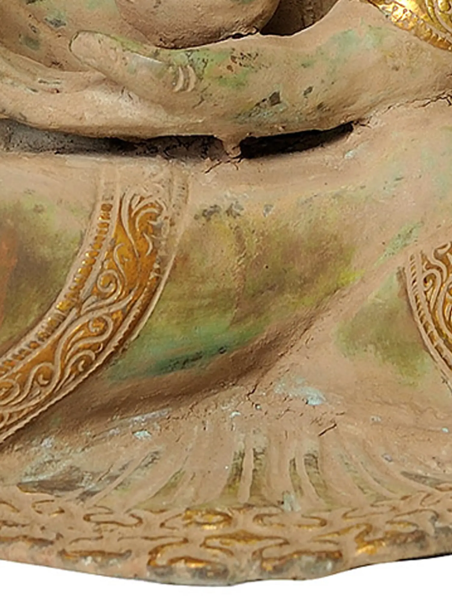 This exquisite brass sculpture captures the serene essence of the Medicine Buddha, Bhaisajyaguru, a revered deity in Tibetan Buddhism. In this profound representation, the Buddha is depicted in the traditional posture of meditation, seated gracefully with legs crossed, embodying tranquility and profound wisdom. The lustrous brass, with its subtle patina, lends an aura of ancient reverence to the deity, making it a focal point of spiritual contemplation and aesthetic delight. Each intricate detail, from the gentle curve of his lips to the urna on his forehead, speaks to the meticulous craftsmanship that has gone into its creation, a testament to the enduring artistic traditions of India.