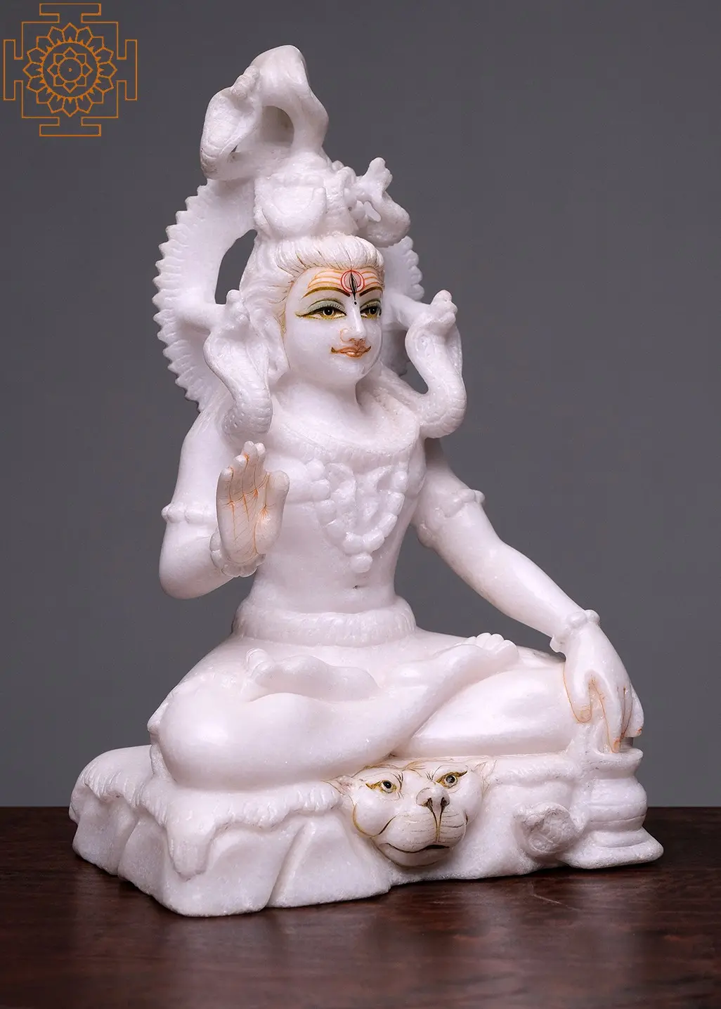 This exquisite hand-carved statue captures Lord Shiva, the destroyer and transformer, in a moment of profound meditation. Seated serenely on the majestic Mount Kailasha, his divine abode, the deity embodies tranquility and ultimate cosmic power. Crafted from luminous white marble, the statue radiates an aura of purity and spiritual sanctity, making it a captivating centerpiece for any sacred space or a cherished addition to your collection. The artistry of this sculpture is evident in every meticulously rendered detail. Lord Shiva is depicted in his iconic yogic posture, a symbol of inner peace and mastery over the self. His serene face, adorned with the third eye and the tilak, speaks of his omniscience and profound spiritual insight. The intricately carved snakes coiled around his neck and head symbolize his control over primal energies and his unique connection to the cosmos. The subtle, hand-painted accents on his eyes and tilak bring a lifelike quality to the divine visage, inviting contemplation and devotion.