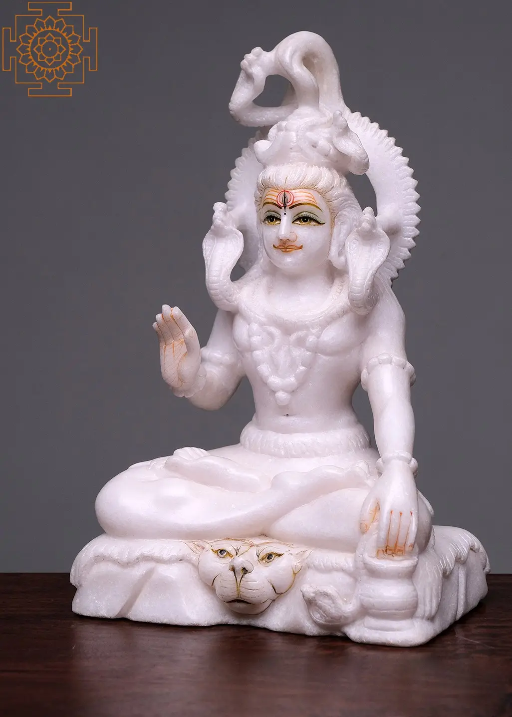 The white marble itself is significant, representing purity, divinity, and spiritual clarity. The act of carving such a divine form from this pristine material is a sacred undertaking. The statue's posture, with one hand raised in blessing or abhaya mudra (fearlessness), offers solace and reassurance to devotees. The presence of the snakes, particularly the cobra (Naga), is deeply symbolic in Hinduism, representing time, eternity, and the awakening of kundalini energy. The depiction of a lion's face beneath Shiva's seat further amplifies his power and sovereignty, as he is often depicted as the ultimate conqueror, the lord of all beings, and the destroyer of ego and ignorance. This statue is more than an object of art; it is a conduit for divine energy, a reminder of the transformative power of meditation, and a testament to the enduring devotion to Lord Shiva, the Mahadeva.