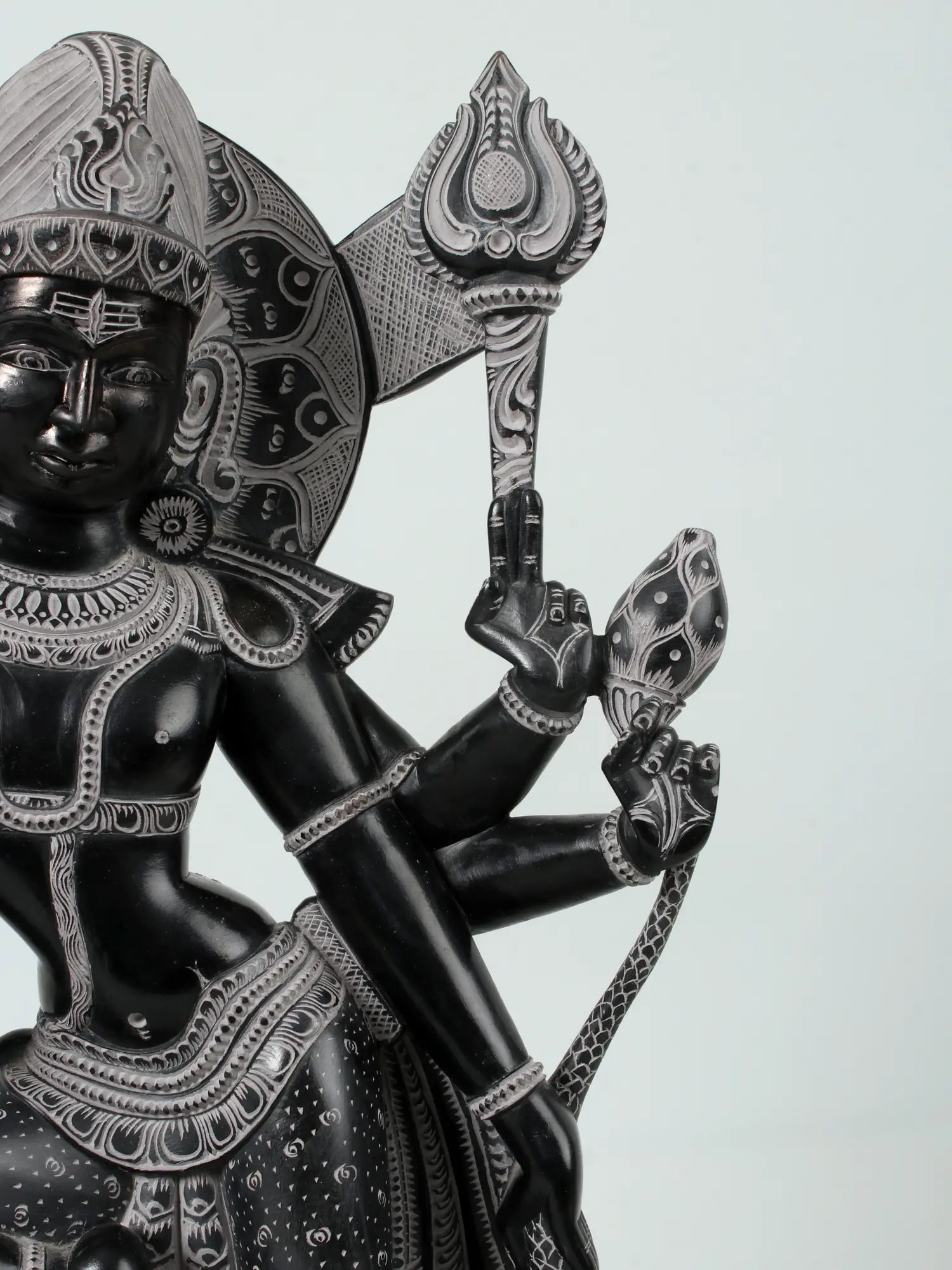 The only hint of wrath, however, is to be found in the Lord’s gaze. The rest of the divine form has been executed with soft lines and gentle curves. The deep black colour of Kadappa stone medium adds a sense of solemnity and sattvaguna to the iconography.