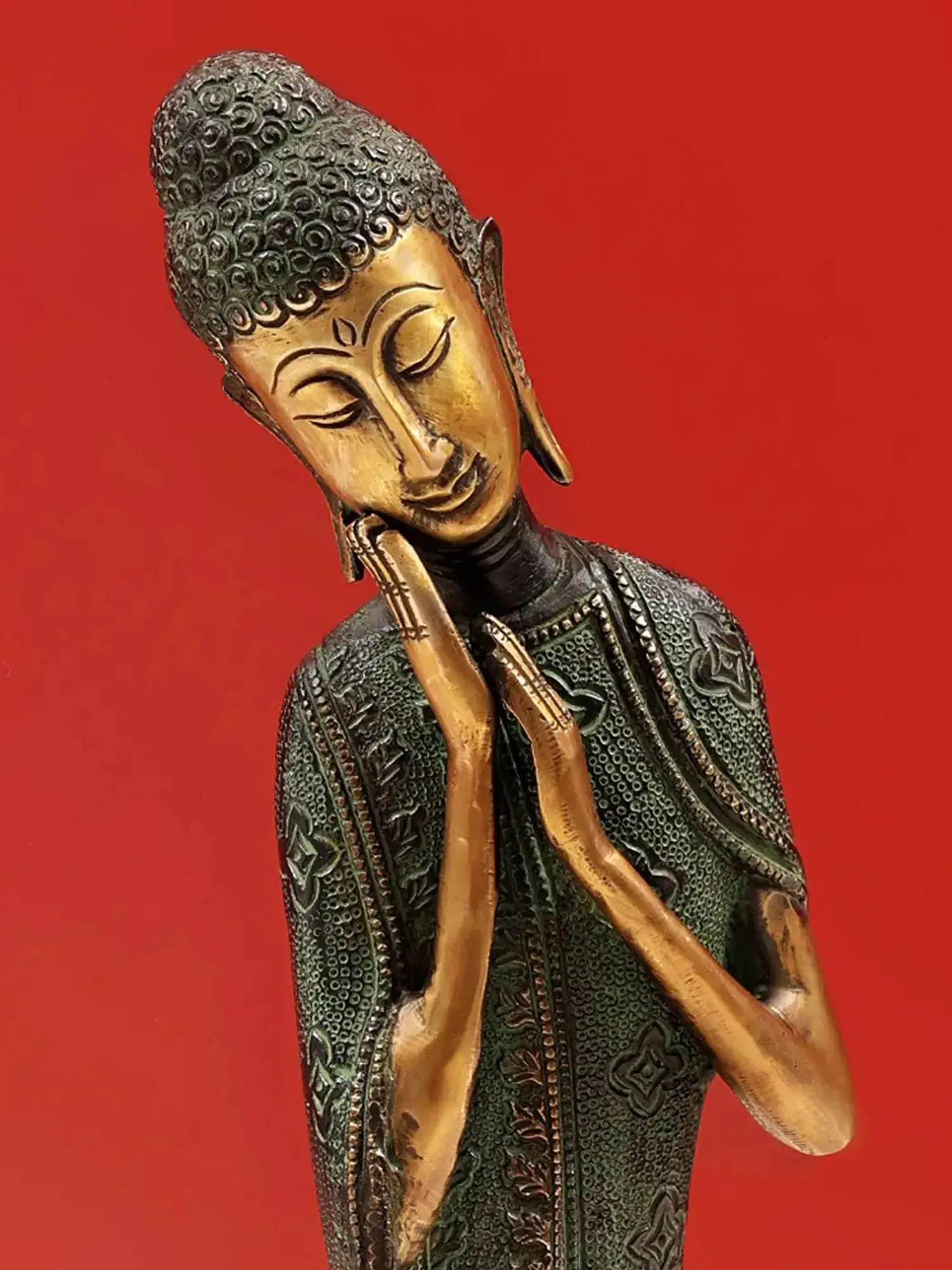 Delve into the contemplative world of the Thinking Buddha with this handcrafted brass sculpture, made with care in India. The Thinking Buddha, in Buddhist philosophy, represents deep introspection and mindfulness. This sculpture's serene expression and the posture of deep thought symbolise the journey within. It is a bestseller, perfect for those seeking spiritual growth and self-reflection. Enhance your meditation space with the presence of the Thinking Buddha, guiding you on your path to inner peace and enlightenment.