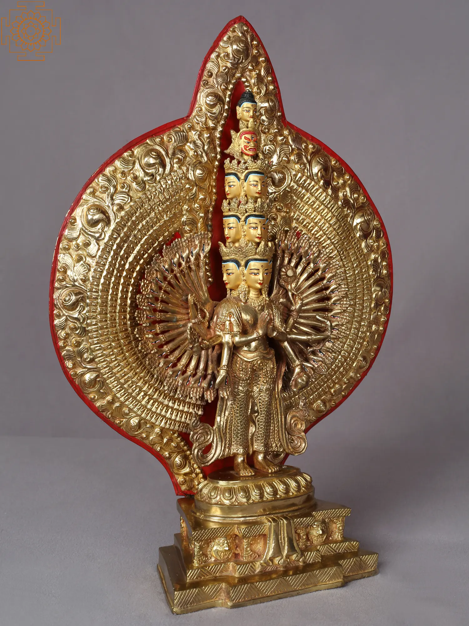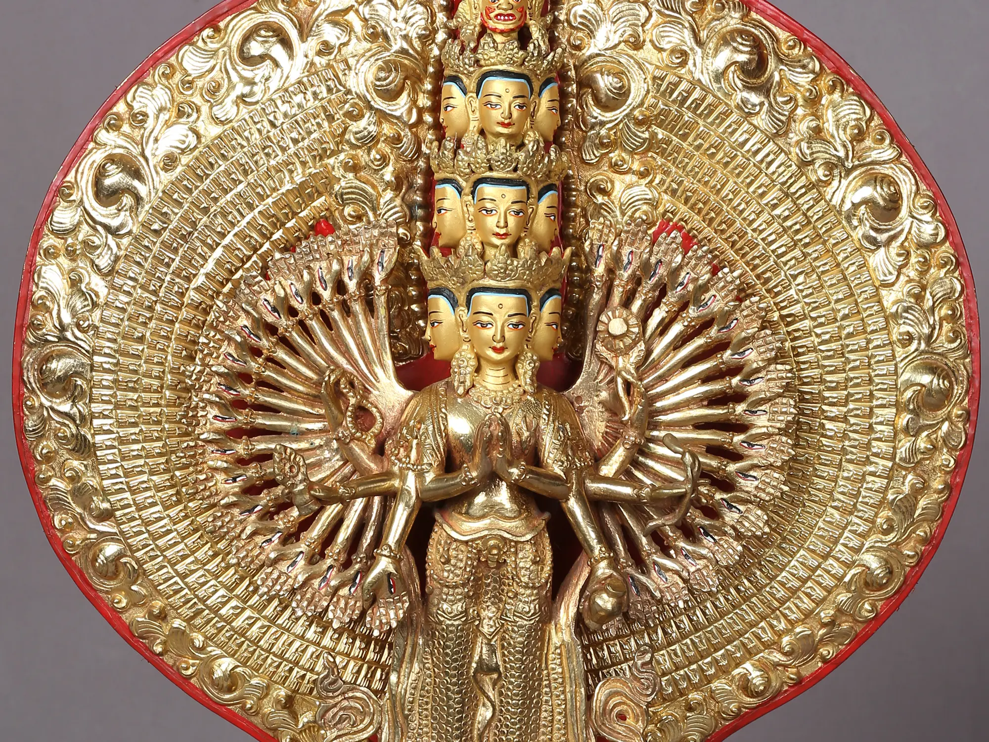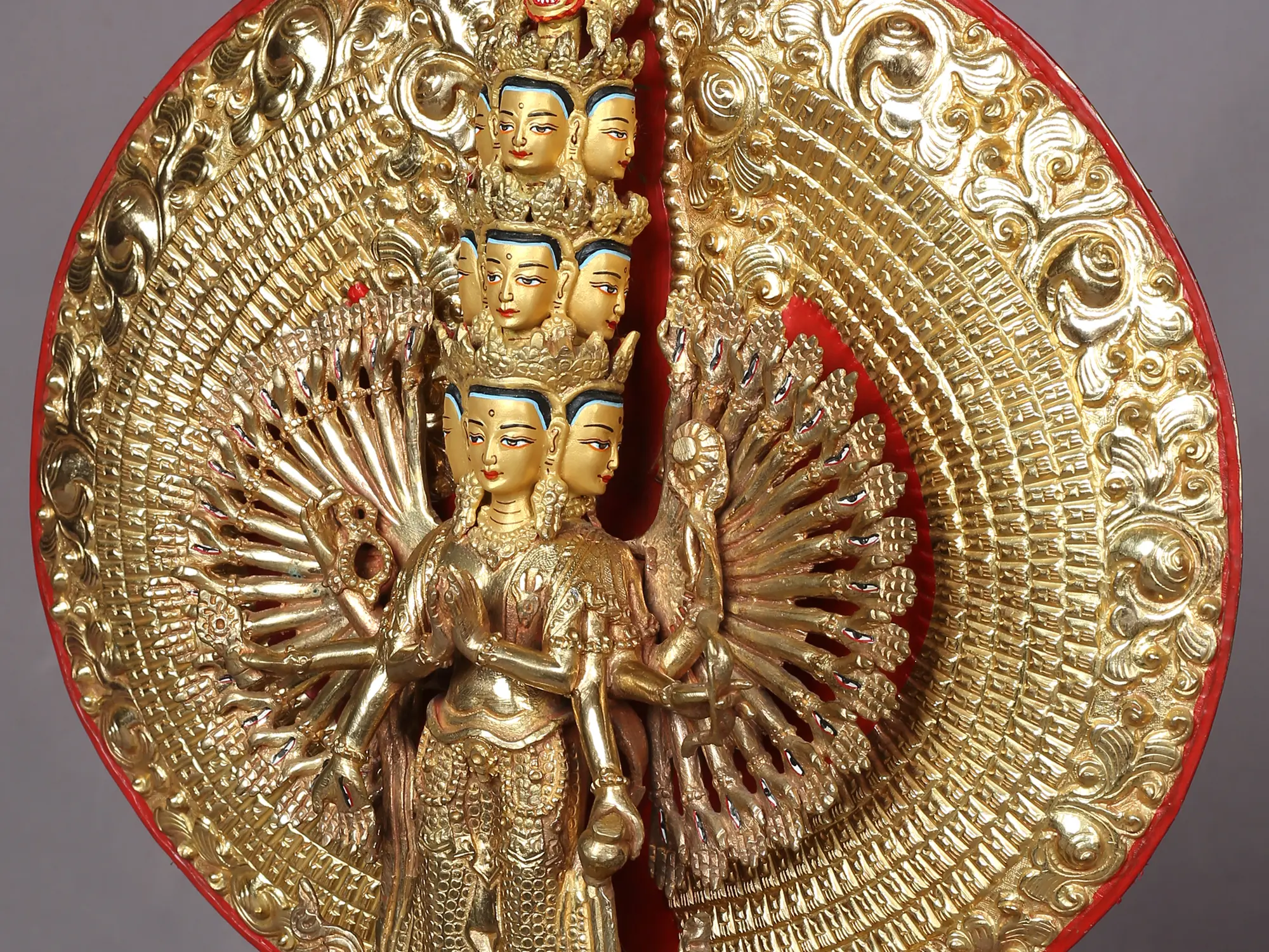 This enormous 1,000-armed, eleven-headed statue of the Bodhisattva Avalokiteshvara from Nepal represents the limitless strength and compassion of the deity. It is set on a golden pedestal that combines the poses of the royal Padmasana and Simhasana. The balance between Avalokiteshvara's numerous hands and bodies, the symmetry and unity of his 10 joyous faces, and the magnificent aureole highlight the artisan's expertise in creating this gilded copper statue. The tiny stones that are skillfully set in the lavish jewelry worn by Avalokiteshvara display the refined aesthetics of Nepalese art.