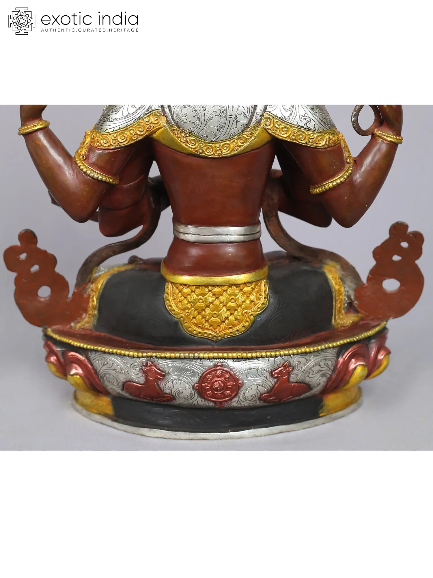 His seated posture in padmasana, the lotus position, signifies the union of compassion and emptiness, a key aspect of becoming a Bodhisattva. Each attribute of Chenrezig carries deep symbolism associated with compassion and happiness. He is seated on a moon disc and a lotus, this reflects his total purity. Further, his hands are in a prayer position holding a wish-fulfilling golden gem.