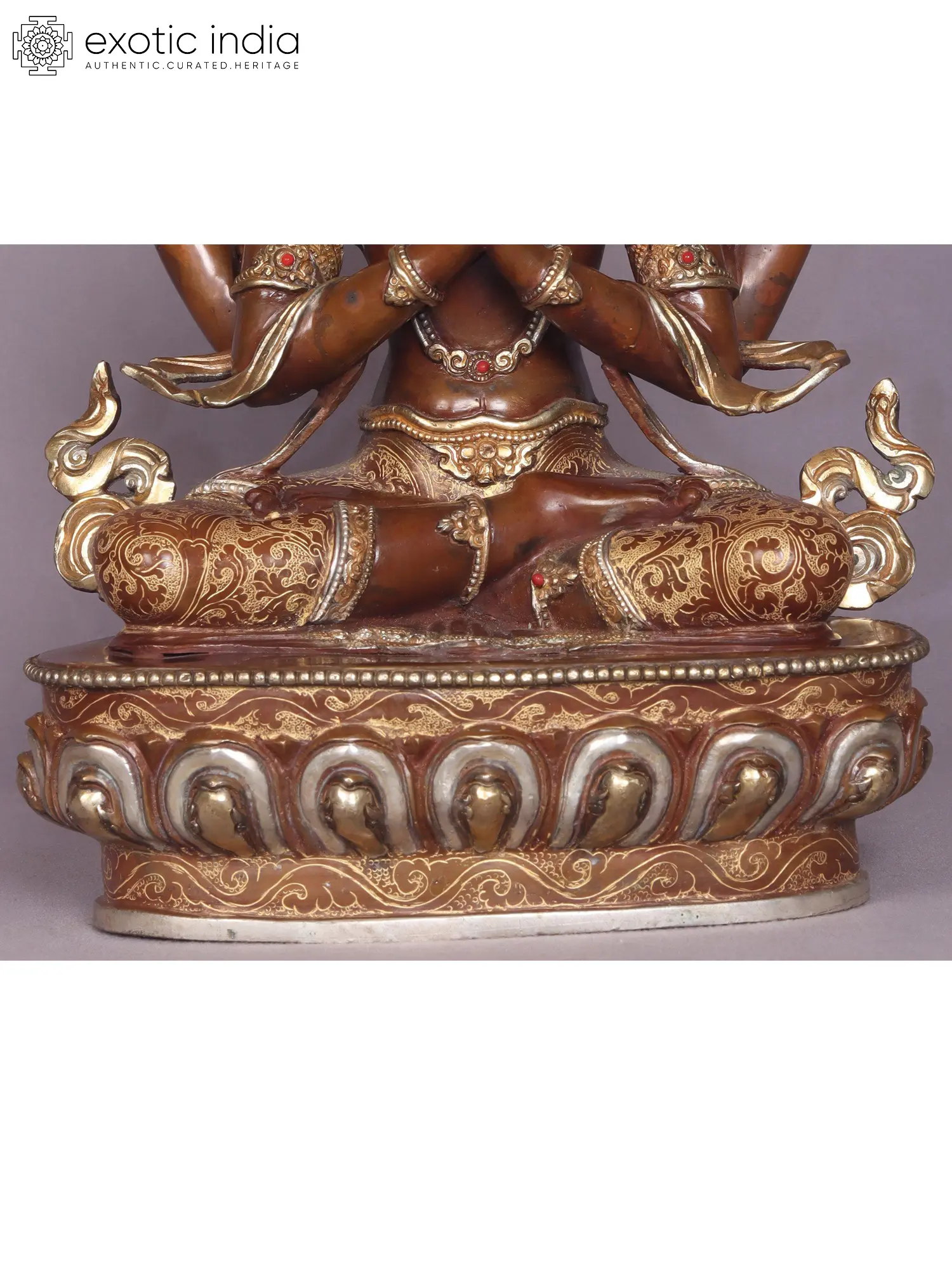 Of his four arms, two are conjoined in a prayerful gesture, grasping the wish-fulfilling gem. In his left hand, he gently cradles a lotus flower, while in his right, he holds a crystal mala (rosary), meticulously counting repetitions of his mantra. This signifies Chenrezig's continuous and unwavering commitment to benefiting all sentient beings. He is draped in silks and adorned with ornaments crafted from blue and red gemstones, Chenrezig exemplifies the quintessential qualities of a Bodhisattva.