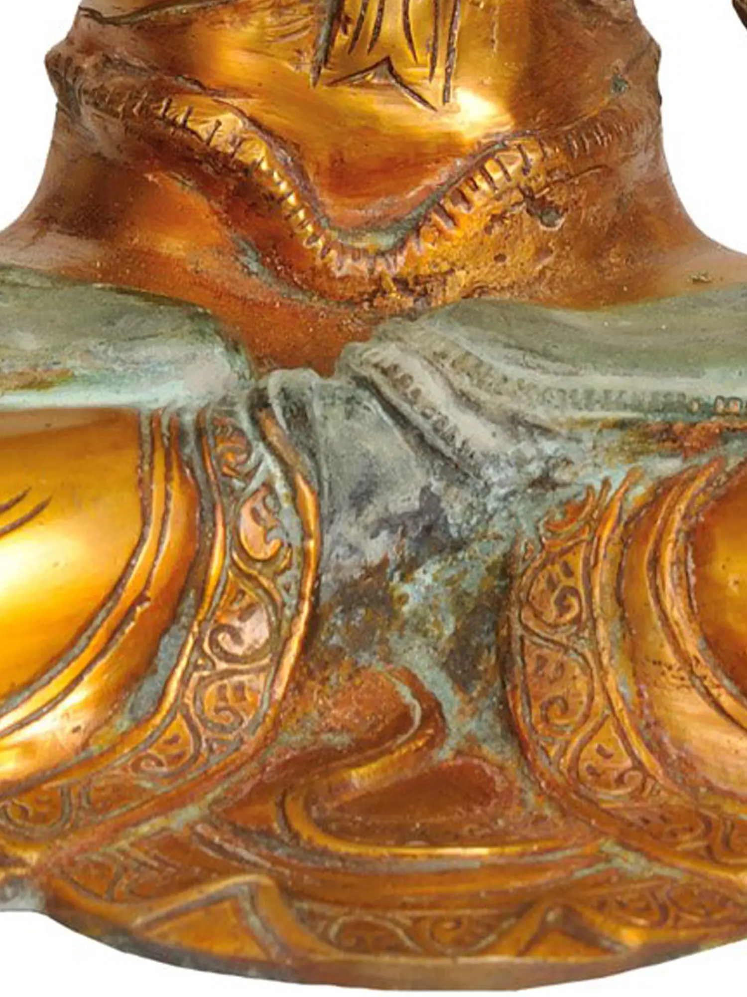 Crafted with meticulous attention to detail, this statue is a testament to the rich artistic heritage of India. The dual-toned brass finish, with its interplay of aged patina and polished gold, lends an aura of antiquity and divinity. The intricate detailing on Chenrezig's crown, adorned with various symbolic elements, signifies his exalted status. His serene countenance, with half-closed eyes and a gentle smile, radiates peace and profound wisdom. The flowing robes, adorned with delicate patterns, speak to the artistry of the sculptors who brought this divine form to life. The posture, seated in a meditative pose on a lotus throne, is indicative of spiritual stability and detachment from worldly desires.