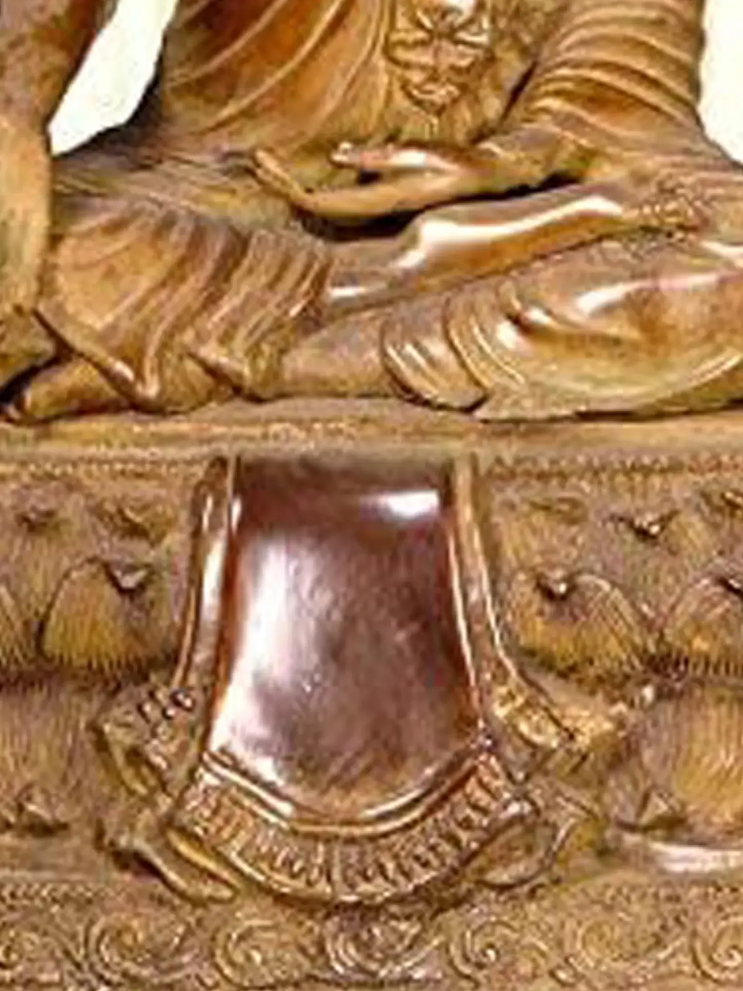 The Medicine Buddha is traditionally depicted in a seated meditative posture, representing inner peace and focus. In his left hand, resting in his lap, he holds a bowl filled with medicinal nectar or, in some depictions, the fruit of the myrobalan tree, known for its healing properties. His right hand is often extended downward in the gesture of granting blessings and dispensing medicine. The flower he holds in this statue is the myrobalan fruit/flower. These attributes are not merely decorative, but integral to the deity’s identity and purpose. Each element carries profound symbolic weight, reflecting the path to healing and enlightenment. The statue rests upon a beautifully detailed lotus base. The lotus flower is a symbol of purity, enlightenment, and spiritual awakening in Buddhism. The lotus emerges from muddy waters, yet blossoms into a beautiful flower, symbolizing the transformation of suffering into wisdom and compassion. Its presence as the foundation of this statue further enhances the transformative energy emanating from the Medicine Buddha.