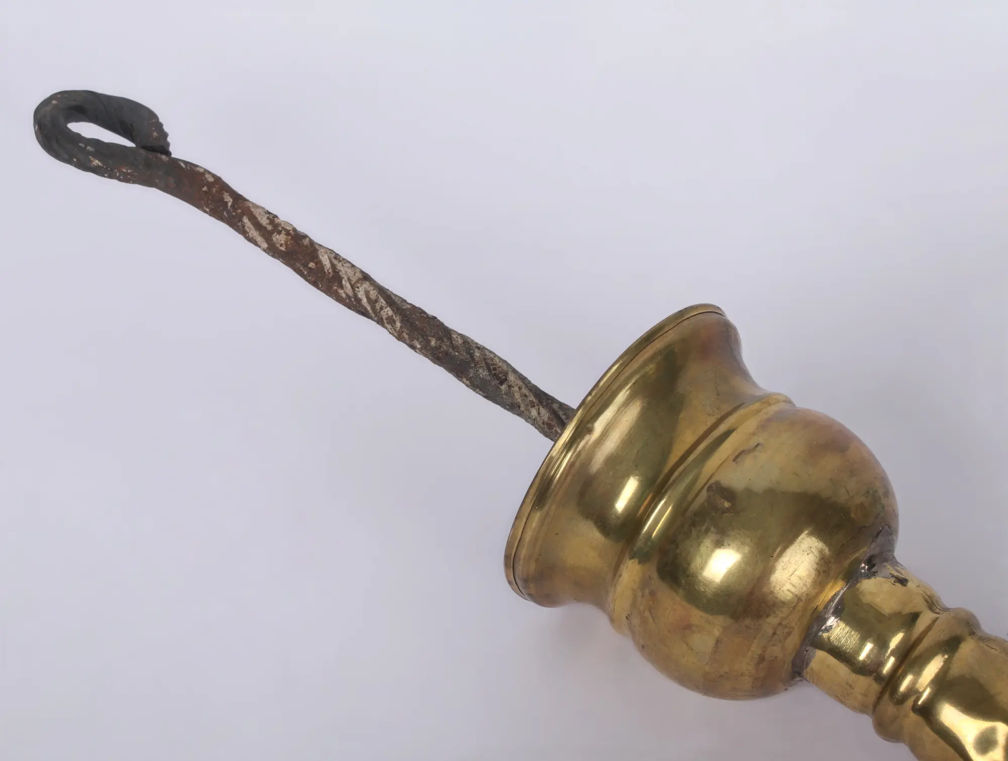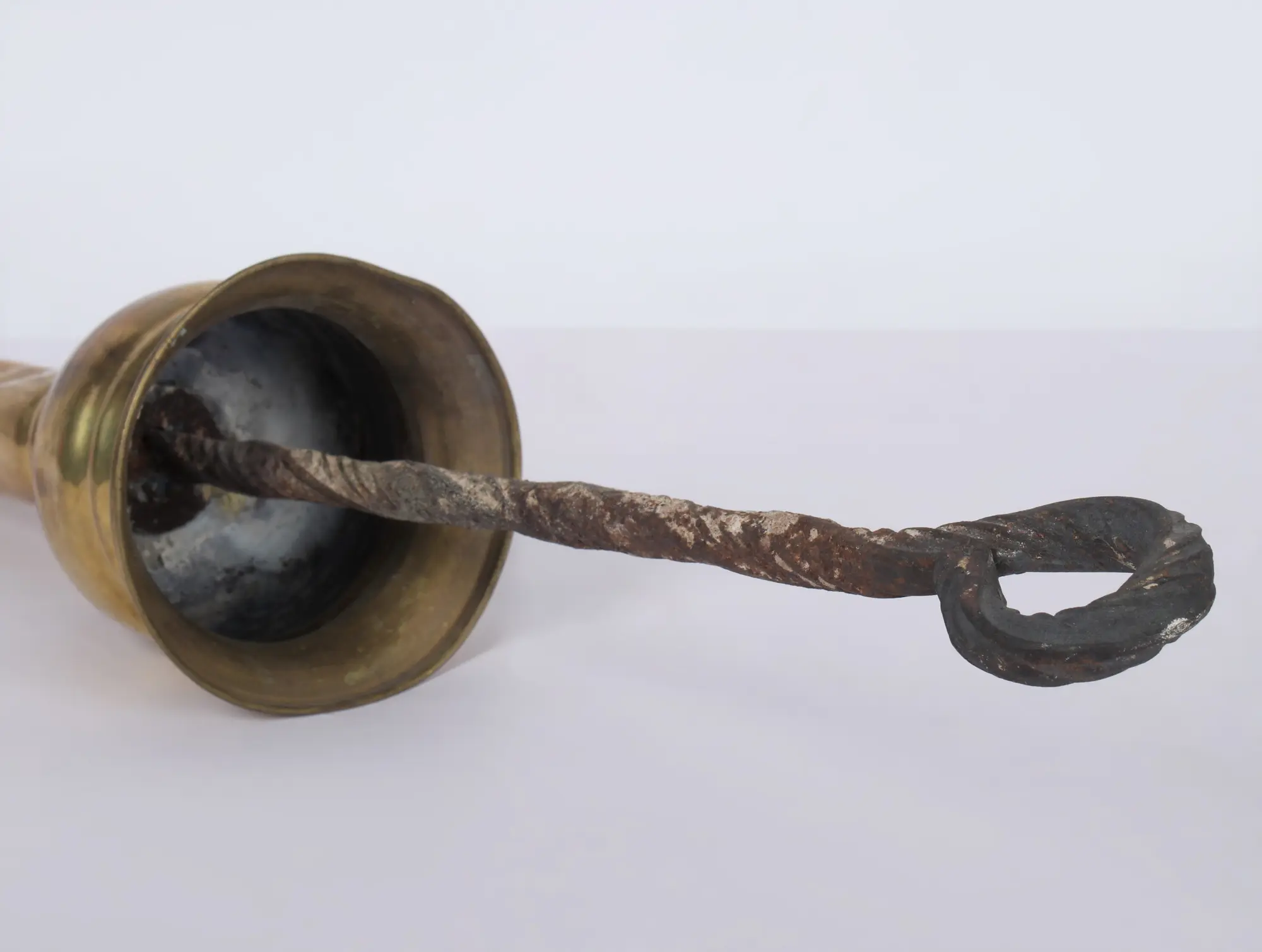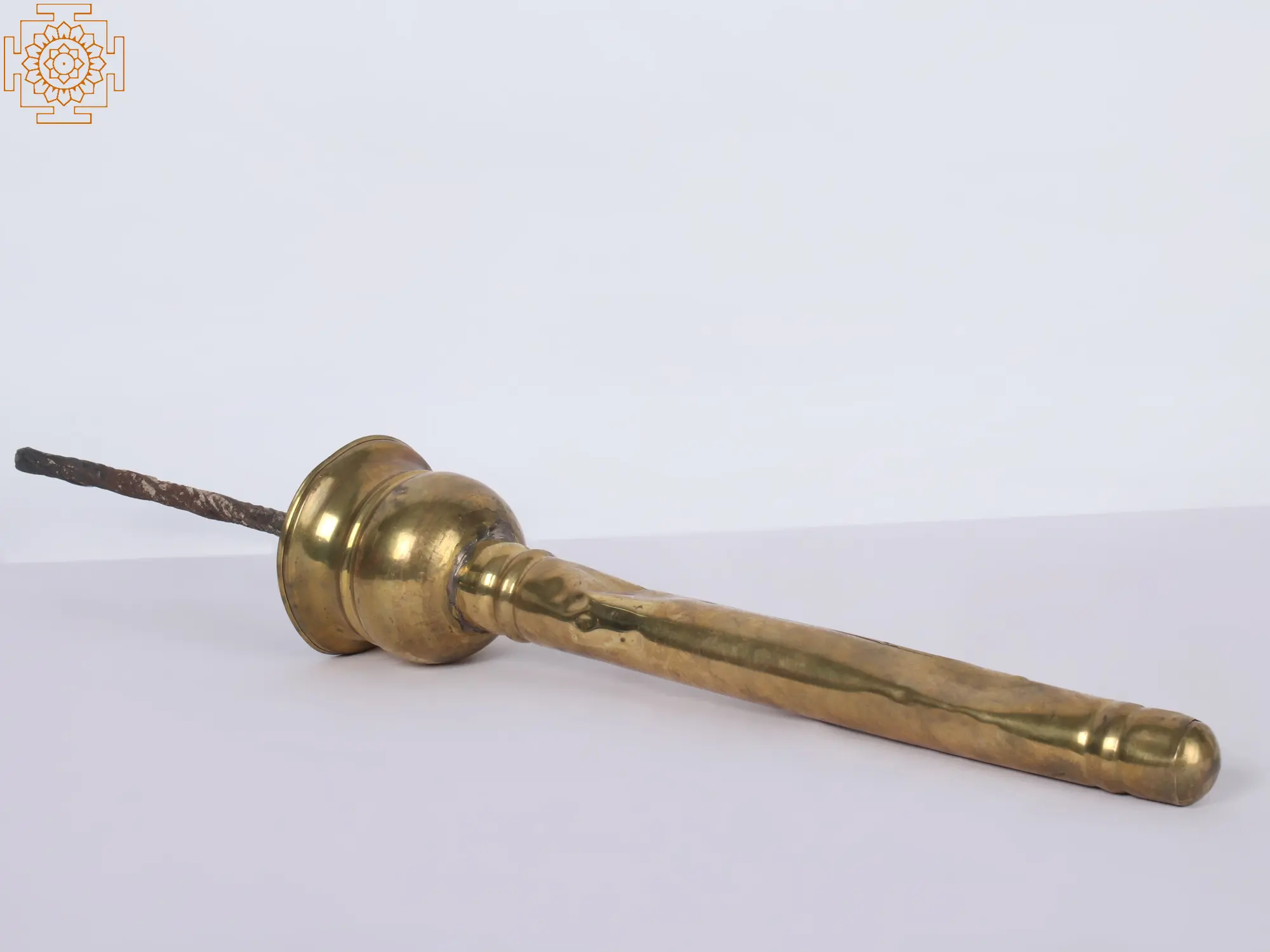 This exquisite brass torch is more than just an object; it is a conduit to ancient traditions and a symbol of spiritual light. Crafted by skilled artisans in India, each torch carries the warmth and dedication of handmade artistry, reflecting centuries of cultural heritage. Its substantial brass construction speaks to durability and reverence, designed to withstand the passage of time and the solemnity of sacred spaces. The form of the torch itself is elegant and functional, with a gracefully shaped receptacle designed to hold a flame. This receptacle, subtly bulbous, transitions into a long, slender shaft that provides a comfortable and secure grip. The aged patina on the brass hints at countless rituals performed, imbuing the piece with a profound sense of history and devotion. The intricate detailing on the upper portion of the torch, though subtle, adds a touch of artistic sophistication.