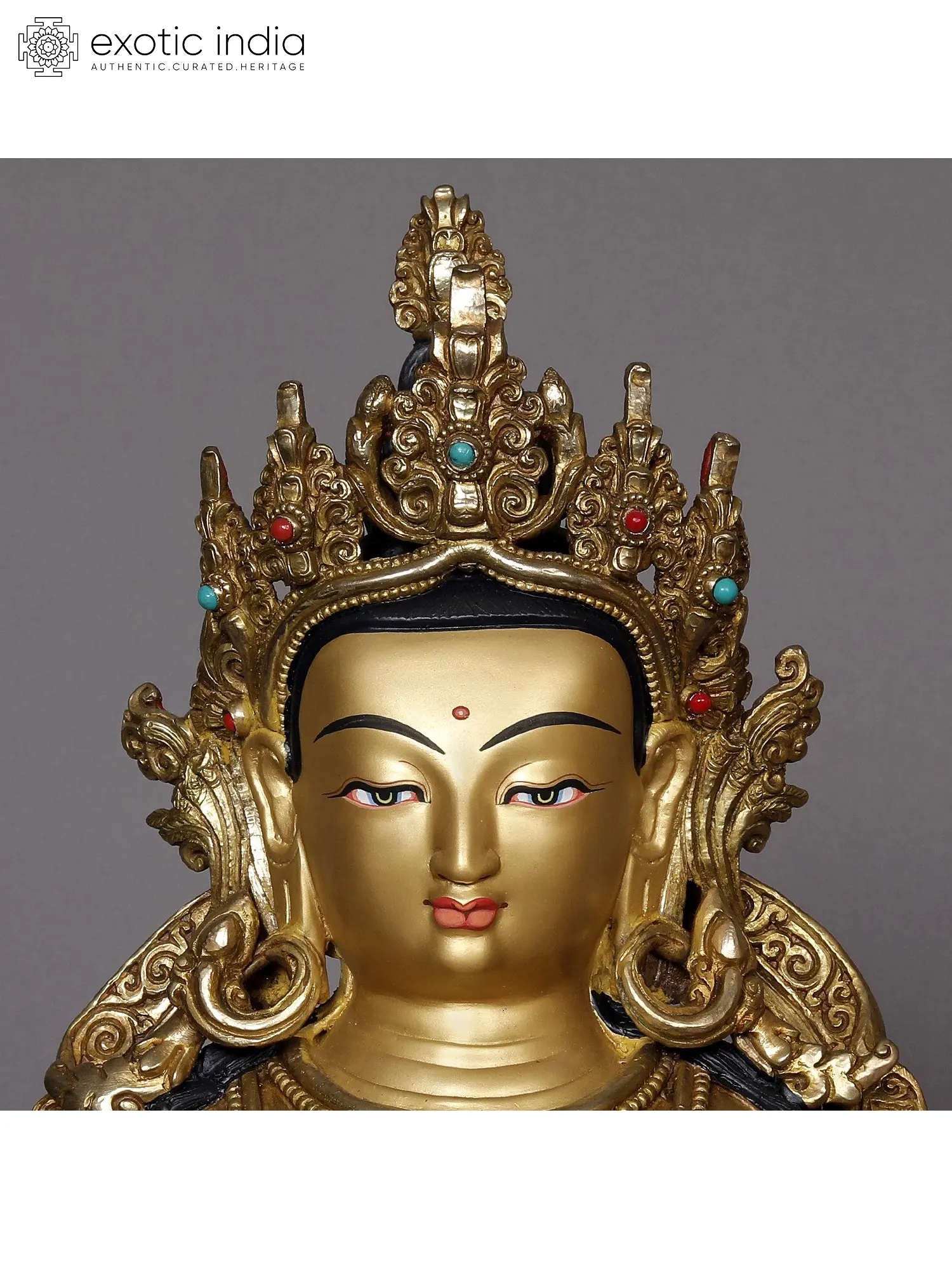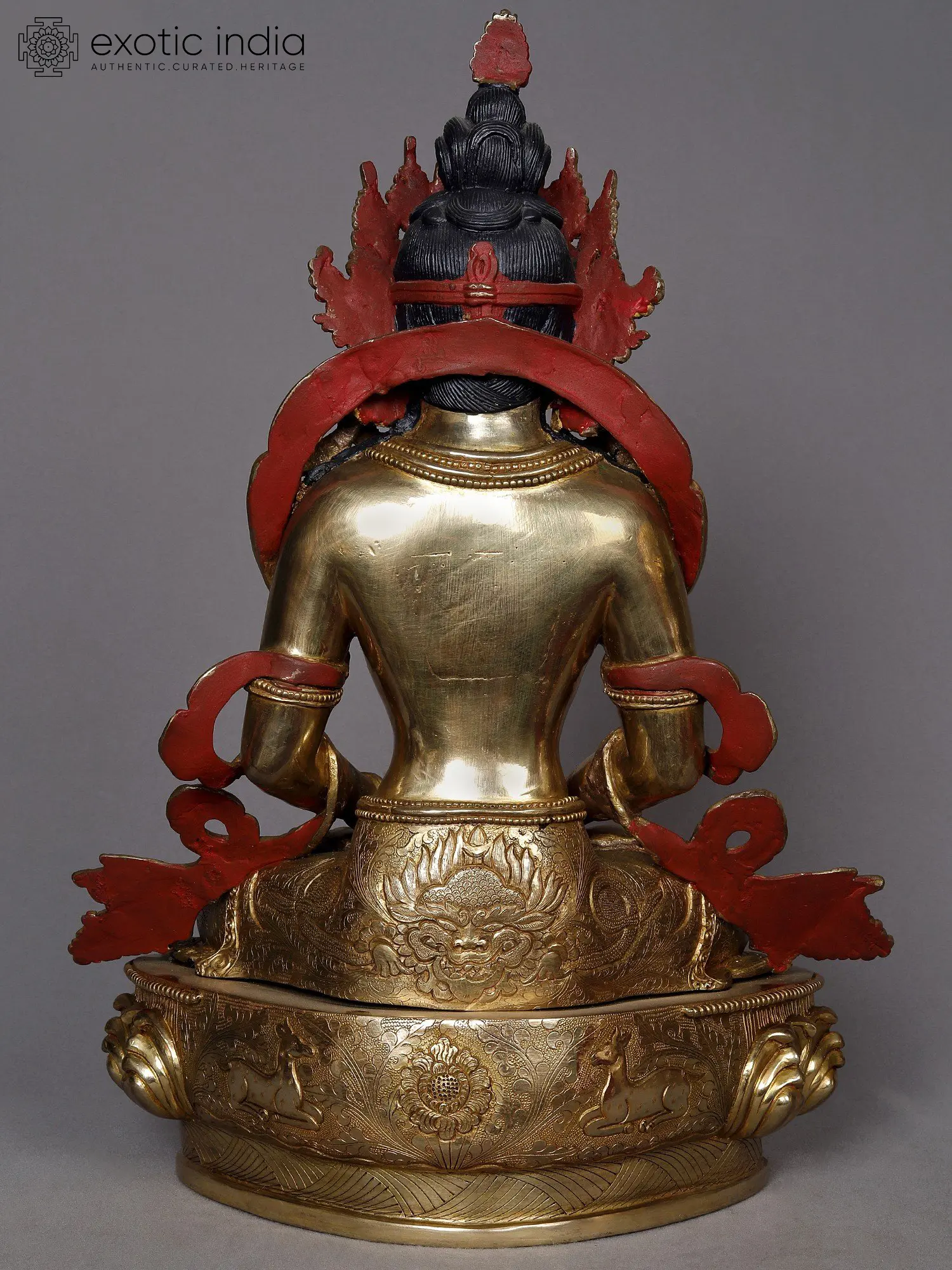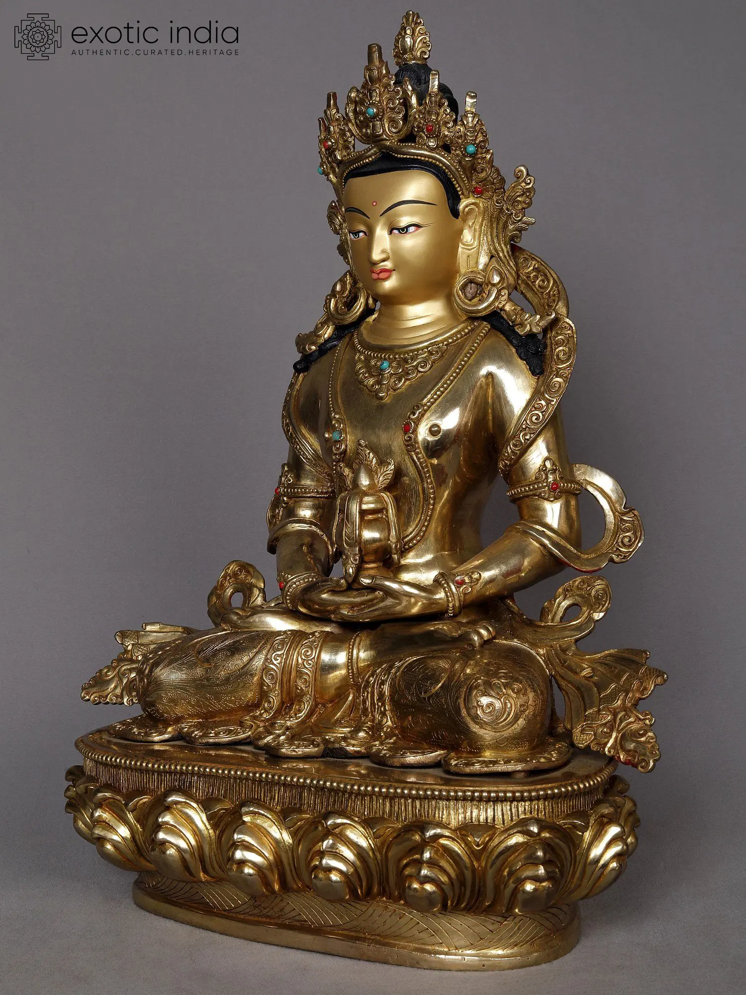 Aparmita, known as Amitayus in Tibet, embodies the longevity aspect of Amitabha Buddha. "Amitayus" translates to "infinite life" in Sanskrit. An Aparmita statue symbolizes Amitabha's longevity attribute within the Sambhogakaya realm. Rendered in a tranquil padmasana (full lotus pose), the statue holds an immortality vessel brimming with "amrita" on its lap.