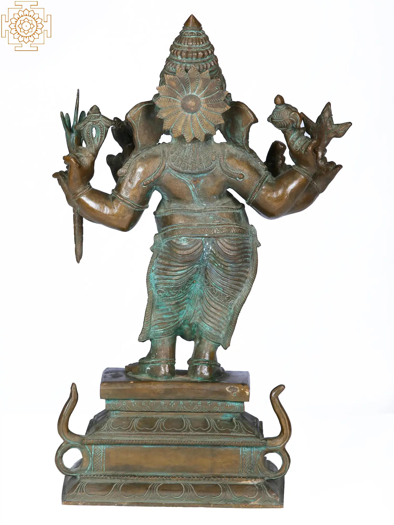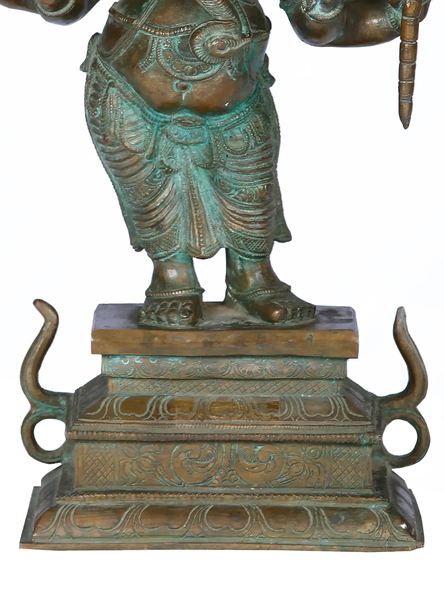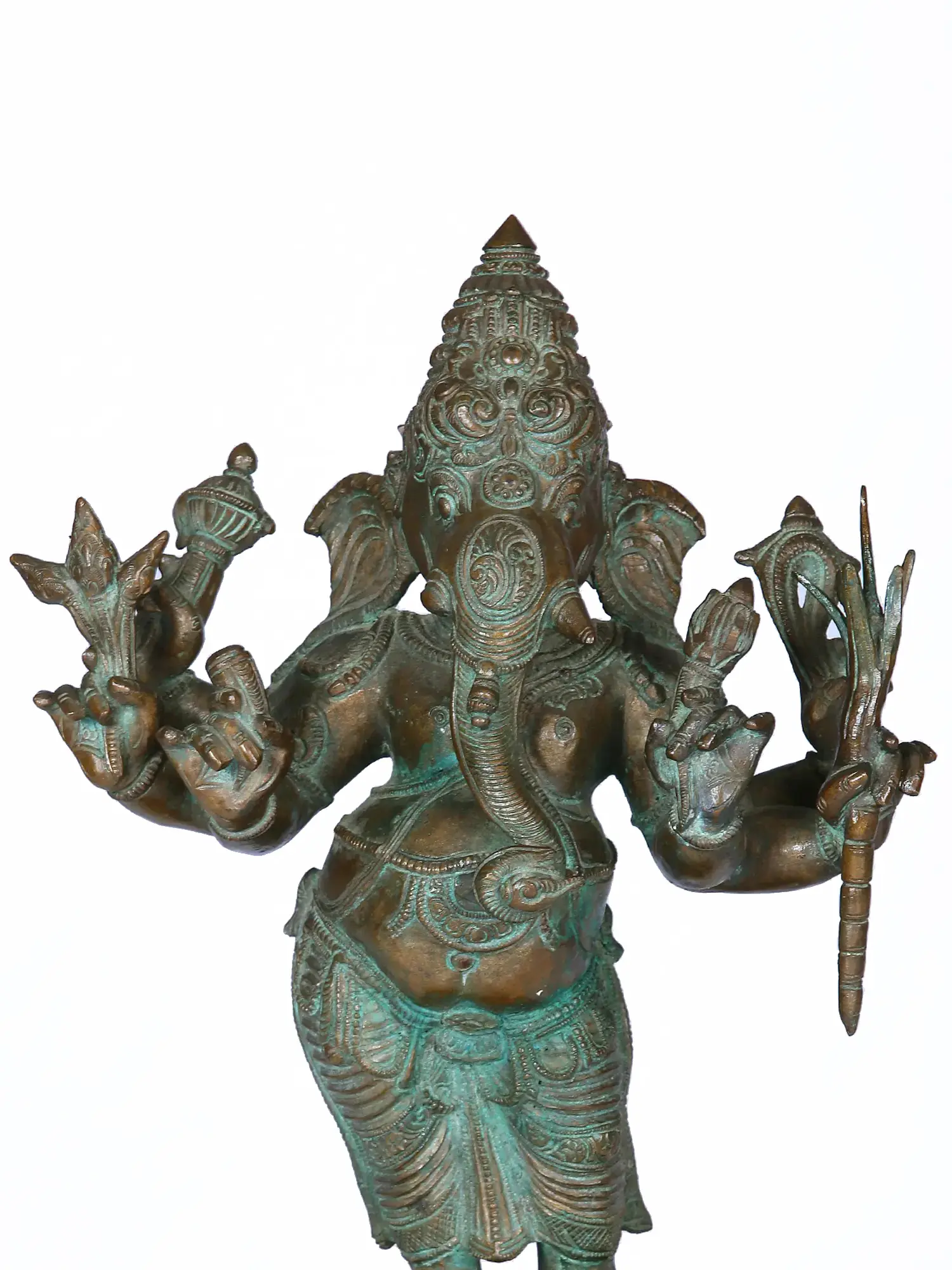 This Ashtabhuja Standing Bhagawan Ganesha sculpture from Swamimalai, crafted through the Madhuchista Vidhana (Lost-Wax) technique in Panchaloha Bronze, is a remarkable embodiment of Lord Ganesha in his Maha Ganapati form. Standing in a Tri-Bhanga posture on a lotus pedestal, this statue showcases the 13th manifestation among the 32 different forms of Ganapati.