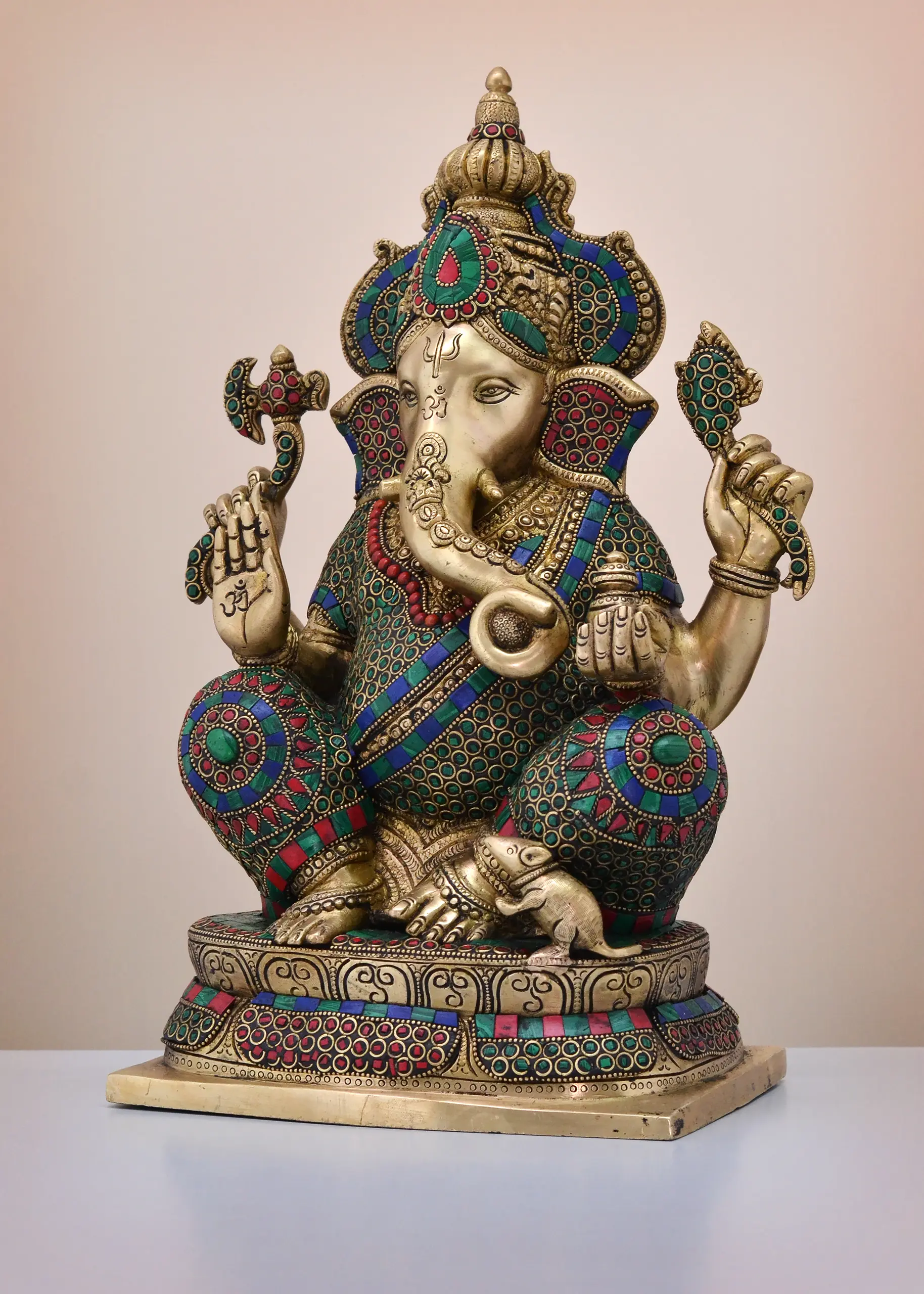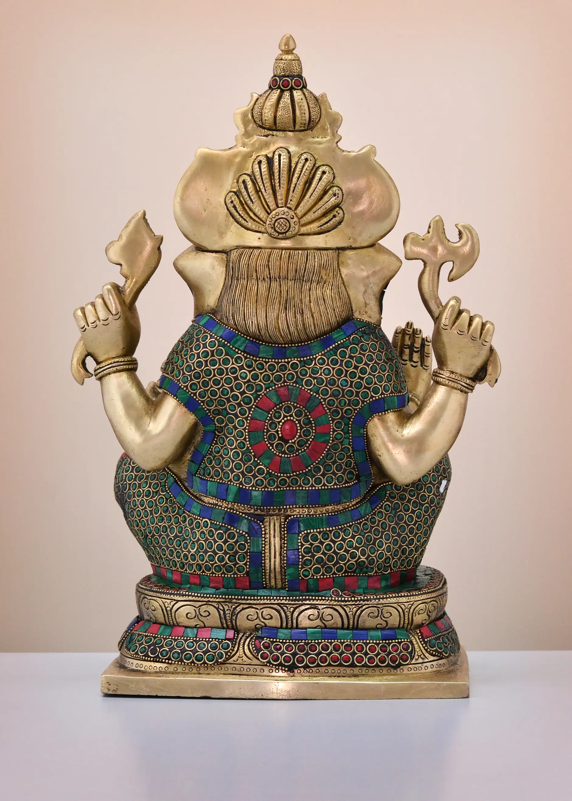 16" Brass Crown Ganesh (Left Trunk) with Inlay Work | Handmade