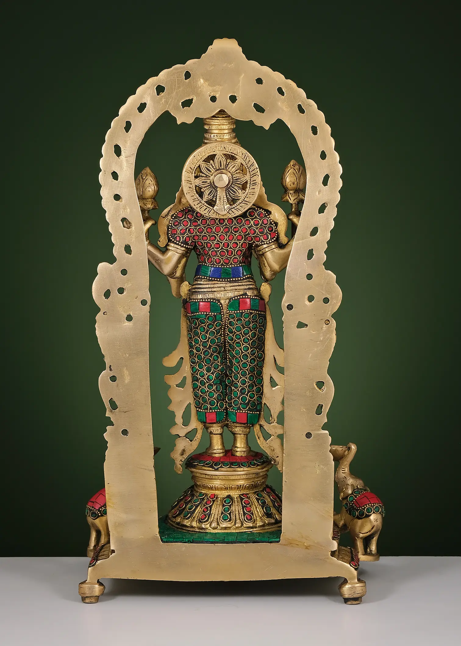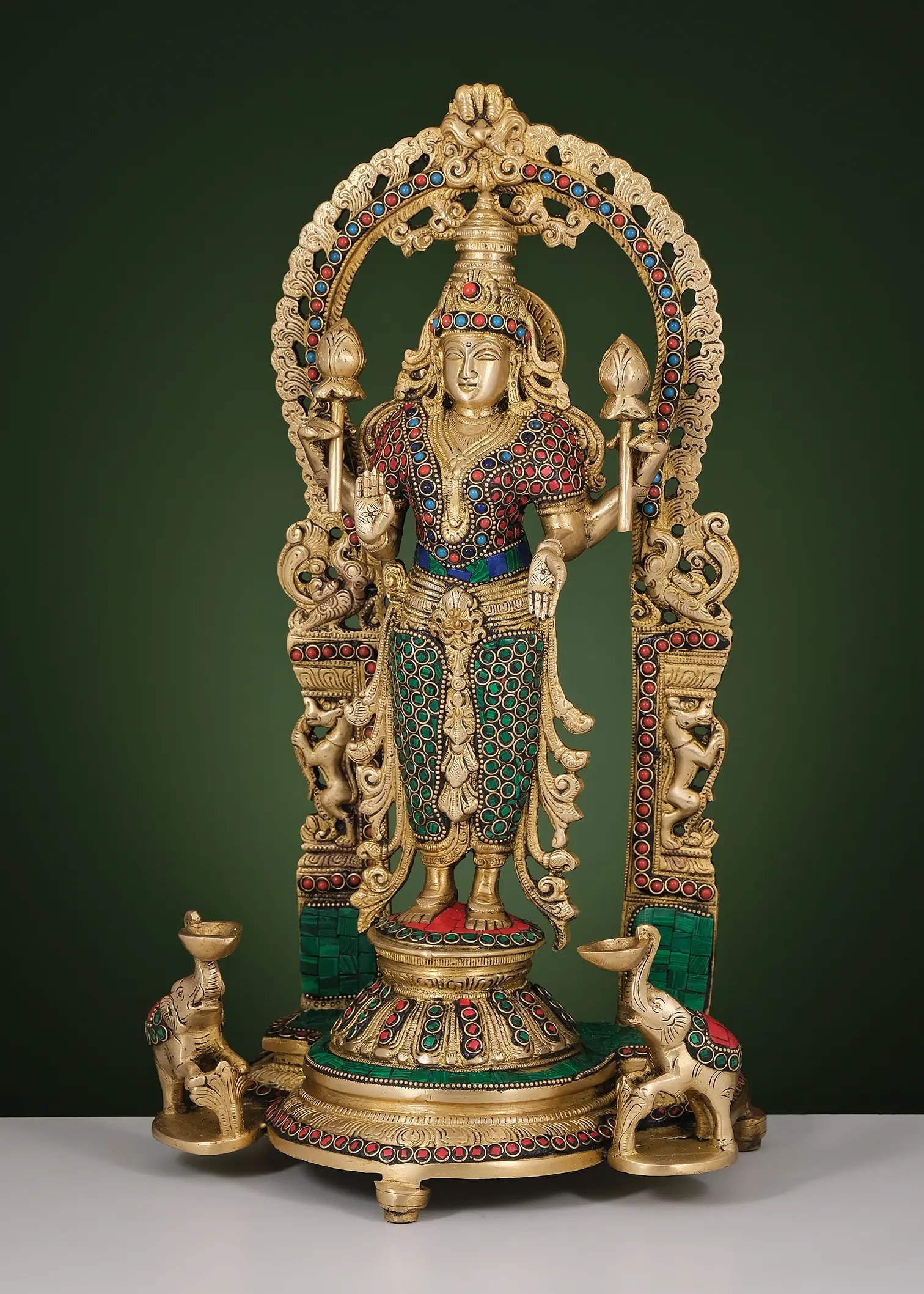 Under a magnificent Prabhavali consisting of Yali, Makara, and Kirtimukha- all symbols of divinity and royalty, stands goddess Lakshmi in this brass statue. A beautifully inlaid platform with an inverted lotus pedestal is Devi Lakshmi's sacred space, where she stands in an upright posture, in her Chaturbhuja roopa, holding two lotus buds and the mudra of Varada and Abhaya. A profusion of vibrant inlay pieces all over the statue infuses it with an eye-catching visual effect. Two elephants on the lower section, holding ritual lamps in their upraised trunks, pay obeisance to the great bestower of abundance, as representatives of universal royalty, which is forever enriched by the benevolence of the propitious wife of Vishnu.