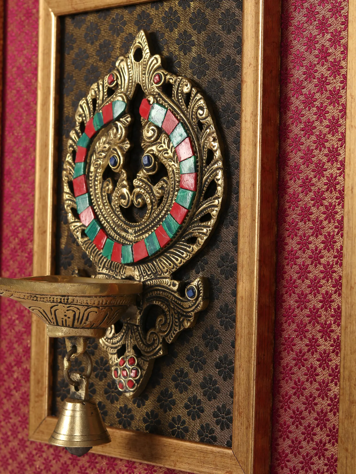 This Brass Lamp with Bell in Wood Framed, a captivating wall hanging, seamlessly blends the beauty of a pink brocaded cloth with the sophistication of a black and grey brocaded cloth. The intricate fusion of these fabrics, elegantly framed in wood, creates a harmonious and visually striking composition.