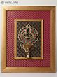 Encasing this centerpiece is a beautifully crafted wooden frame, providing a structured and elegant border. The wooden frame provides a textural backdrop that enhances the visual appeal. The contrast between the wood and the lustrous brass creates a dynamic interplay of textures and tones. The inner fabric is a patterned, black color which gives another contrast. The outer fabric also has a pleasing, patterned design and is red in color. The dimensions of the artwork are 16.0 x 13.0 x 4.0 inches. This item is a perfect addition to any home or office looking for a piece of art with history and culture.
