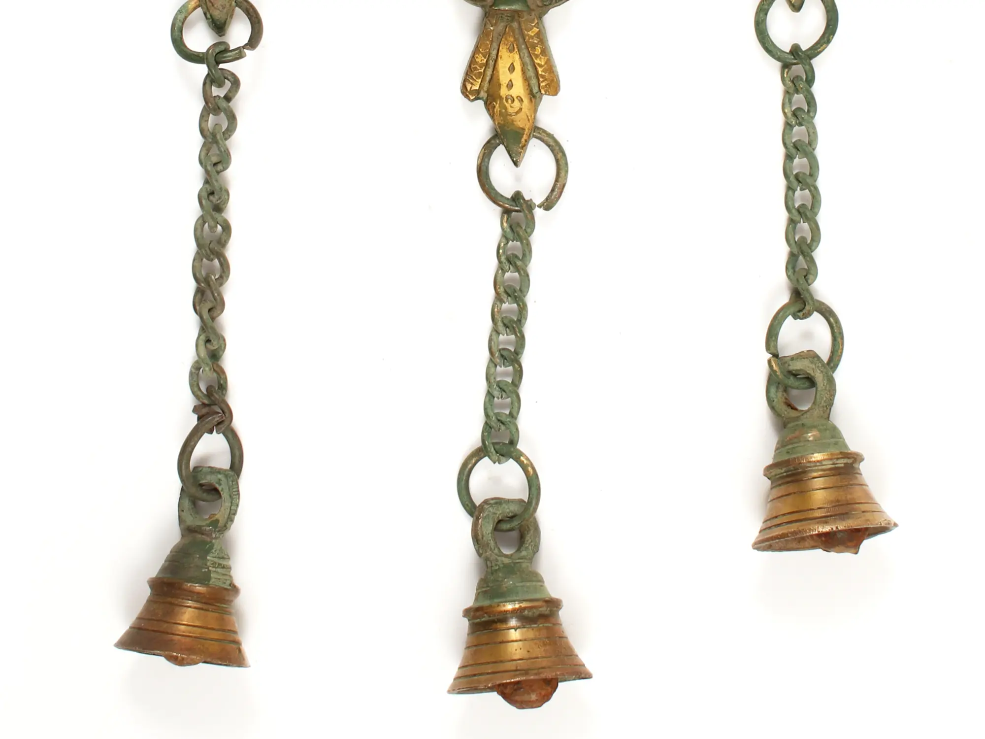 The use of brass for this sacred artwork is significant. Brass, an alloy of copper and zinc, is believed to possess antimicrobial properties and is often associated with purity and divine energy in various cultures. The aged patina of the brass, combined with accents of gold, lends an antique charm and a sense of timeless reverence to the piece. This wall hanging is designed to be a focal point in any room, be it your entryway, puja room, living space, or even your office. The tinkling of the bells, suspended by sturdy chains, adds an auditory dimension to its spiritual aura, believed to ward off negativity and welcome positive vibrations. In ancient India, bells were often used in temples to alert deities to prayers or to signify the start of auspicious rituals.