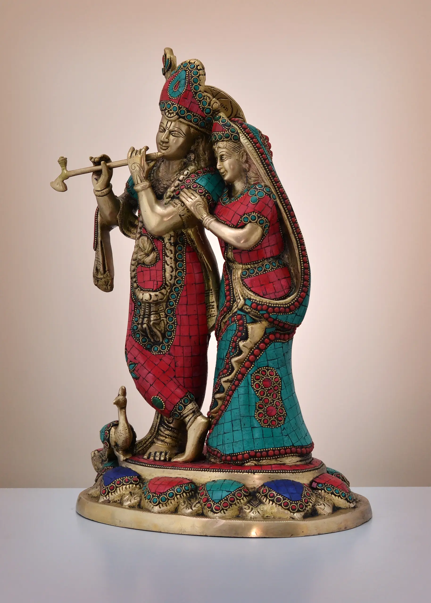 The striking combination of polished brass and the richly colored inlay creates a truly mesmerizing effect. Observe the graceful posture of Krishna, his flute poised to play a melody that resonates with divine harmony, while Radha leans tenderly towards him, her gaze filled with affection. The ornate headdresses and flowing garments are adorned with patterns that speak of ancient traditions and exquisite craftsmanship. A charming peacock, a symbol of divine beauty, rests at their feet, completing the harmonious composition.