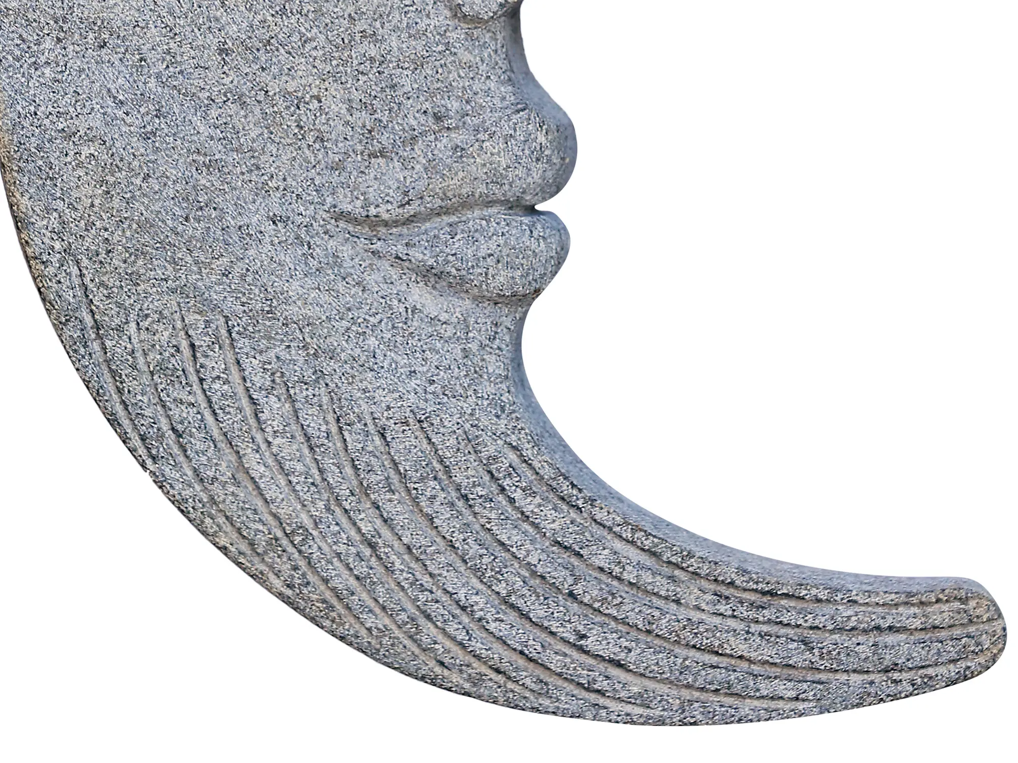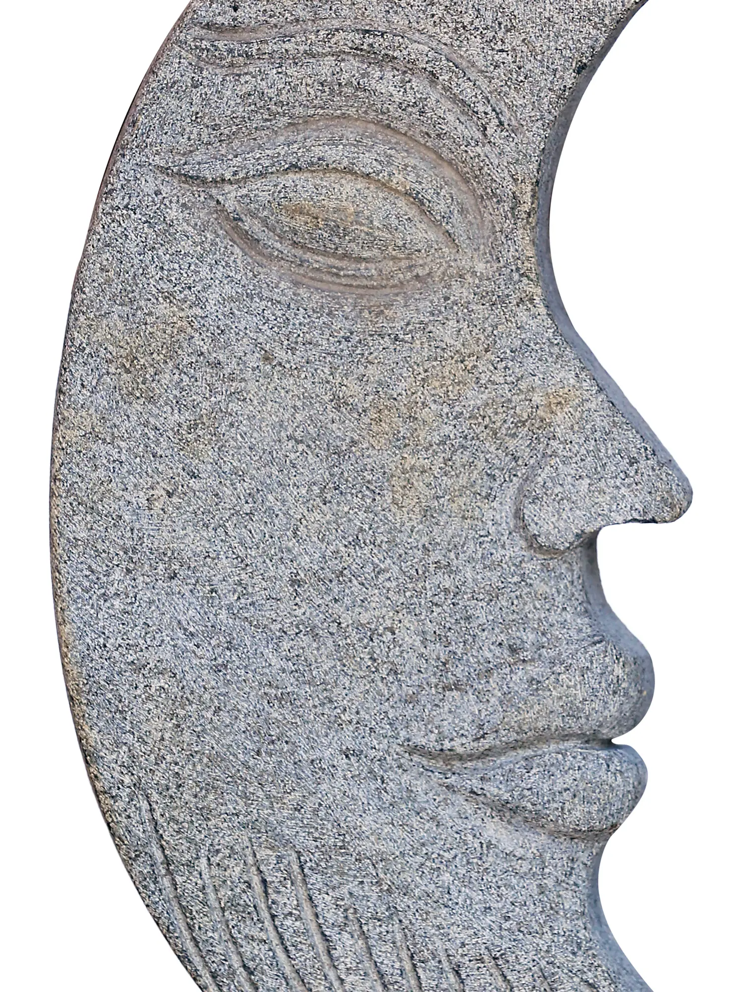 This crescent moon sculpture, meticulously carved from granite, showcases a stylized representation of a human face.