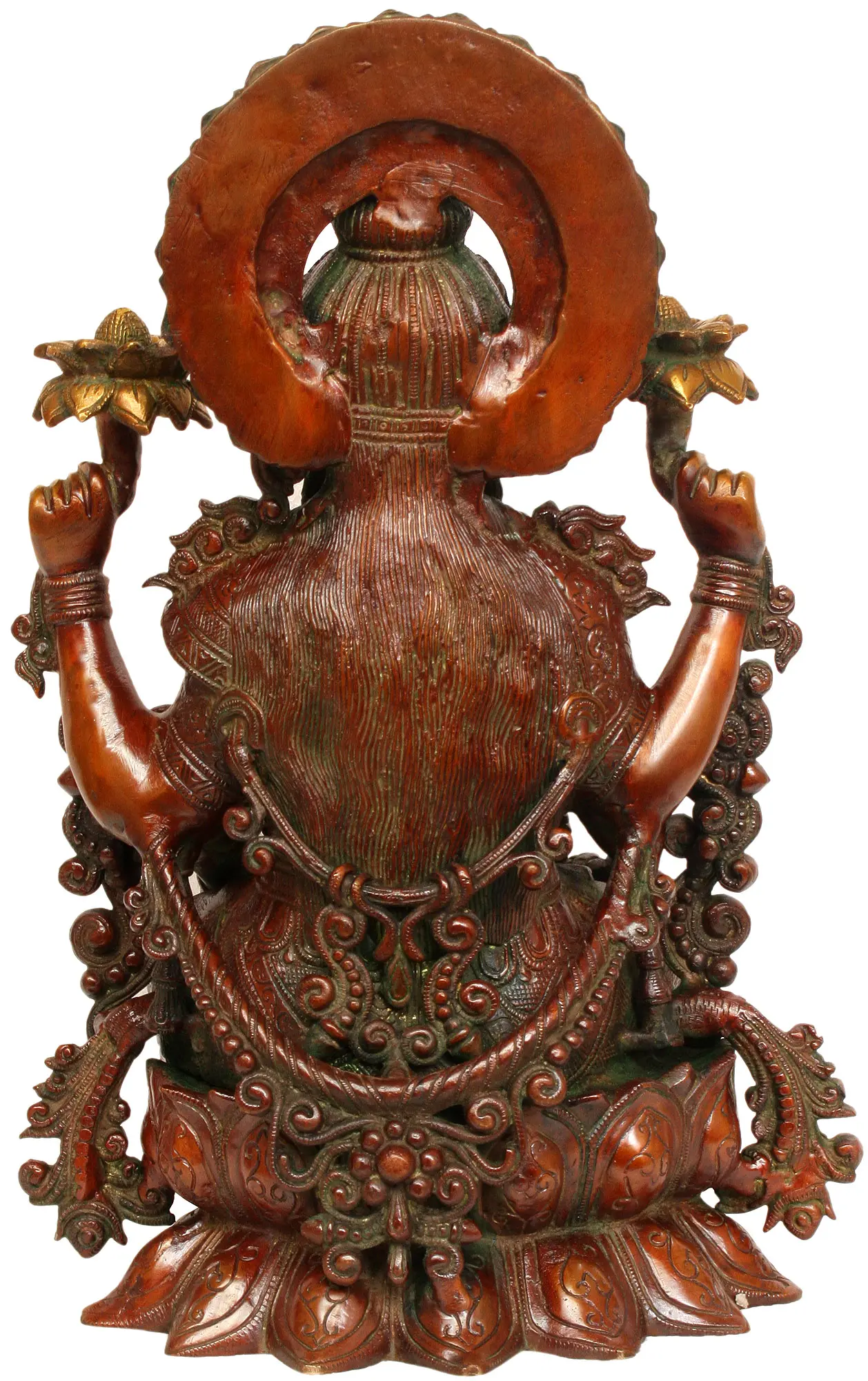 This statue is a product of skilled artisans in India, who have poured their expertise and devotion into every detail. The rich patina of the brass, combined with polished accents, creates a striking visual appeal. The fine carvings on her garments, the delicate rendering of the lotuses she holds, and the serene expression on her face all speak to the high level of craftsmanship involved. The scale of this piece makes it a commanding presence, suitable for a prominent place in your living room, puja room, or office, serving as a constant reminder of the virtues she represents.