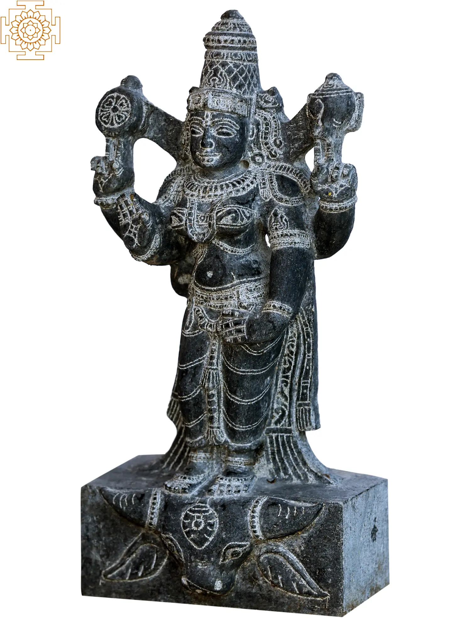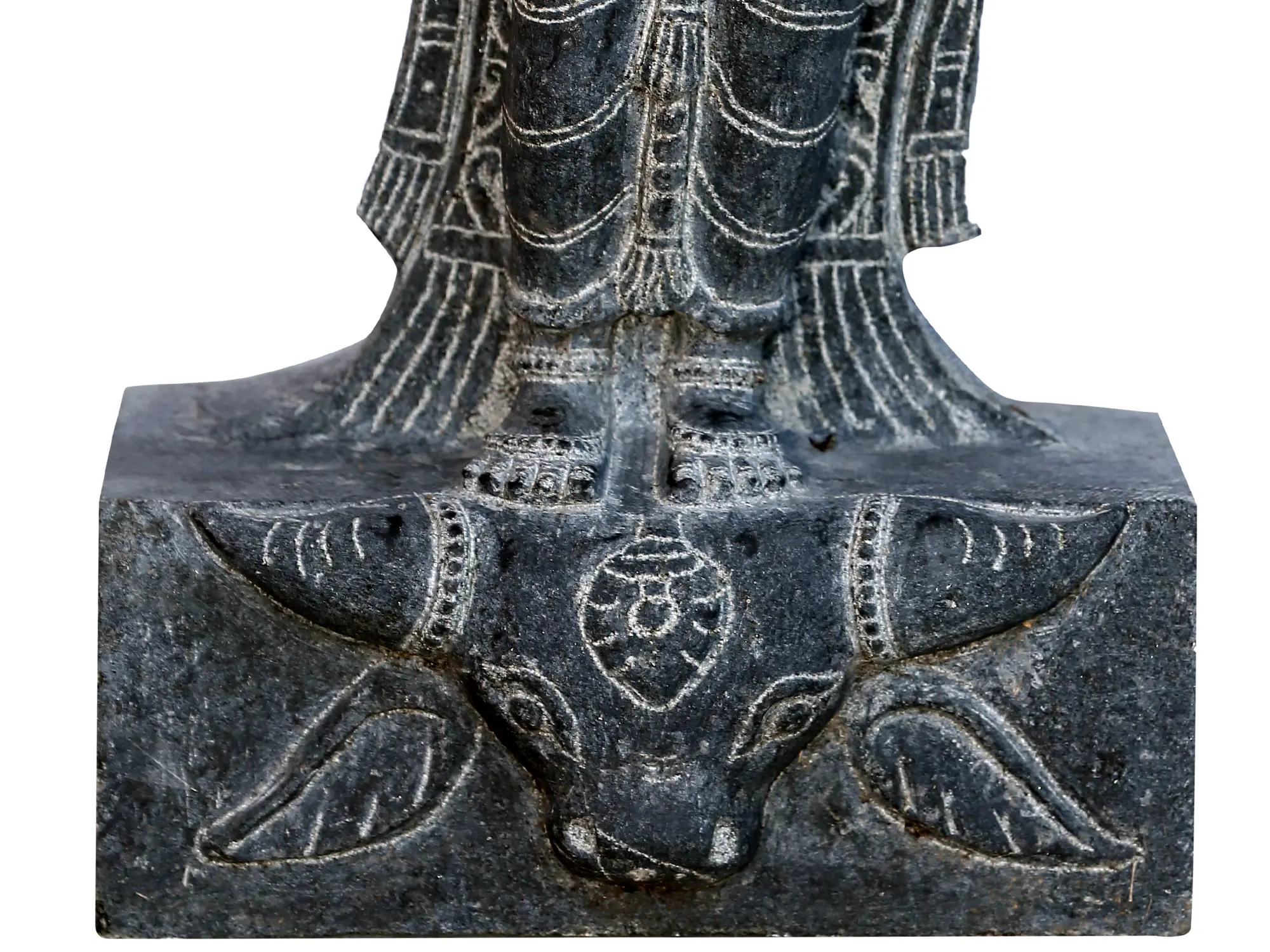 The intricate craftsmanship of this granite stone statue highlights the goddess’s fierce expression, adorned with elaborate jewelry and a flowing garment.