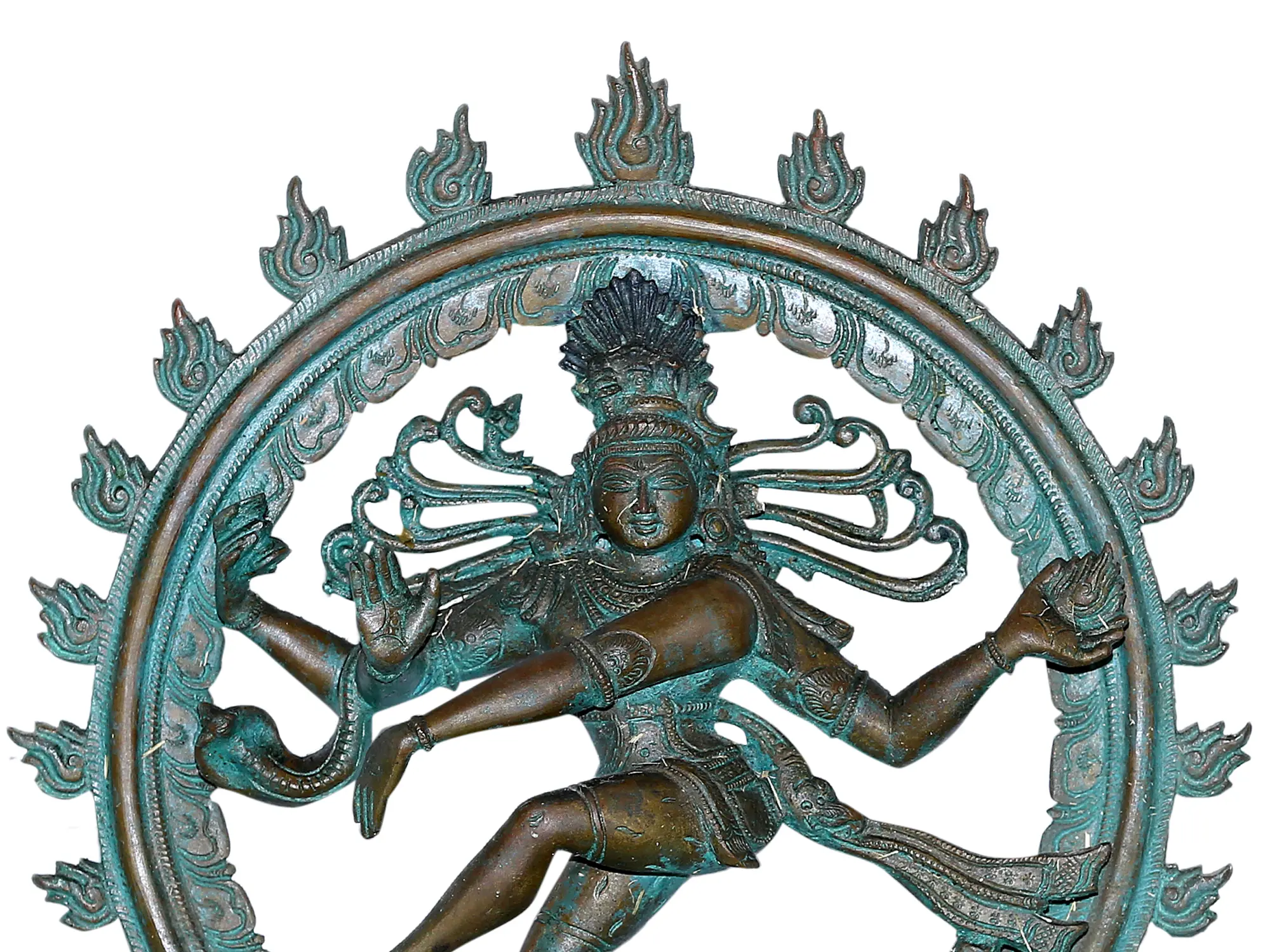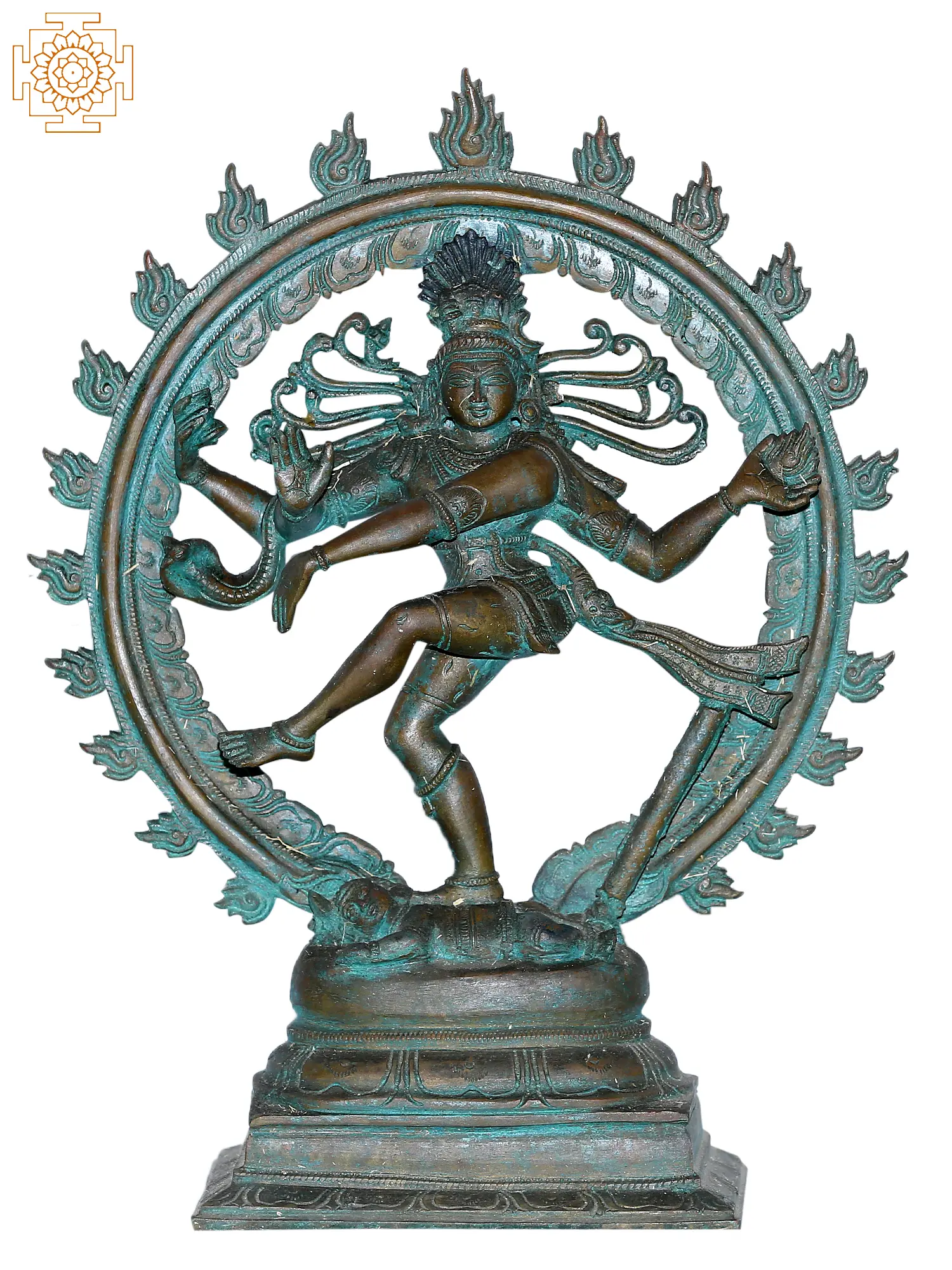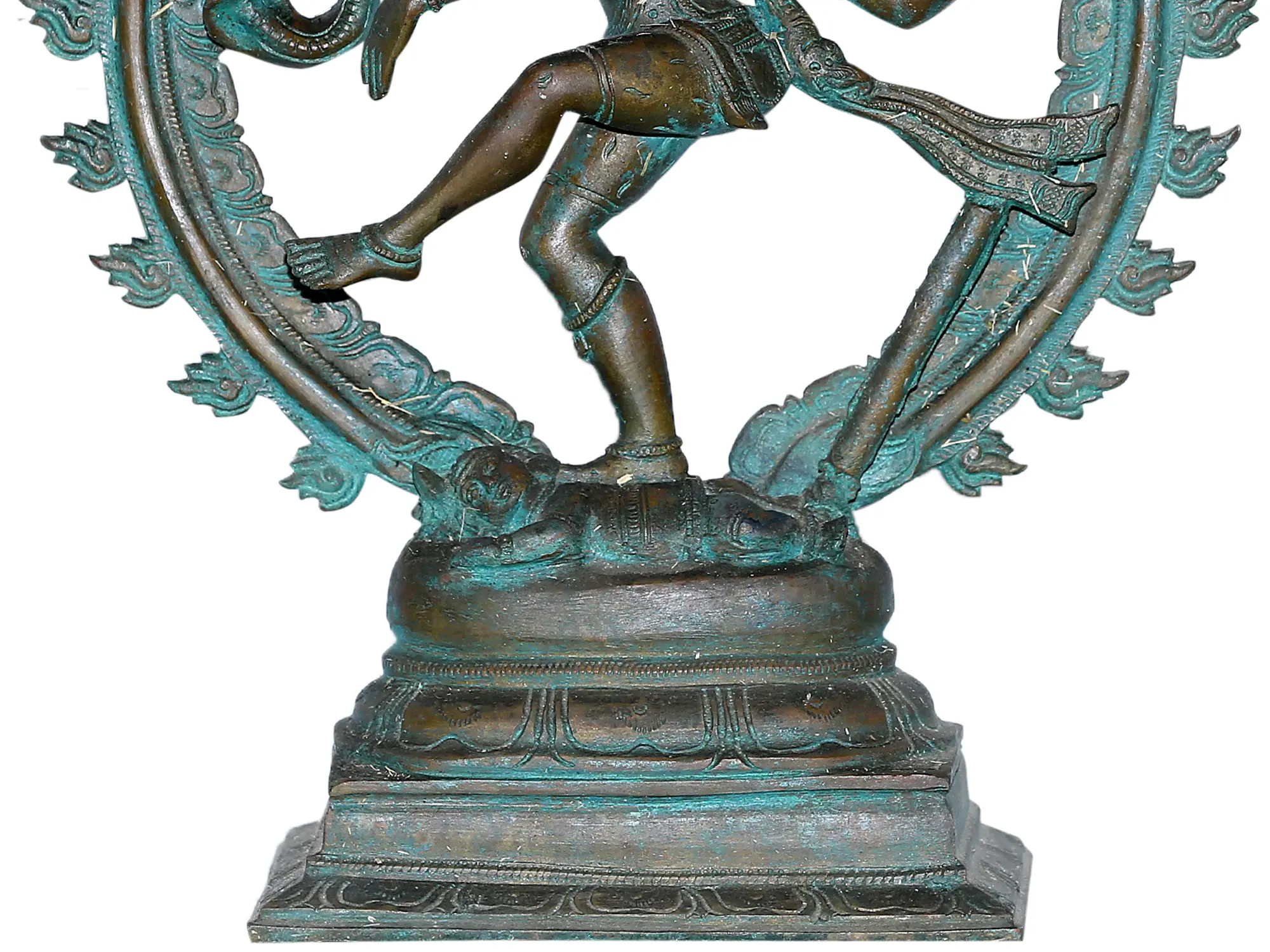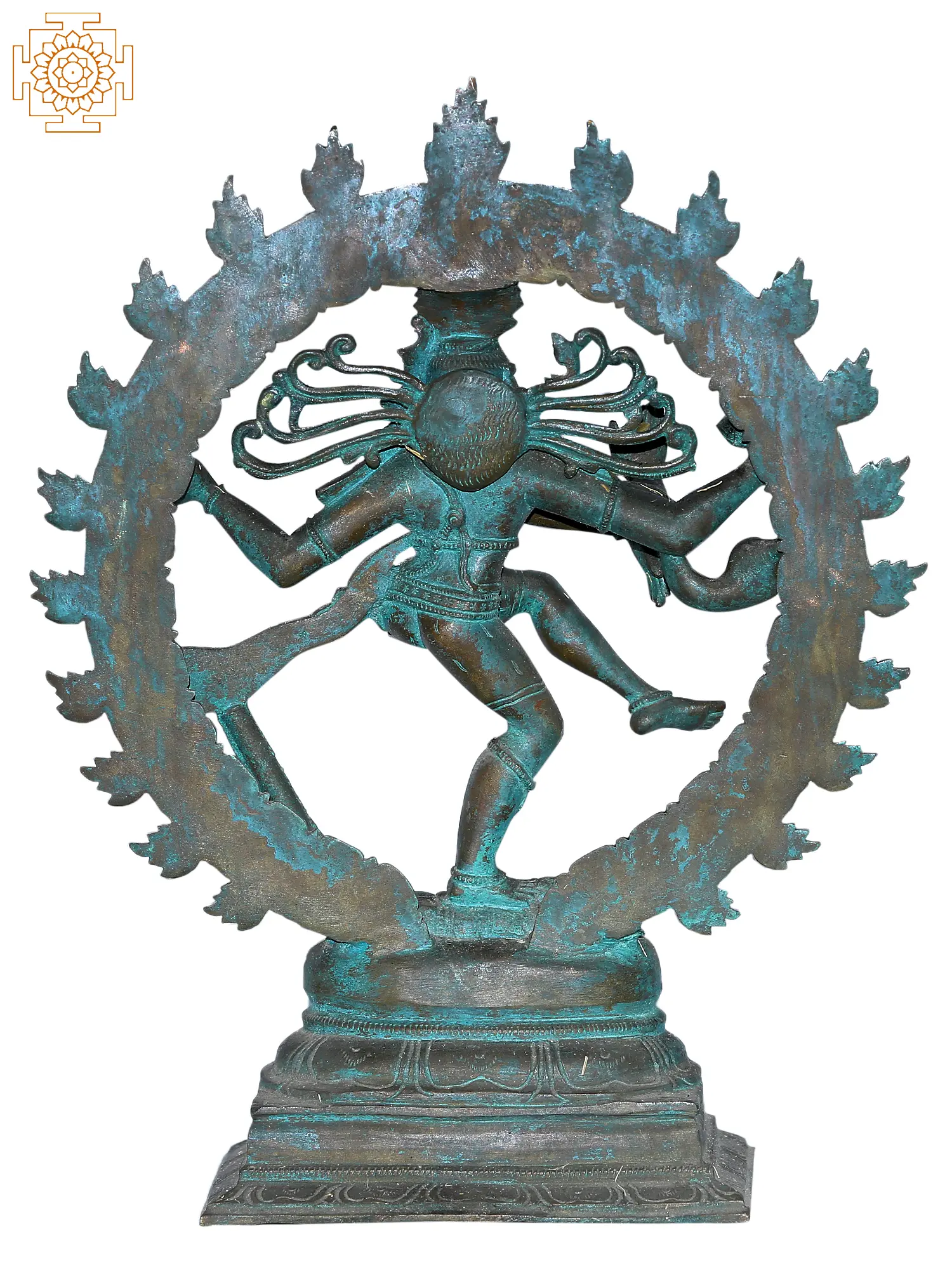 Crafted with exceptional skill, this statue is a testament to the enduring legacy of Indian artistic traditions. The verdigris patina not only enhances the visual appeal but also speaks to the piece's authenticity and the depth of its character, hinting at the many ages and spiritual energies it has absorbed. Whether as a centerpiece in a sacred space or a commanding decorative element, this Shiva Tandava sculpture invites contemplation on the fundamental forces of the universe and the divine rhythm that orchestrates all life. It is a powerful reminder that creation and destruction are two sides of the same eternal coin, driven by the ceaseless cosmic dance.