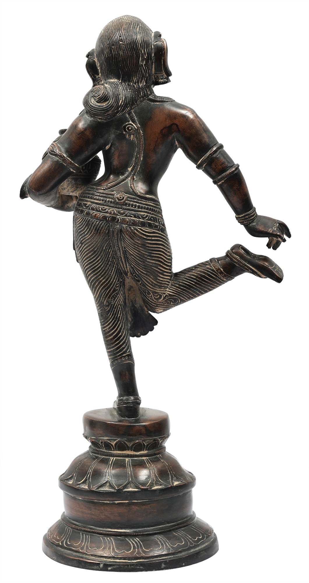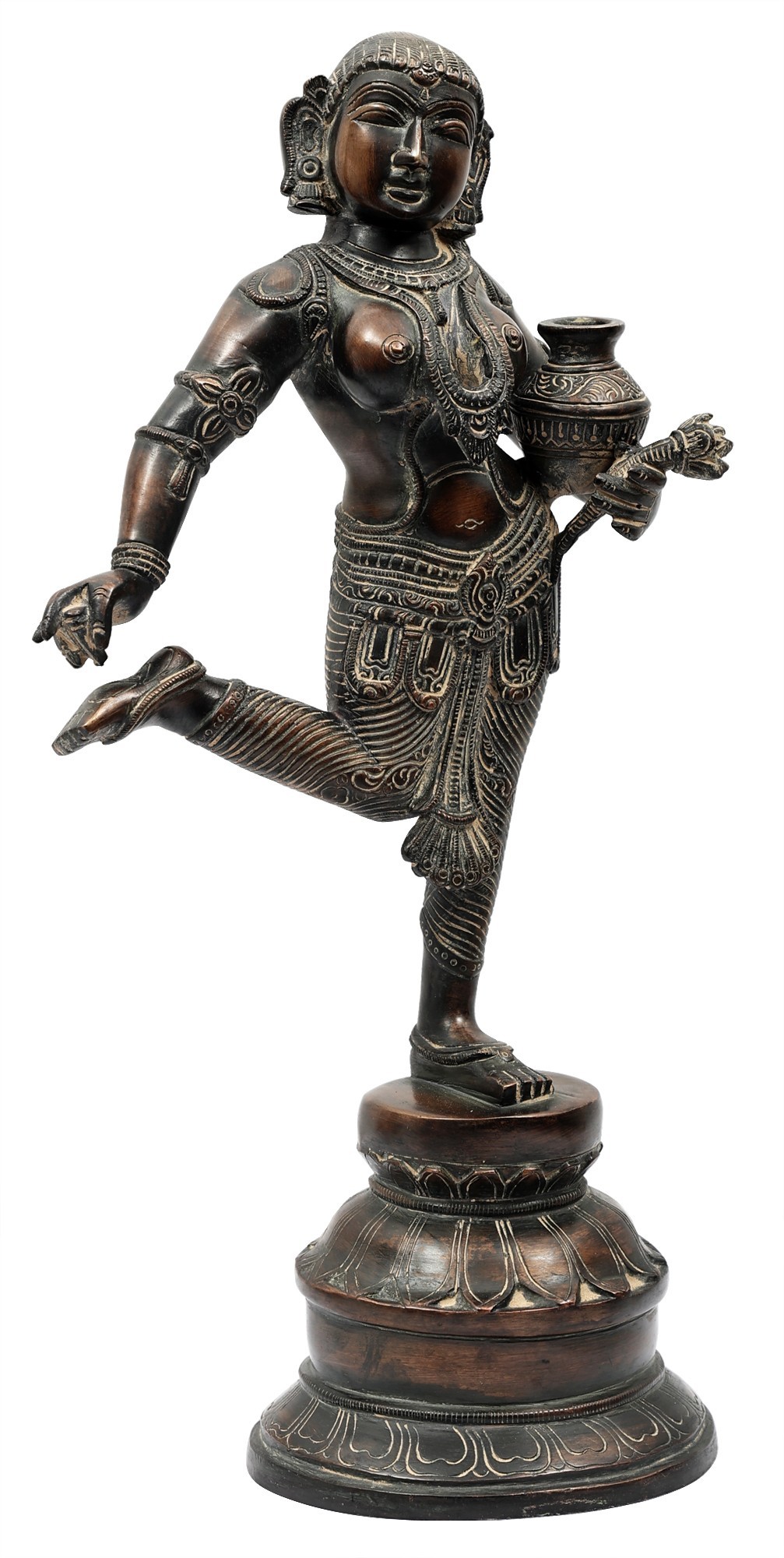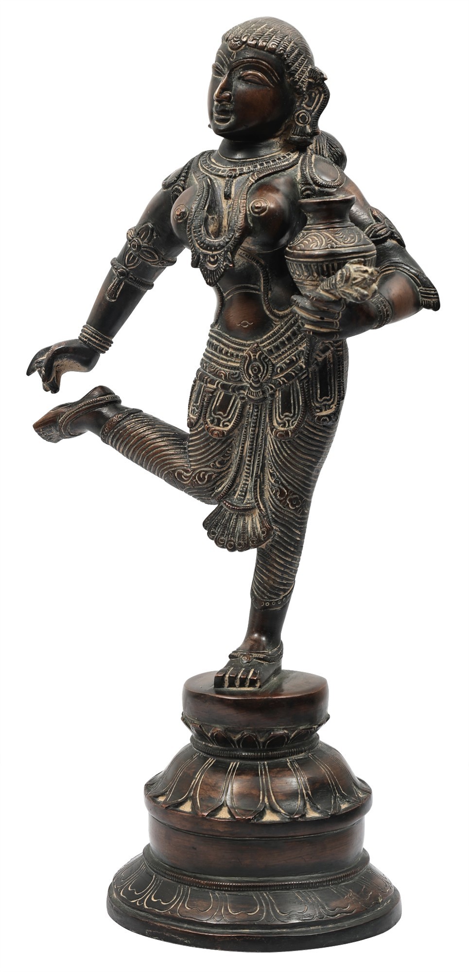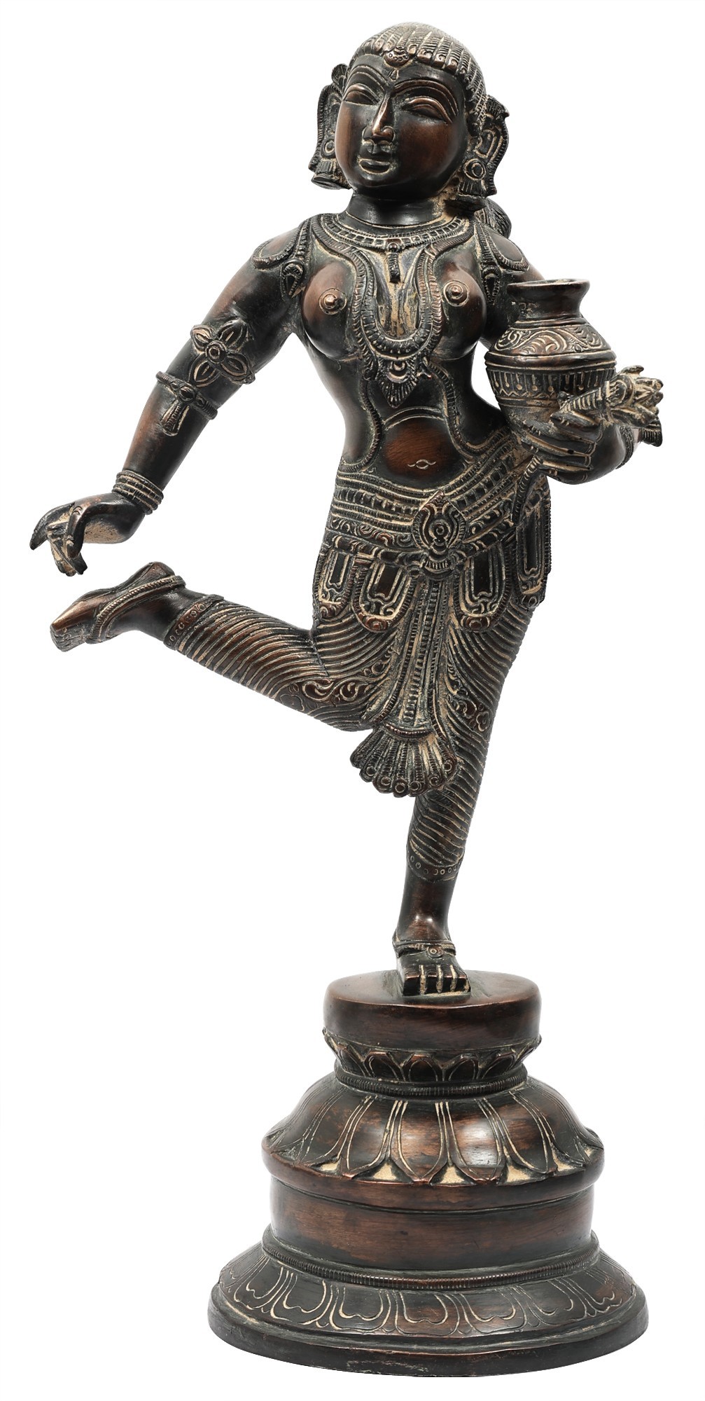 The composure of countenance is one of innocence and wistfulness. The delicate language of her body suits the gracious lines and proportions of her figure. The apsara is dressed in a tightly wound dhoti of silk and adornments that convey the glamour of Indraloka. She stands on a perfectly symmetrical plinth, the alternate tiers of which are engraved with elongated lotus petals.