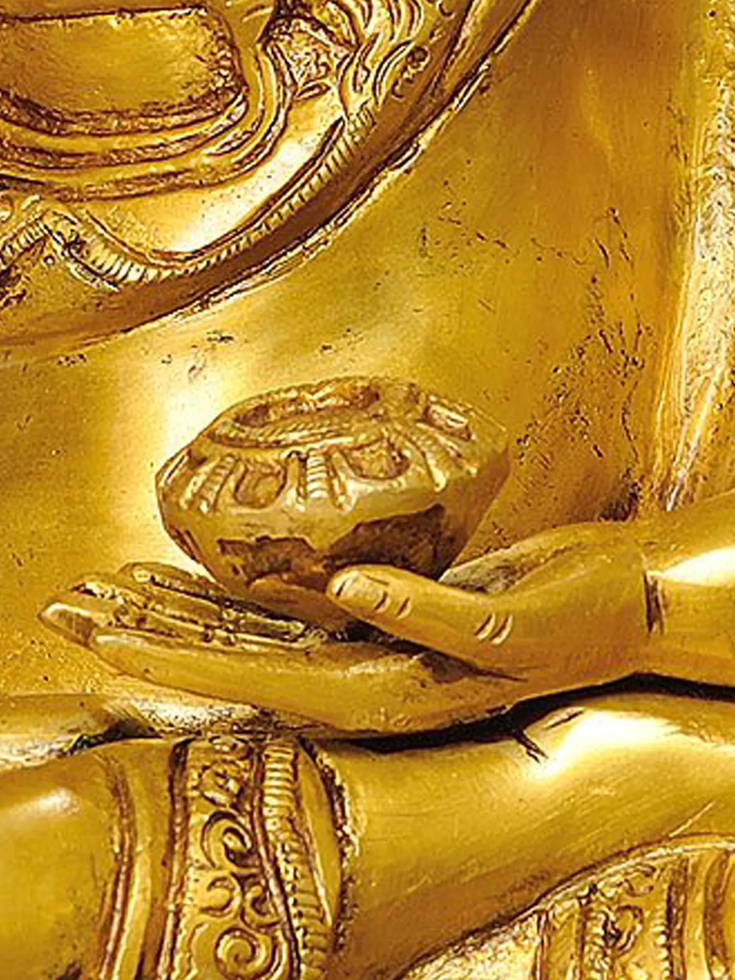 This magnificent brass sculpture captures the serene and powerful Bhumisparsha Mudra, a gesture deeply significant in Buddhist iconography. The Bhumisparsha Mudra, also known as the "Earth-touching" gesture, is the pose Lord Buddha assumed as he attained enlightenment. In this pose, his right hand dangles down, fingers lightly touching the earth. This symbolizes his victory over Mara, the demon who tempted him with worldly pleasures and tried to disrupt his meditation. With his hand touching the ground, Buddha is said to have summoned the Earth goddess, Sthavara, as his witness to his right to attain enlightenment and to his past good deeds. This exquisite statue, cast in lustrous brass, is a testament to the profound spiritual journey of the Buddha.