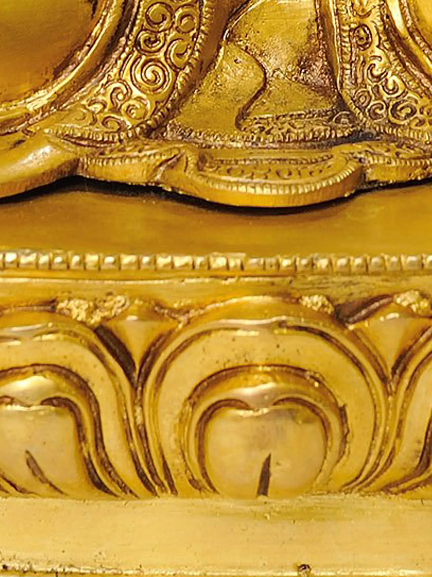 Handmade in India, this 16-inch statue is a masterpiece of traditional craftsmanship. The artisans have poured their skill and devotion into every detail, from the gentle curve of the Buddha's serene smile to the intricate folds of his monastic robes. The brass material, polished to a radiant sheen, not only lends a sense of timeless elegance but also symbolizes purity and auspiciousness. The lotus pedestal, a recurring motif in Buddhist art, represents purity, spiritual awakening, and the unfolding of consciousness. This sculpture is more than just an object of beauty; it is a conduit to spiritual reflection, embodying the principles of peace, compassion, and enlightenment that Lord Buddha taught.