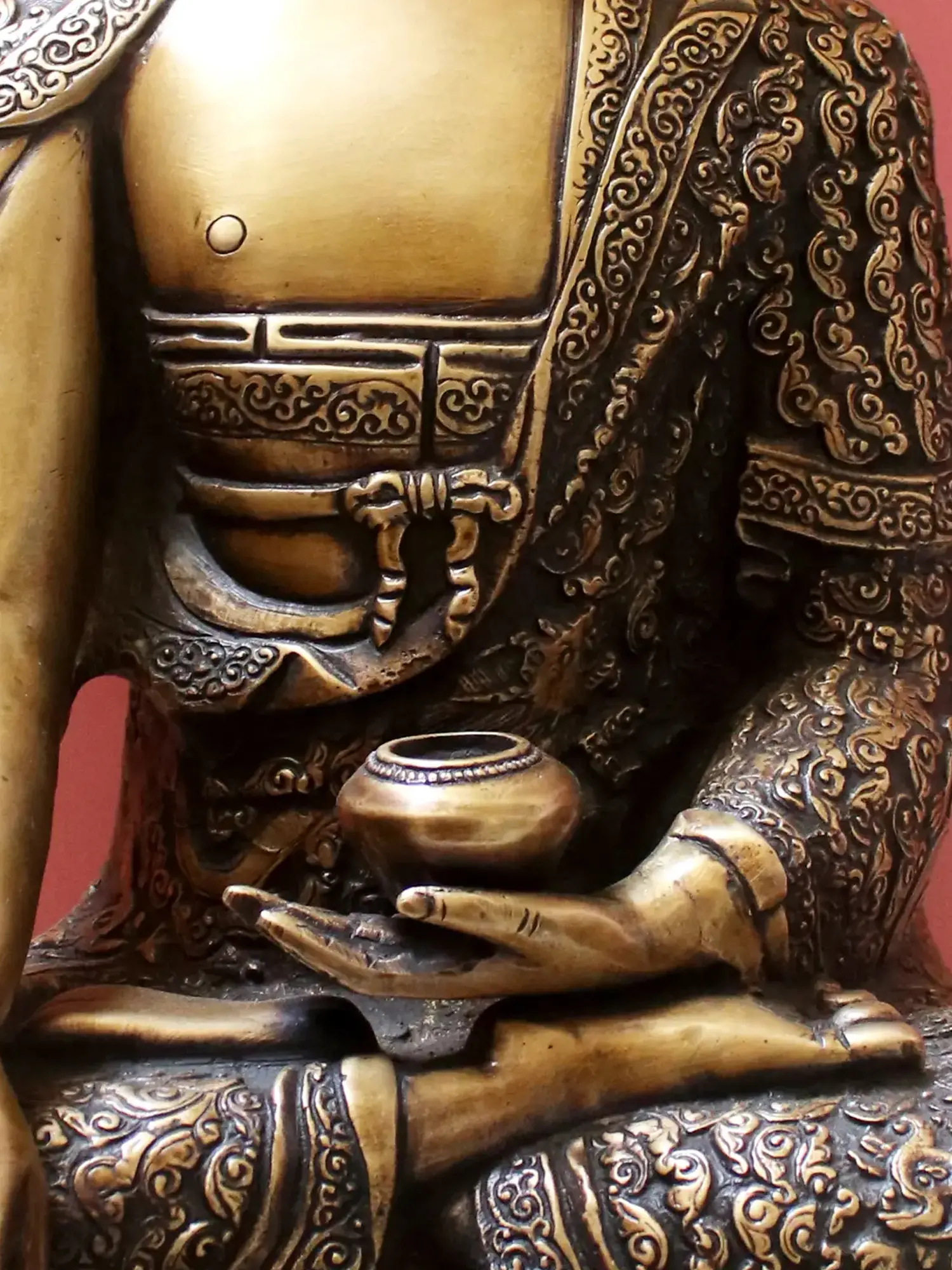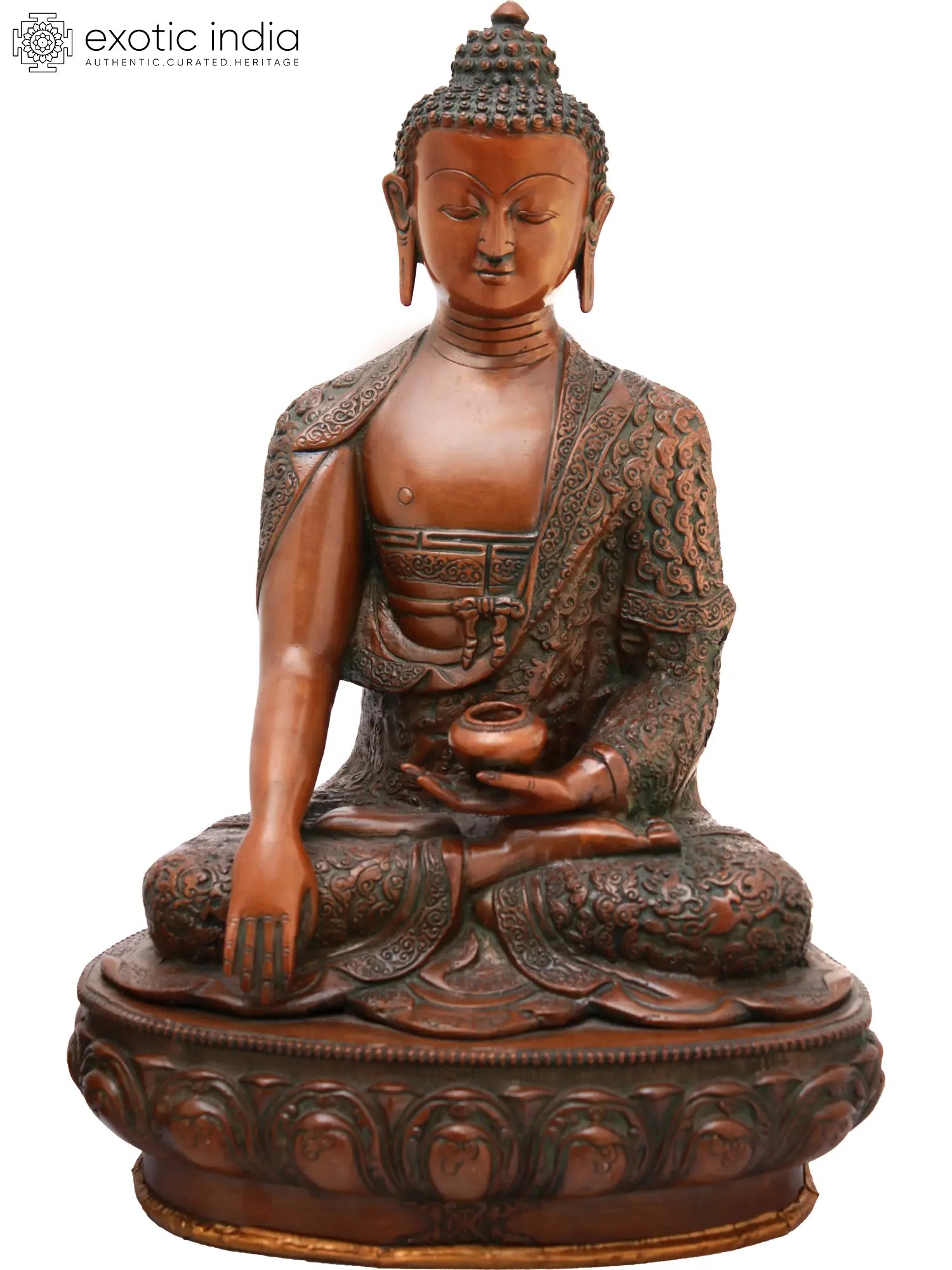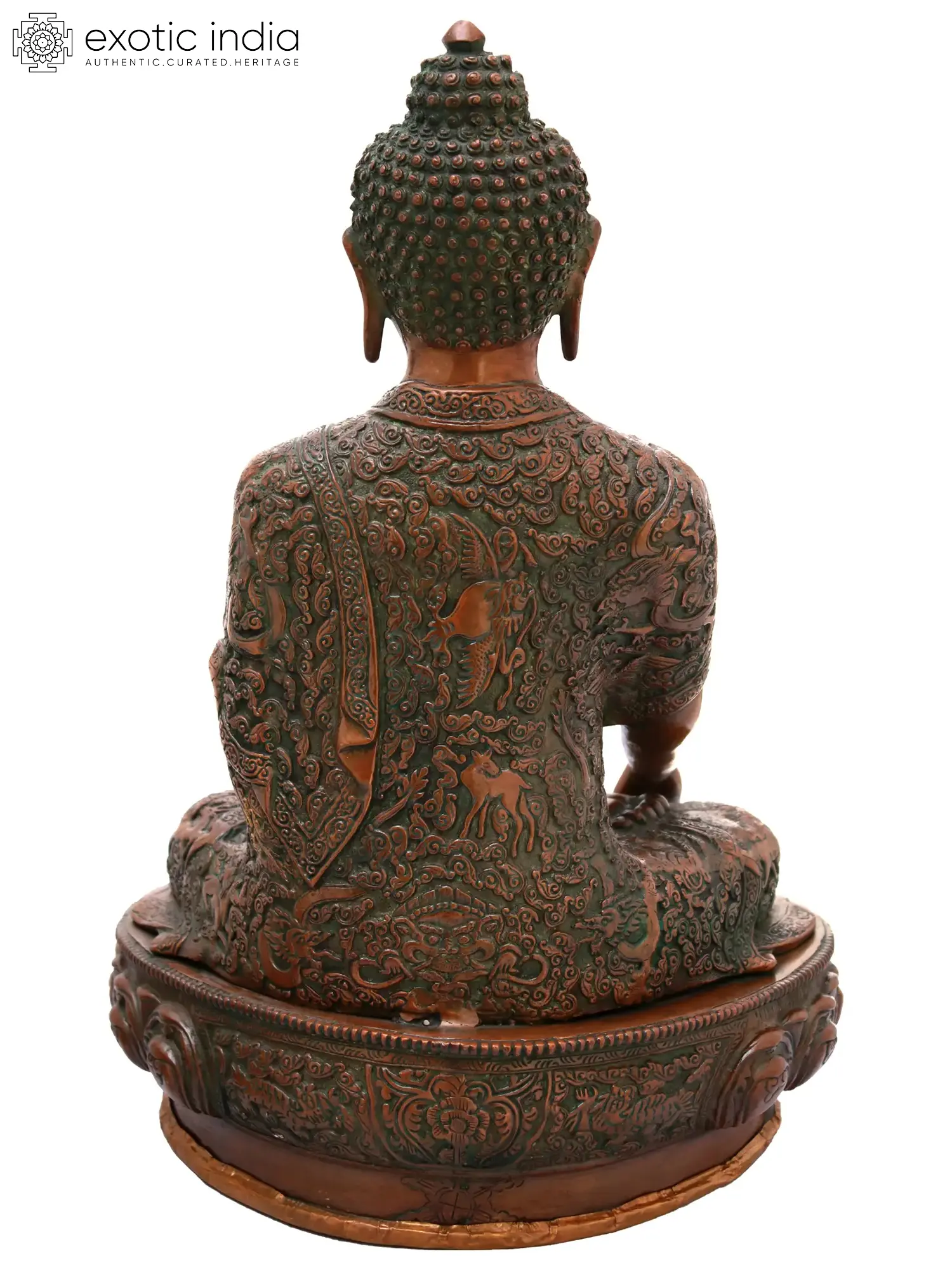 16" Lord Buddha in Bhumisparsha Mudra with Pindapatra (Robes Decorated with Chinese Auspicious Symbols, Dragons, Deer and Garuda) In Brass | Handmade | Made In India