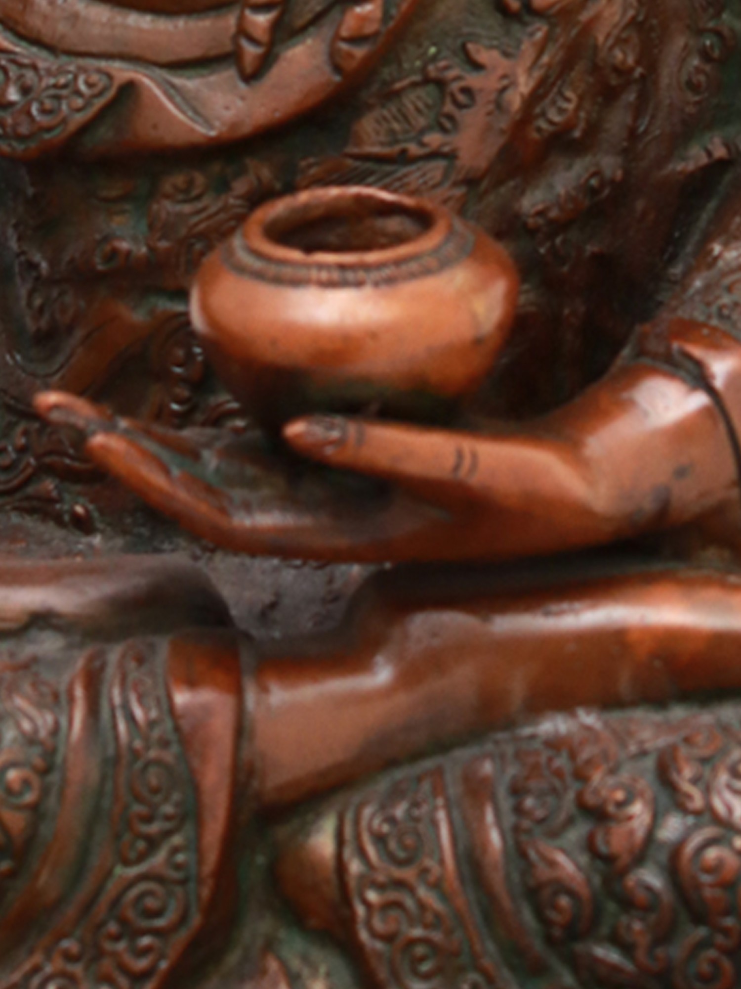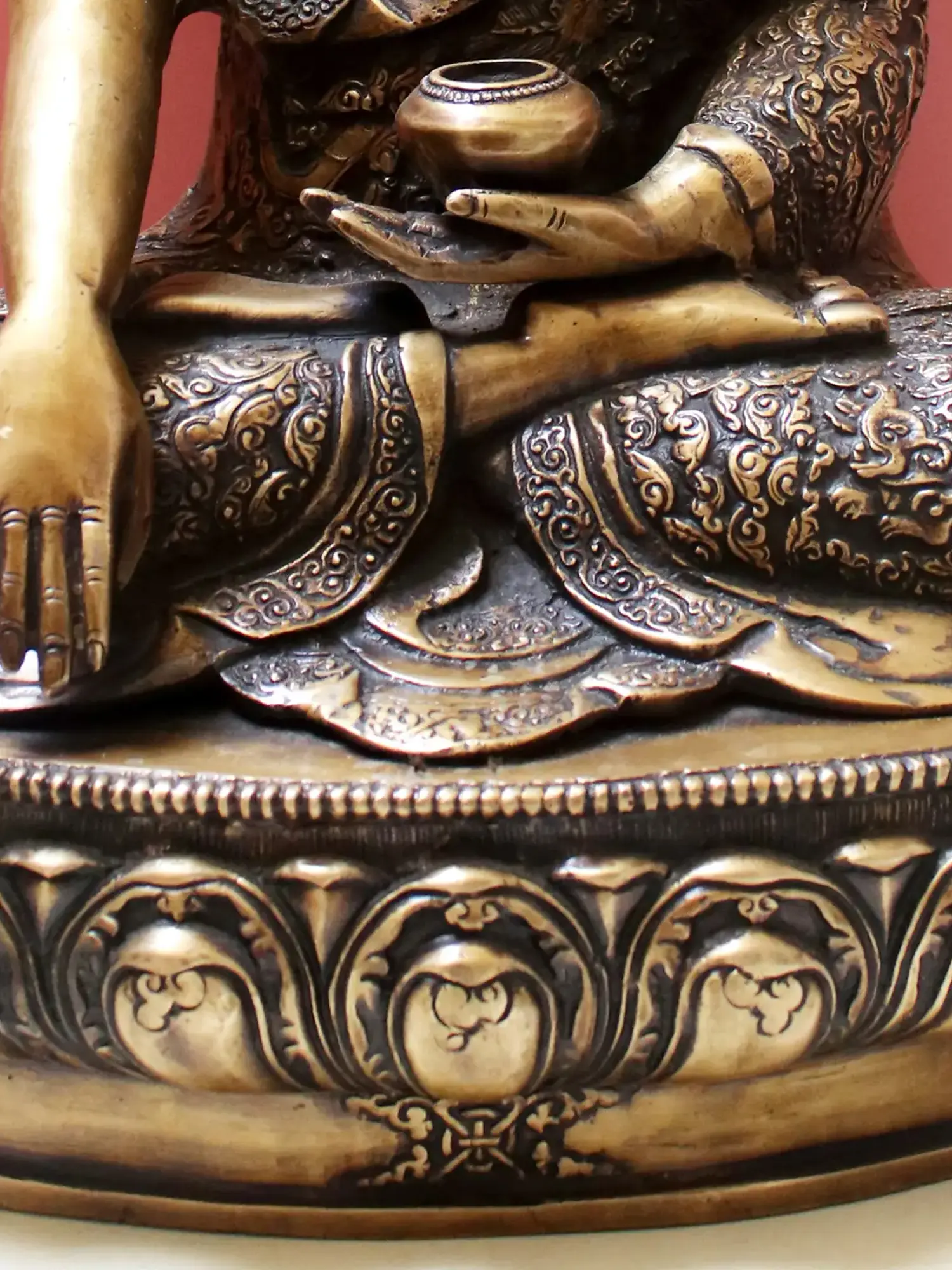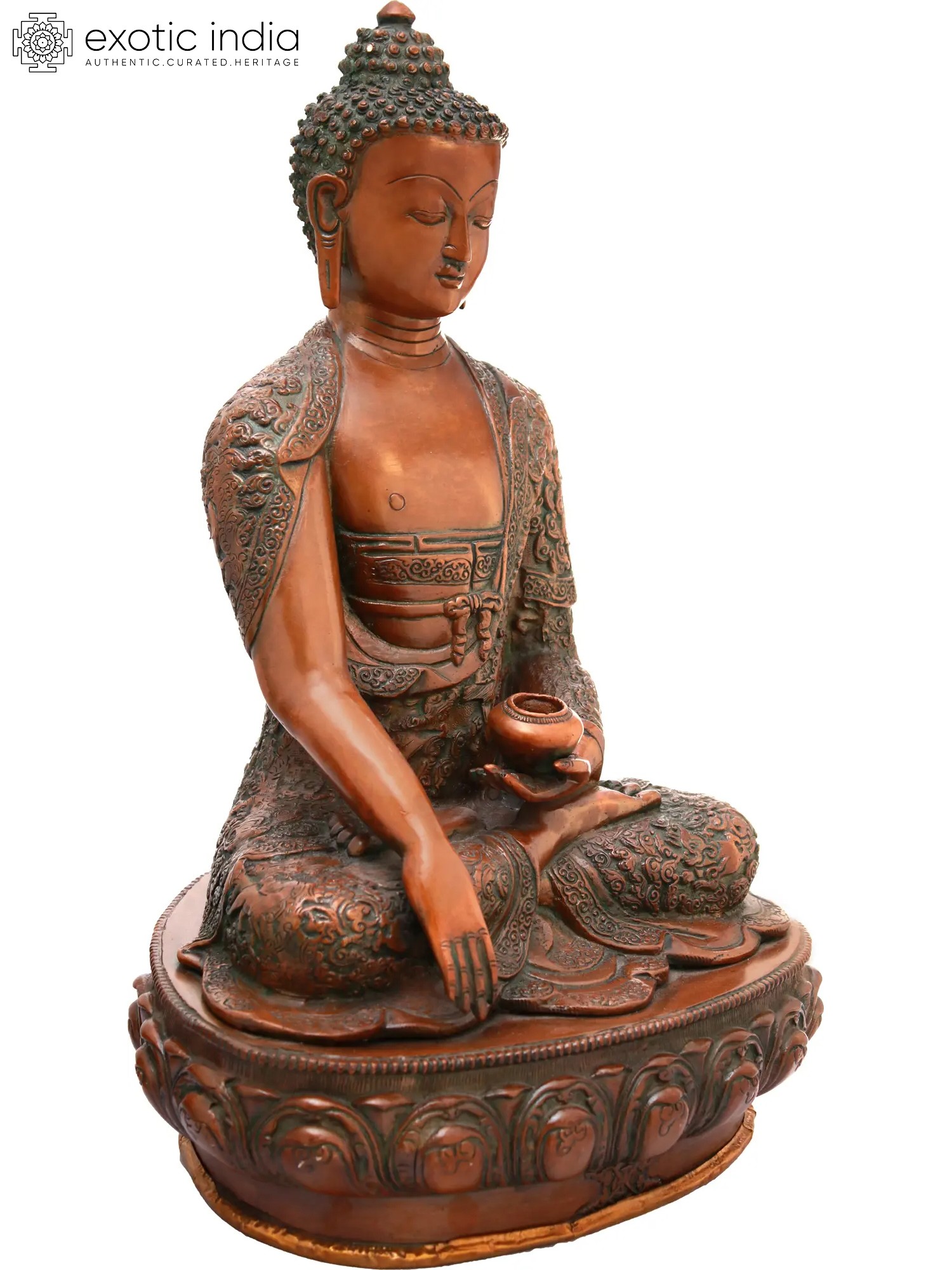 16" Lord Buddha in Bhumisparsha Mudra with Pindapatra (Robes Decorated with Chinese Auspicious Symbols, Dragons, Deer and Garuda) In Brass | Handmade | Made In India