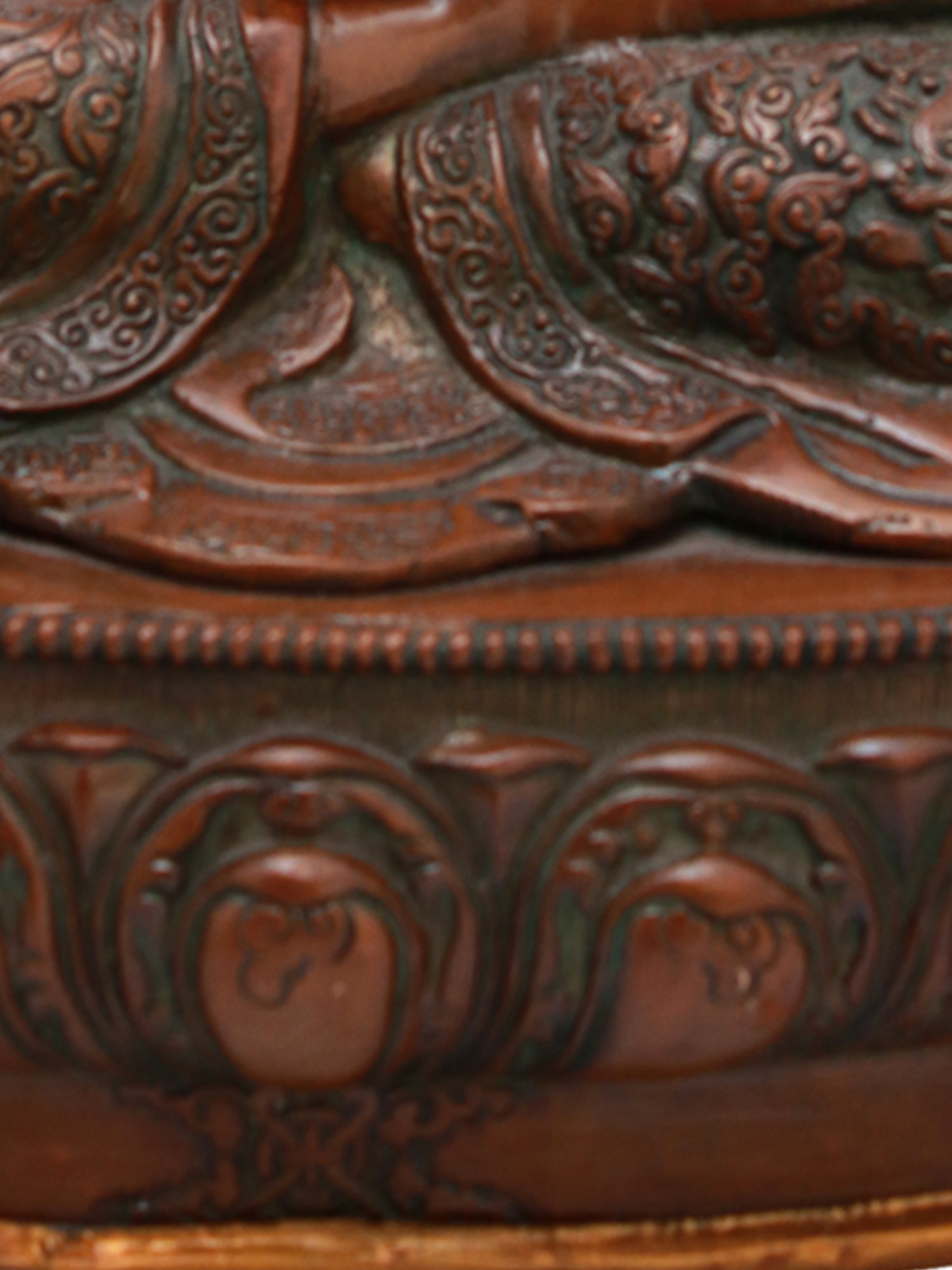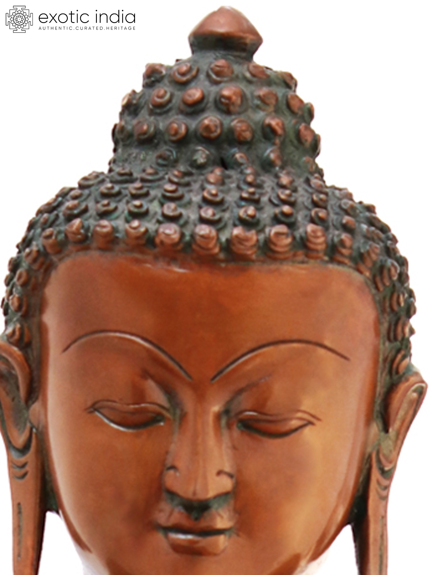 This magnificent brass sculpture captures Lord Buddha in the profound Bhumisparsha Mudra, the "Earth-Touching" gesture. It is said that it was in this very posture that Siddhartha Gautama achieved enlightenment under the Bodhi tree, facing down the temptations of Mara, the demon king, by calling the Earth as his witness. The right hand, extended and resting on the right knee with fingertips pointing downwards, signifies steadfastness and the act of overcoming all worldly distractions and negative forces. The left hand rests in his lap, palm upwards, symbolizing meditation and spiritual awareness.