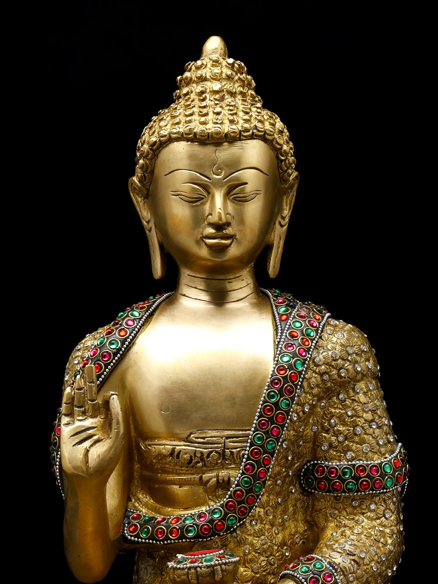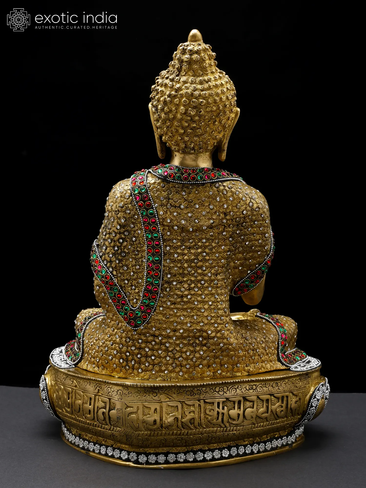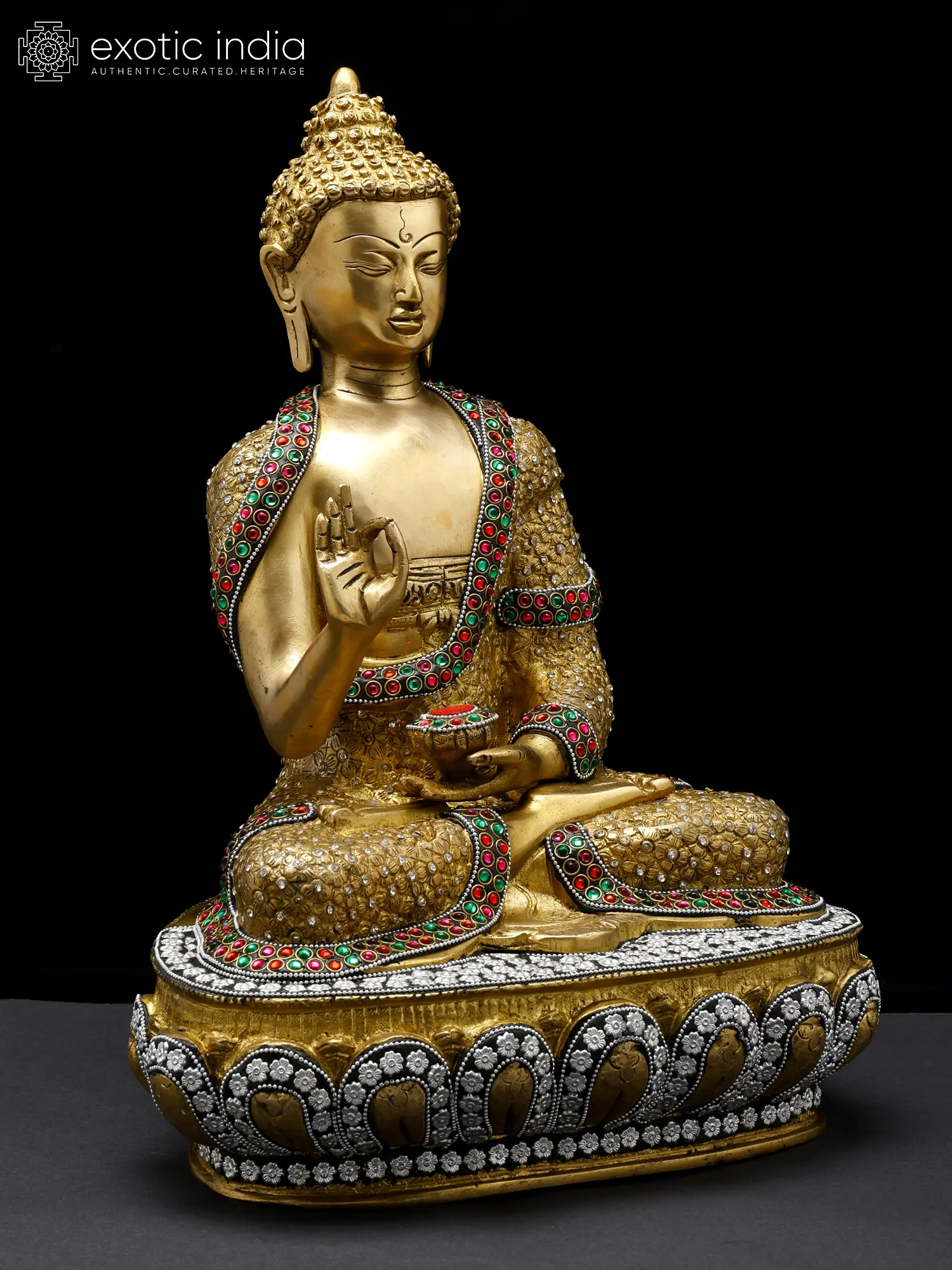 The lustre of this brass sculpture is symbolic of the timelessness of the Buddha's teachings. His countenance radiates peace and the mudra of his hand means a blessing to all who listen. The glittering inlay in this one-of-a-kind Buddha from the Exotic India collection is so alluring, that no follower of the Buddha could resist buying this.