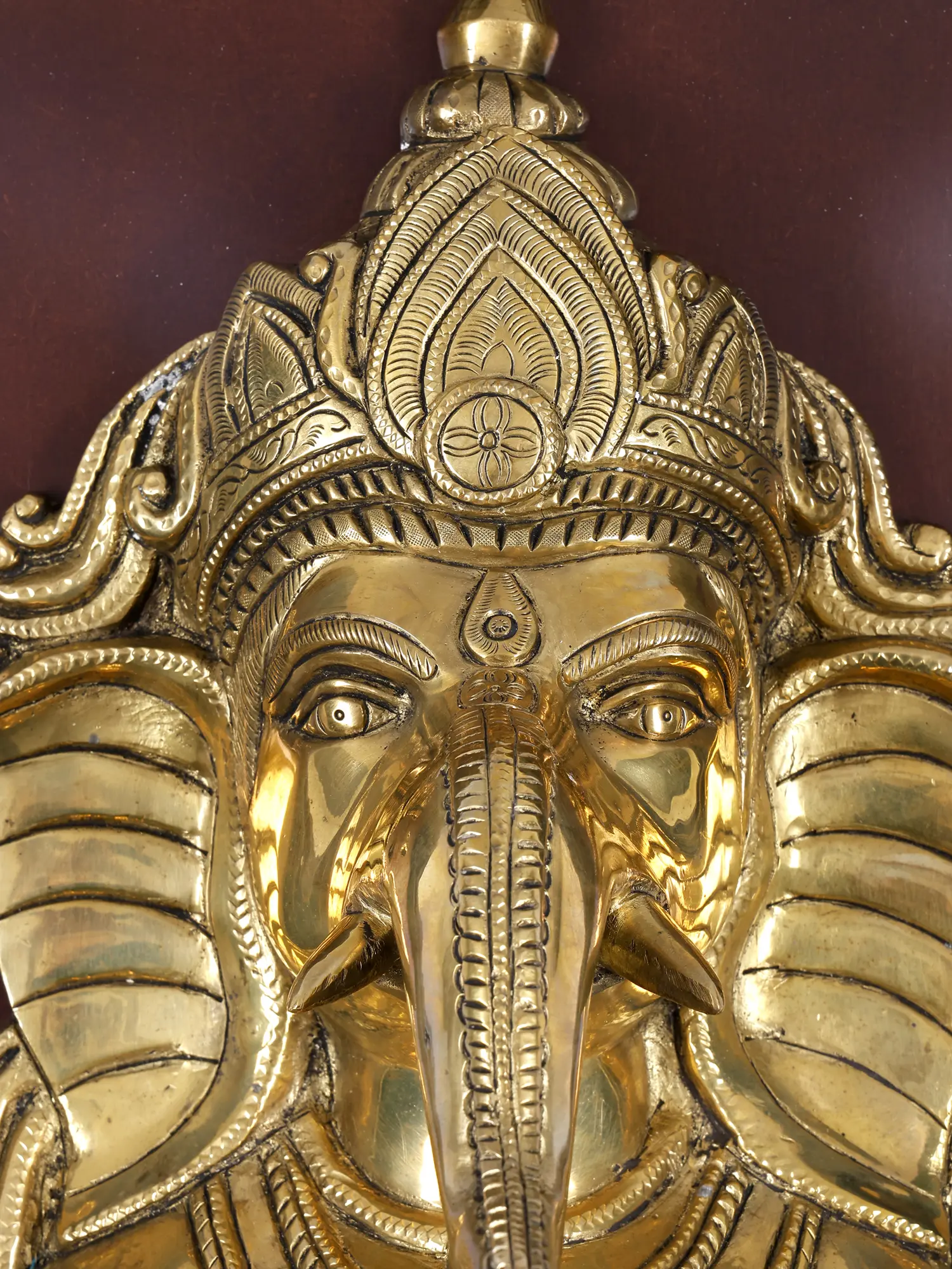 The finely detailed brass mask portrays Ganesha’s calm yet powerful expression, as if emerging through the polished wooden frame, stepping into the ambiance to bless it with his divine presence.