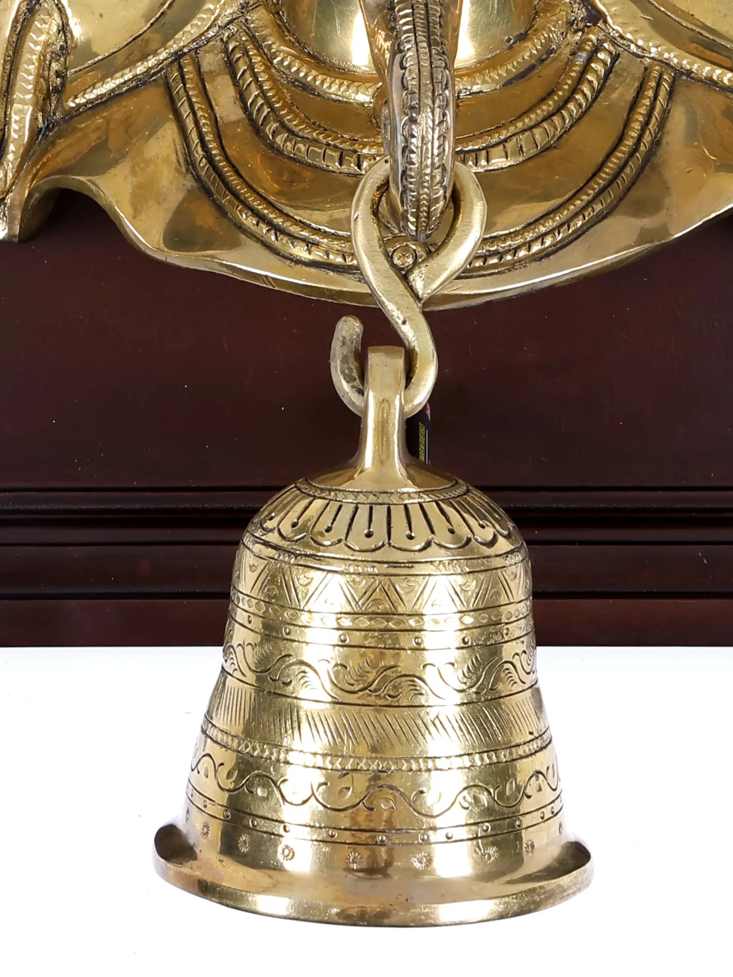 Lord Ganesha is depicted in all his glory, holding the auspicious ghanti (bell) in his trunk, symbolizing the invitation of good fortune and the dispelling of negativity.