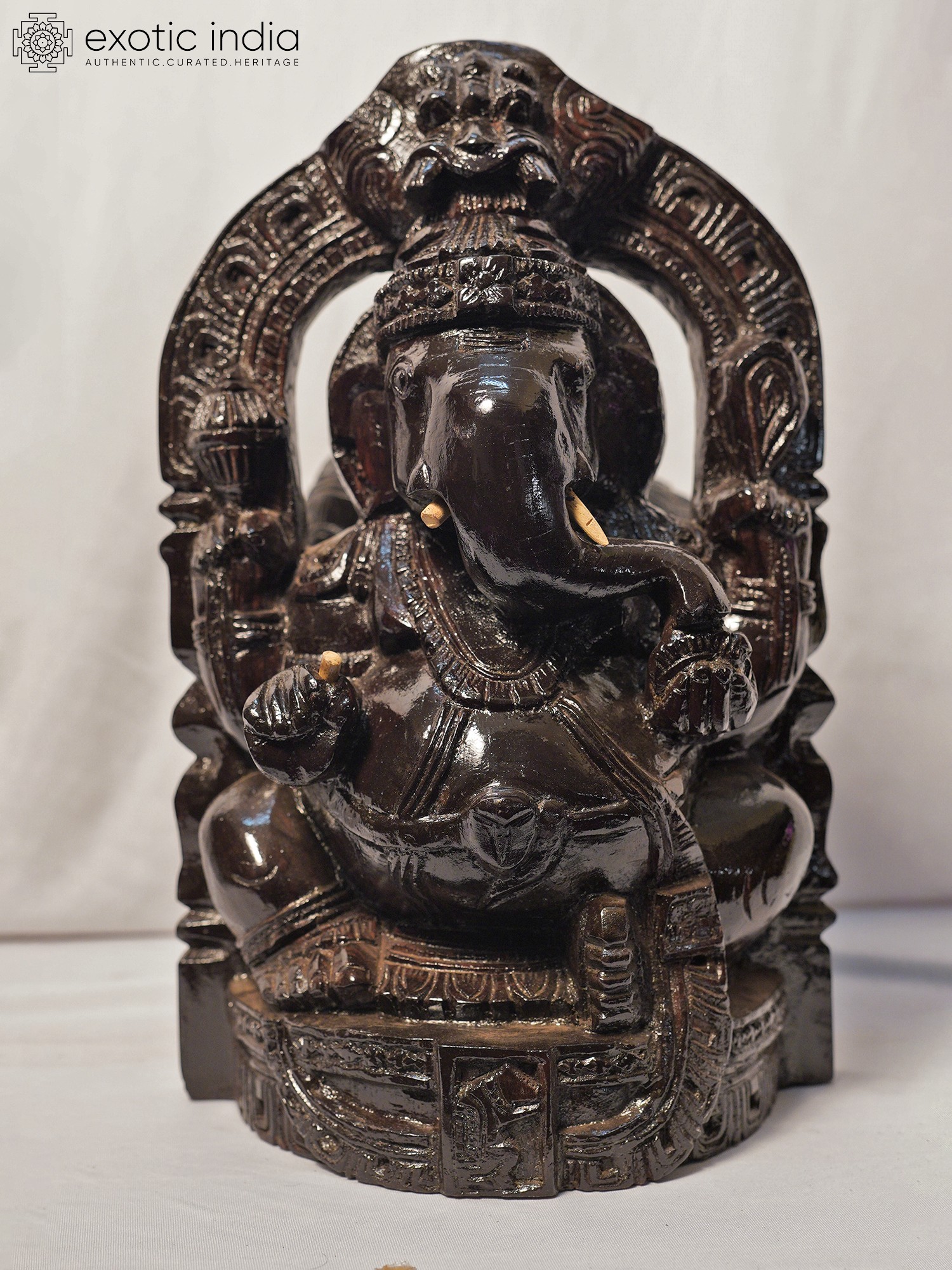This piece is a testament to the skill and dedication of master artisans. Meticulously carved from rich rosewood, the sculpture showcases the exquisite details that bring Ganesha to life. The smooth, polished surface highlights the natural beauty of the wood grain, adding depth and character to the artwork. From the folds of Ganesha’s robes to the intricate carvings on the Kirtimukha throne, every element is crafted with precision and care. The sculpture is a tangible representation of cultural heritage, a piece that connects you to centuries of artistic tradition and spiritual significance. Each curve and contour is a testament to the artisan's mastery, transforming a simple block of wood into a sacred object of devotion and beauty. The choice of rosewood, known for its durability and rich color, ensures that this piece will be a cherished heirloom for generations to come.