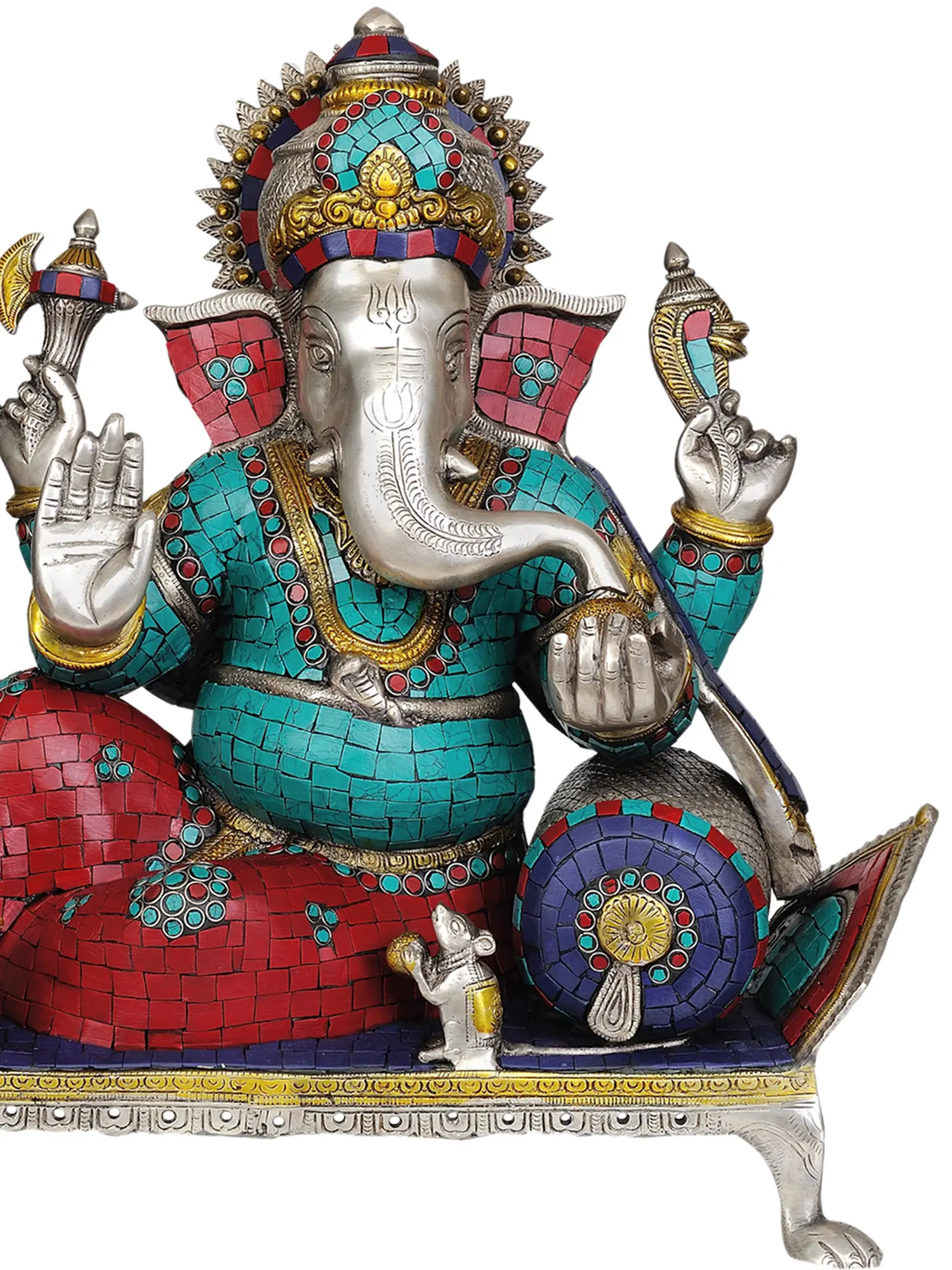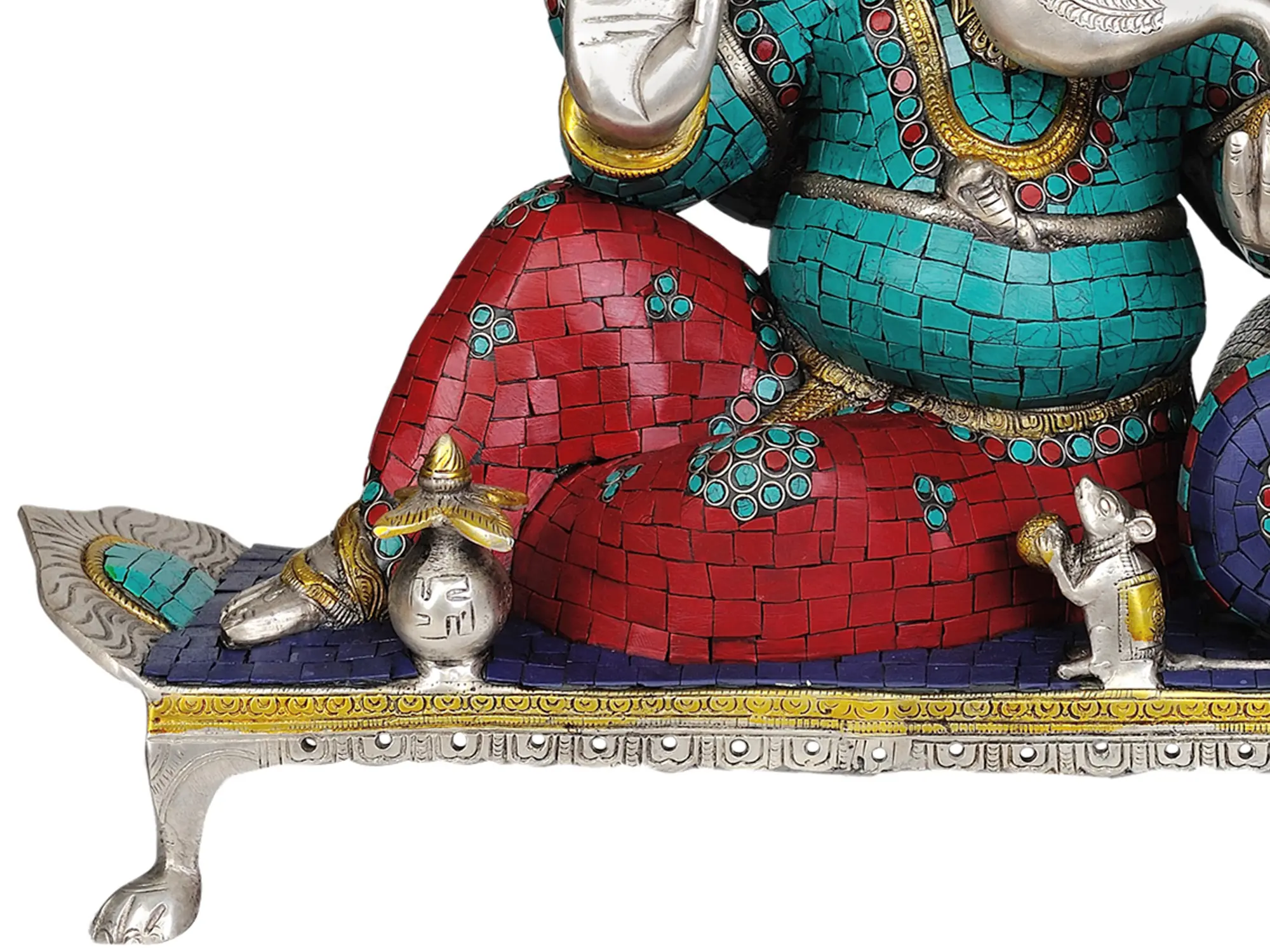 The artistry invested in creating this piece is evident in every detail. The brass lends a warmth and depth to the depiction of Ganesha, while intricate inlay work provides visual texture and complexity. The mosaic effect, achieved through the placement of carefully chosen elements, offers a striking contrast against the smooth brass. Note the detailing of the ornaments and implements, each piece contributing to the overall impression of divine regality.