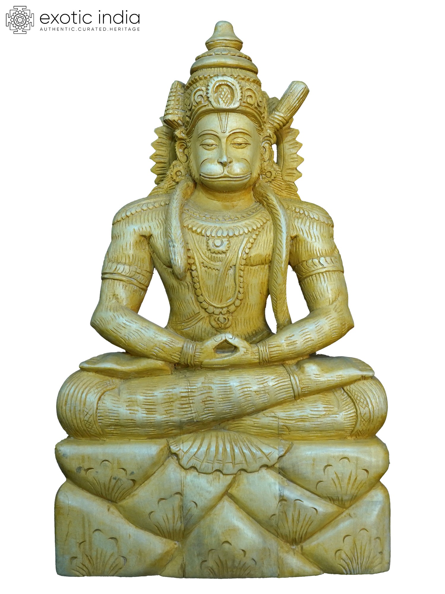 Seated in the serene Dhyana Mudra, this representation of Hanuman captures the essence of inner peace and contemplative focus. This yogic posture and hand gesture symbolizes profound meditation, concentration, and the attainment of spiritual perfection. Hanuman’s powerful energy is channeled inward, signifying his mastery over his senses and his ability to find stillness amidst chaos. The interlaced fingers, resting gently on the lap, represent the union of the individual soul with the universal consciousness. This mudra is often adopted during meditation to promote tranquility, focus, and deeper spiritual insight. The overall effect is one of grounded stability, focus and access to higher consciousness.